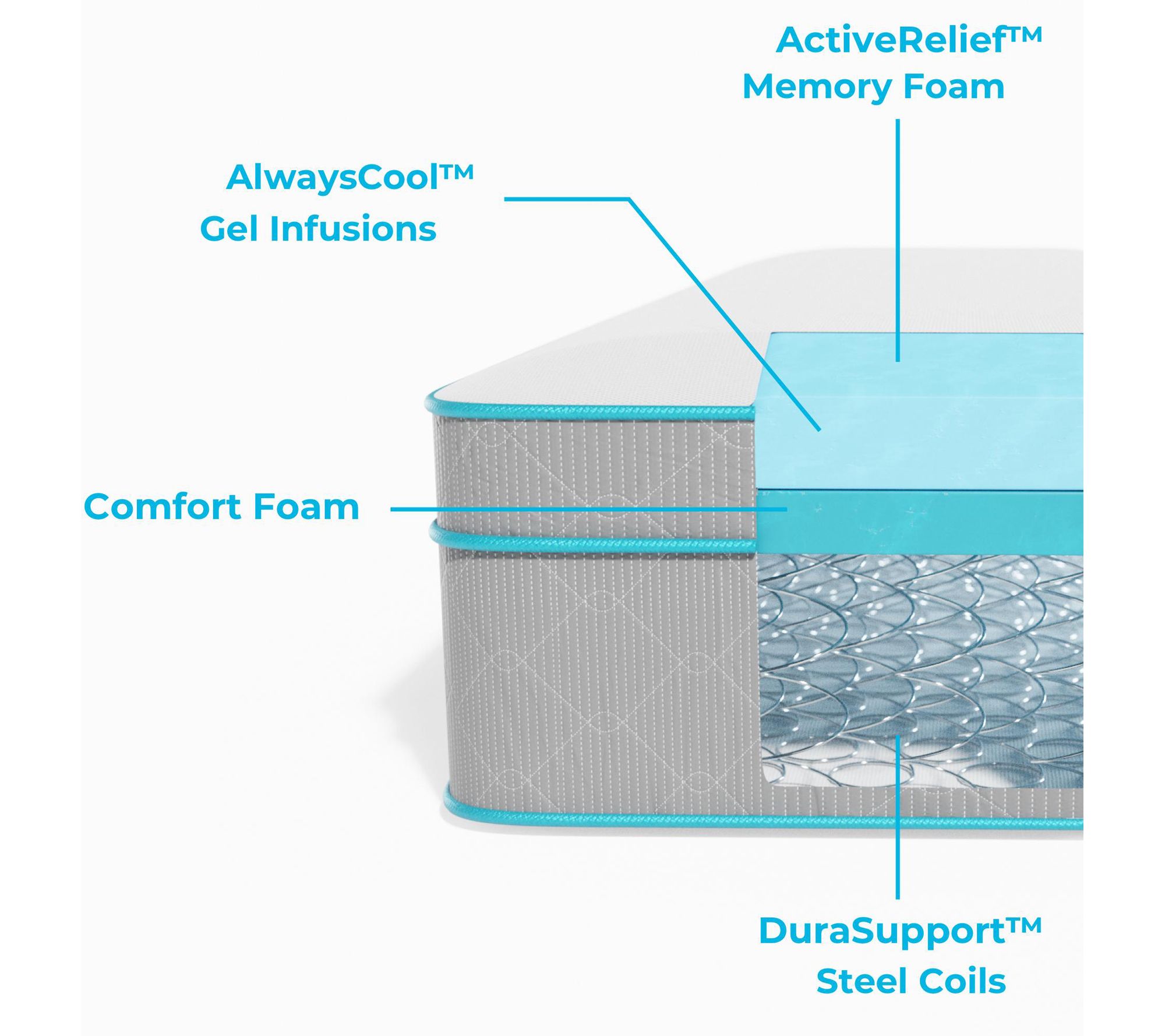 Five layer design with DuraSupport steel coil springs, ActiveRelief memory foam layer, polyurethane foam layers, and AlwaysCool gel infusion