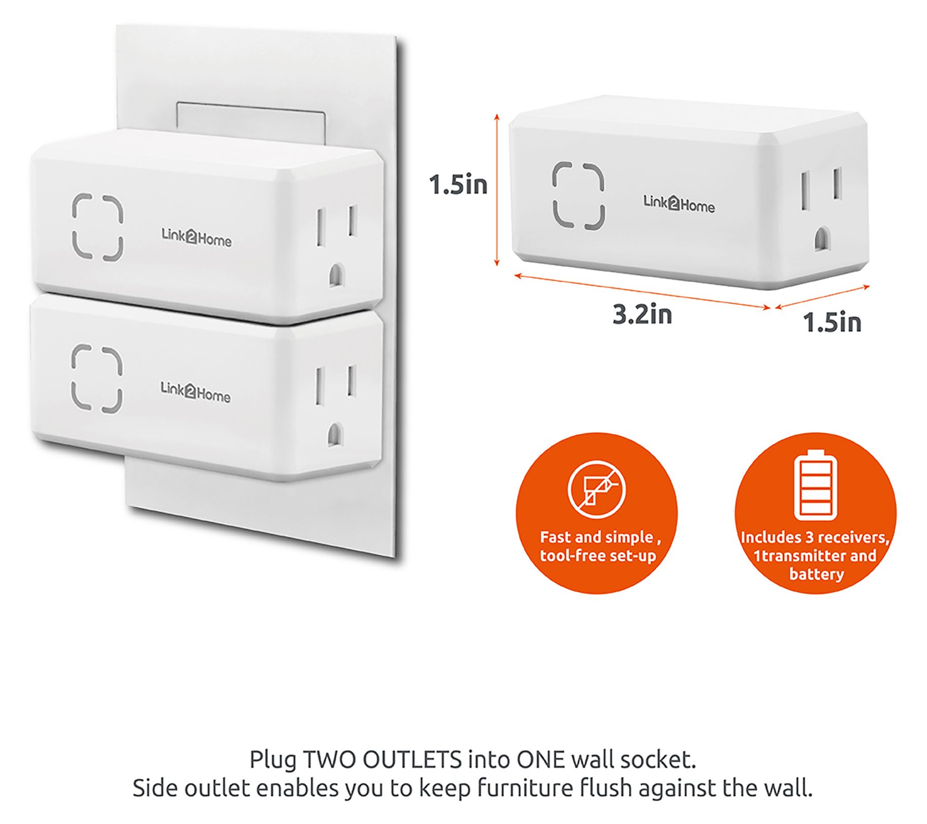 Control hard-to-reach appliances, holiday decor, and more at the push of a button with this set of three remote control outlet switches. The compact and side outlet design allows for furniture to sit flush against the wall, while the 100' range works through walls and doors without interfering with other electronics. A countdown timer and remote control add extra convenience. From Link2Home.
