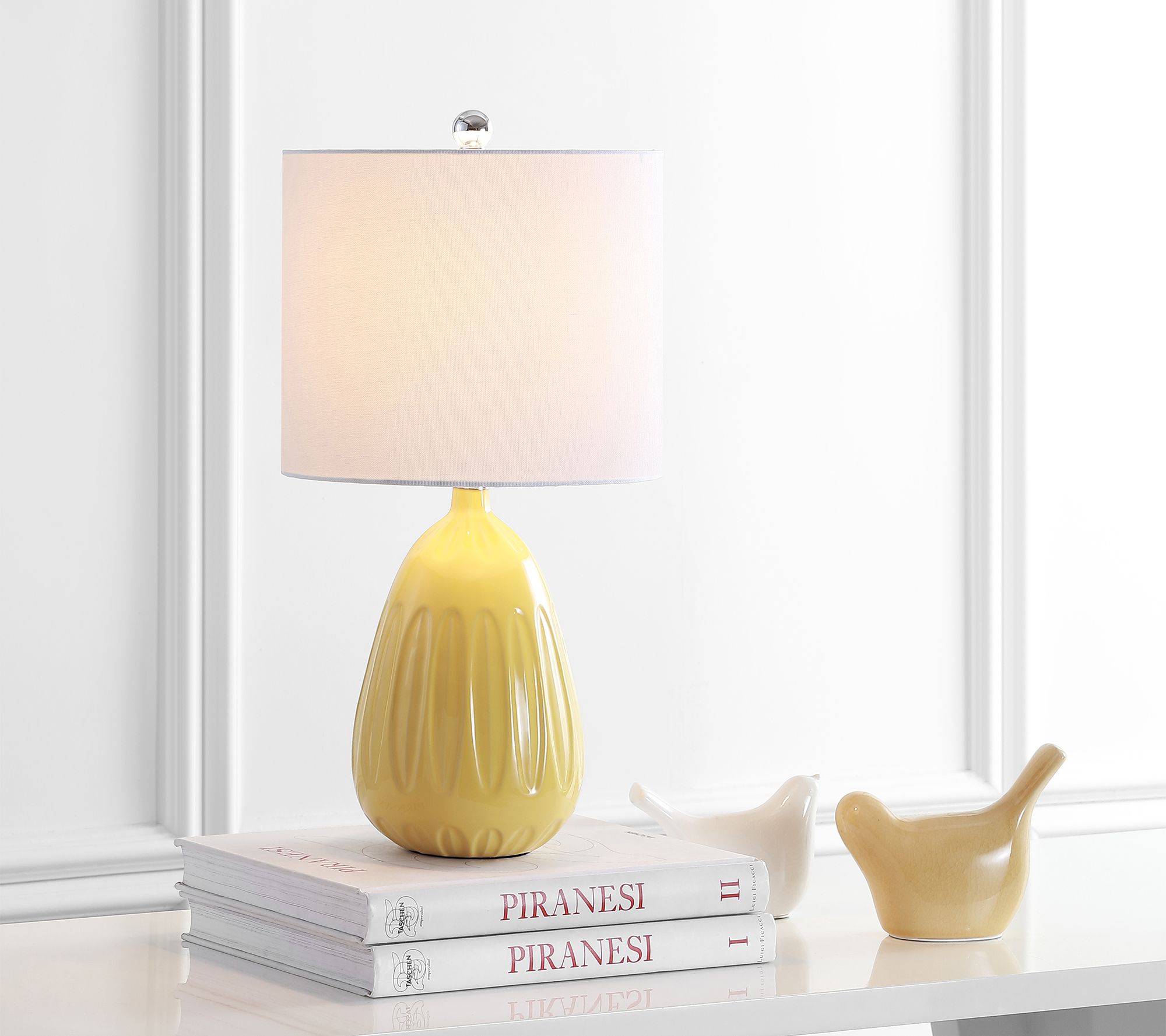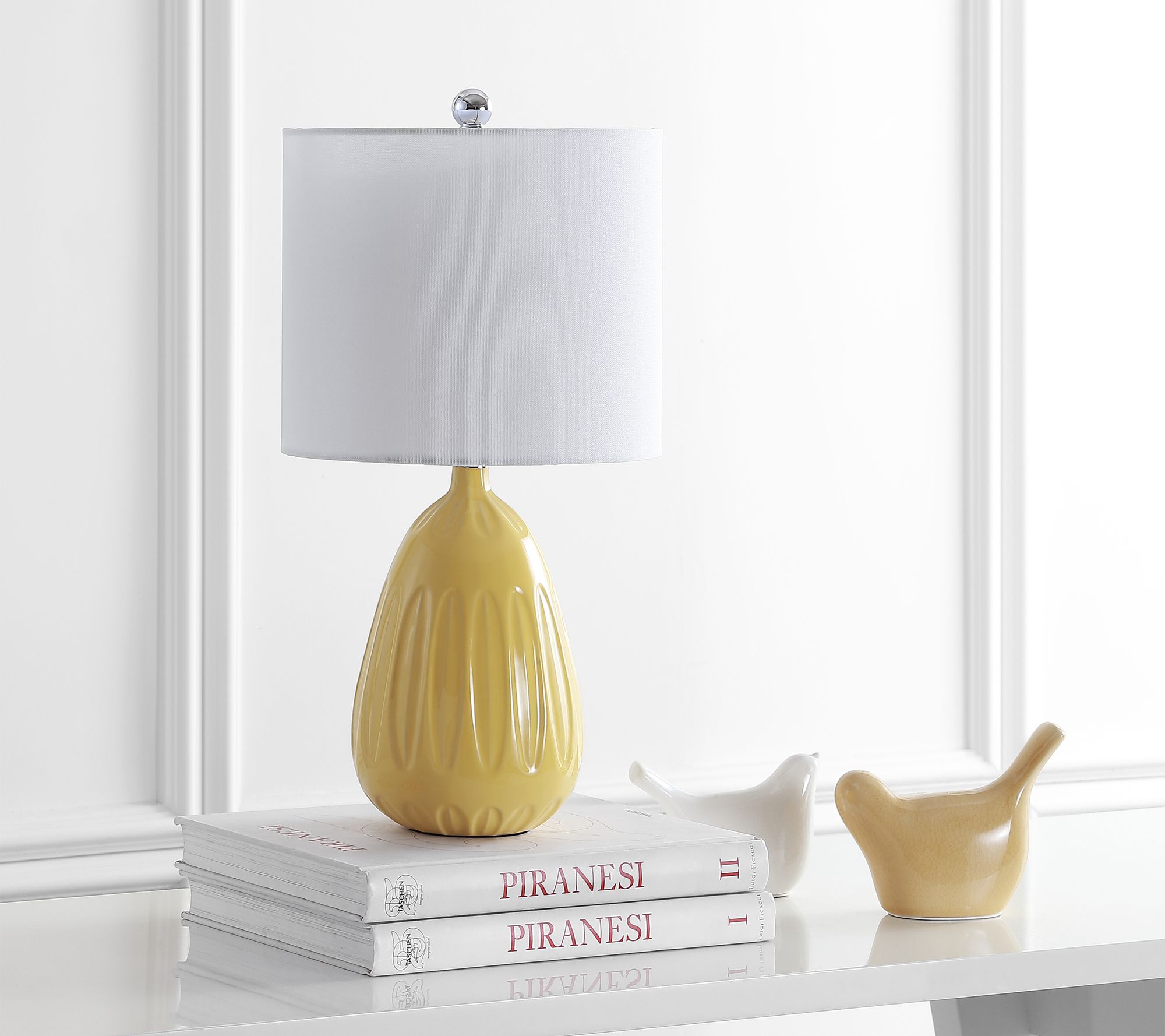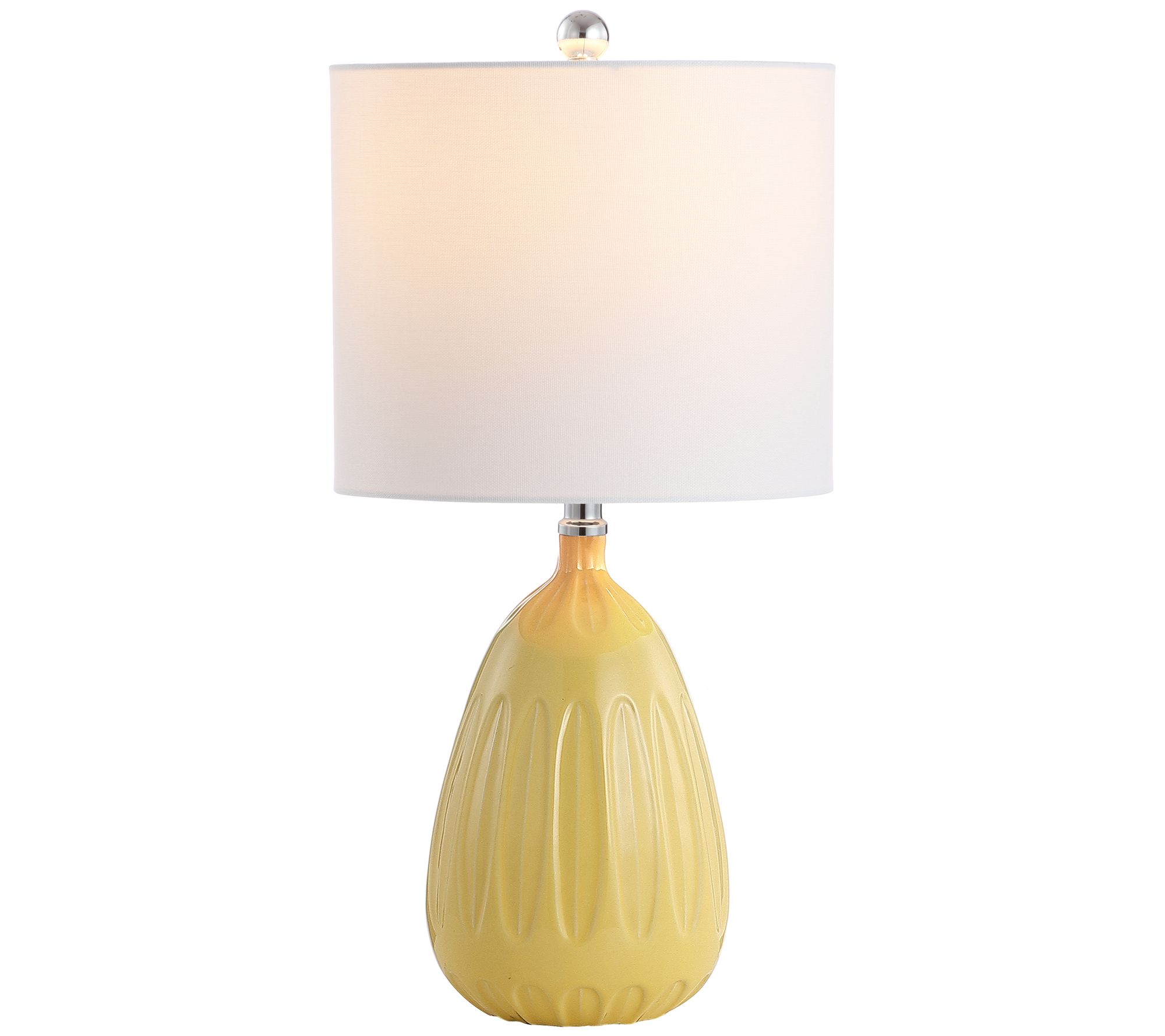 Let there be light! Bring soft illumination and sleek sophistication to your space with this modern table lamp featuring a sunny-hued ceramic base and fabric shade. From Safavieh.