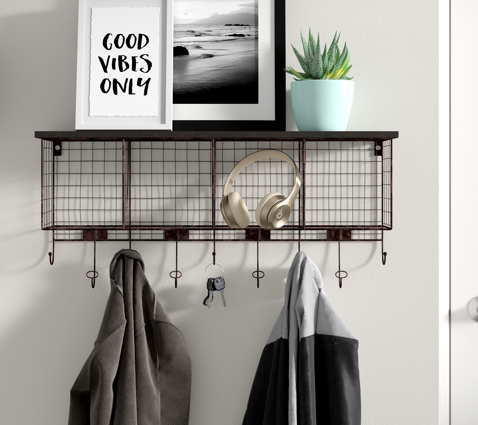 Transform your space with the Cameron four-cubby wall shelf with hooks, a perfect blend of style and functionality. This unit offers a smart storage solution without taking up precious floor space, featuring four grid-style metal cubbies and nine hooks for coats and bags. The distressed black top adds a touch of elegance, making it ideal for an entryway, office, or bedroom. From Linon Home Decor.