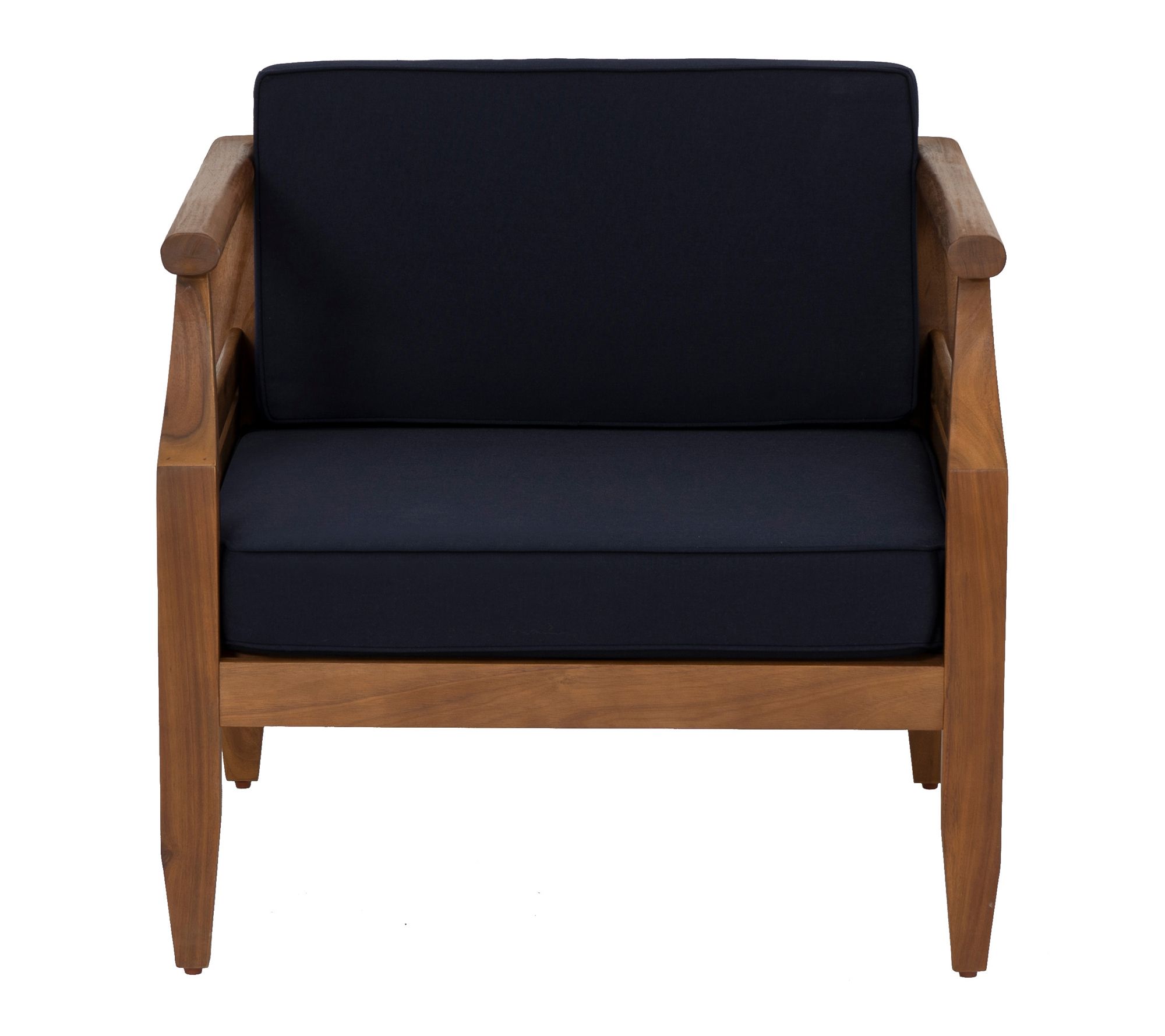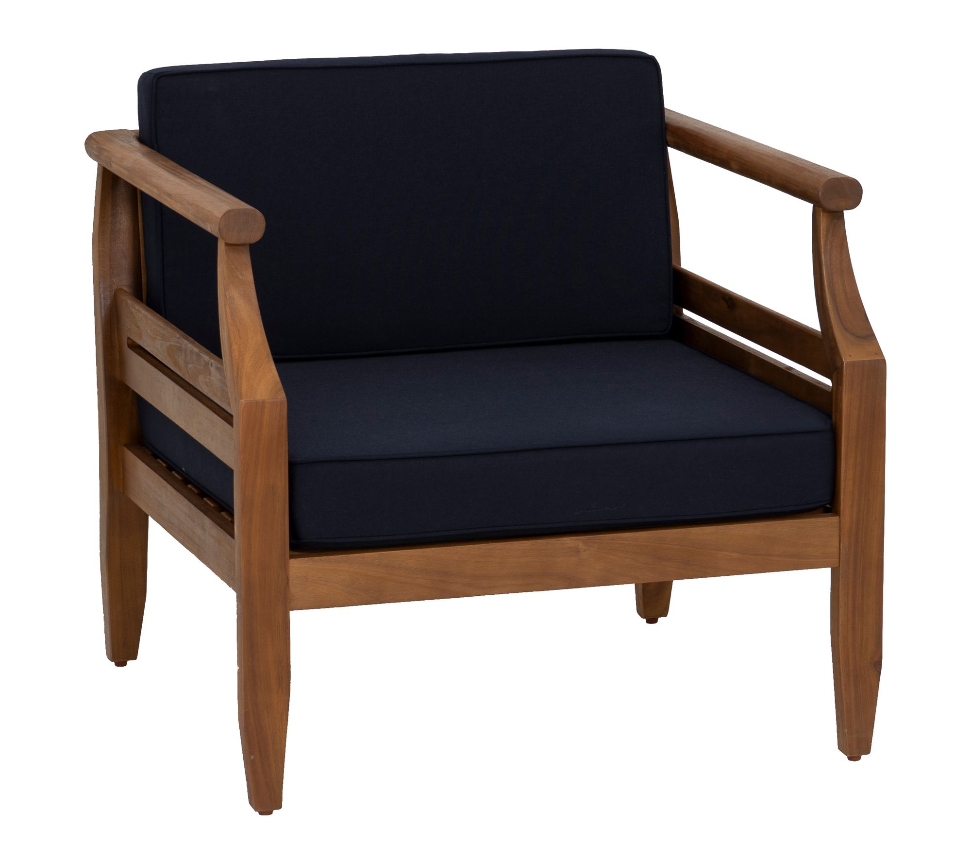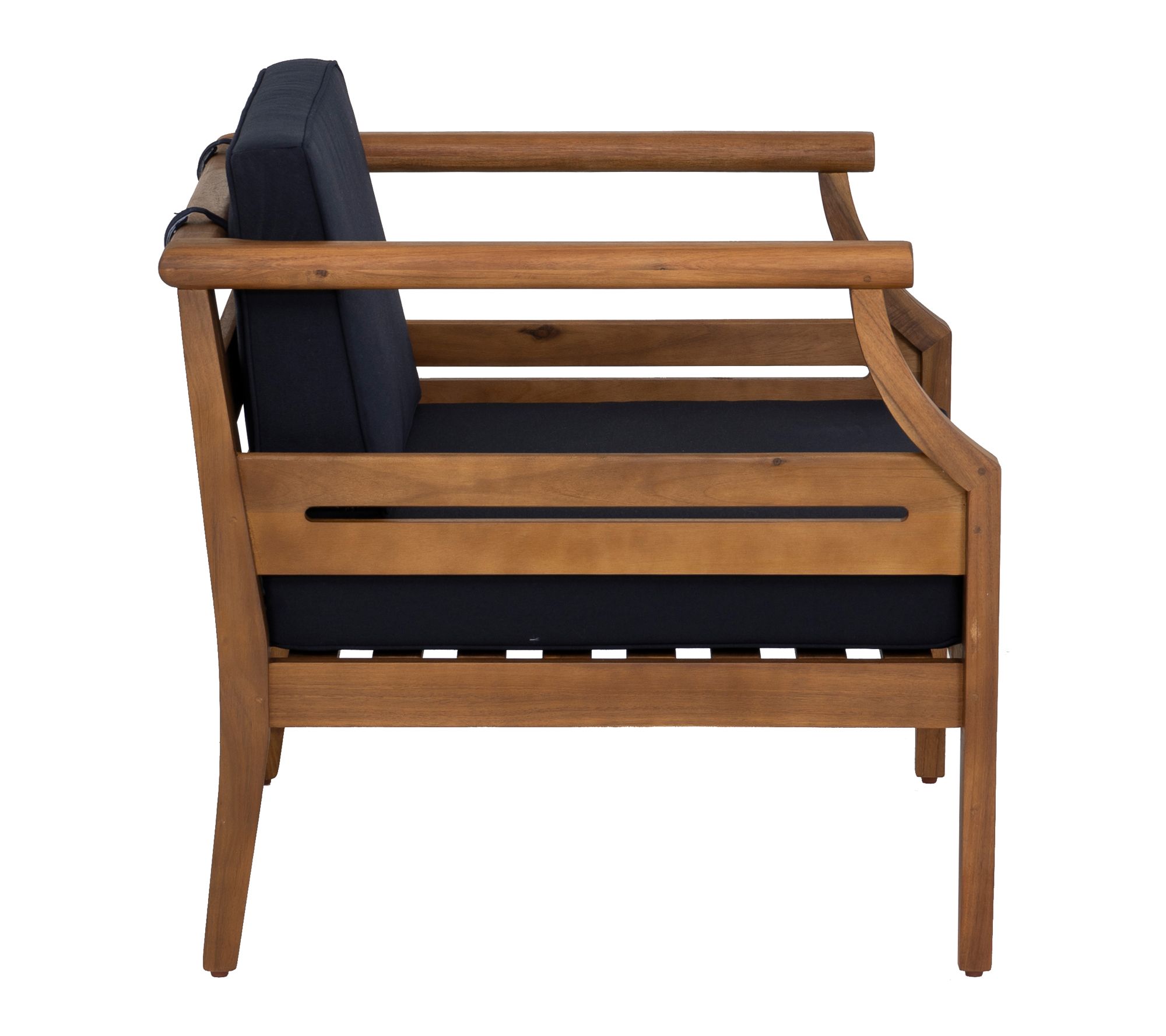 Transform your patio or balcony into a welcoming retreat with this outdoor club chair. The acacia wood frame, bathed in a rich brown oil stain, pairs effortlessly with navy woven olefin cushions for laid-back comfort and bold style. Relax into the curved armrests and generous seat, perfect for sipping coffee at sunrise or unwinding after a long day. From Linon Home.