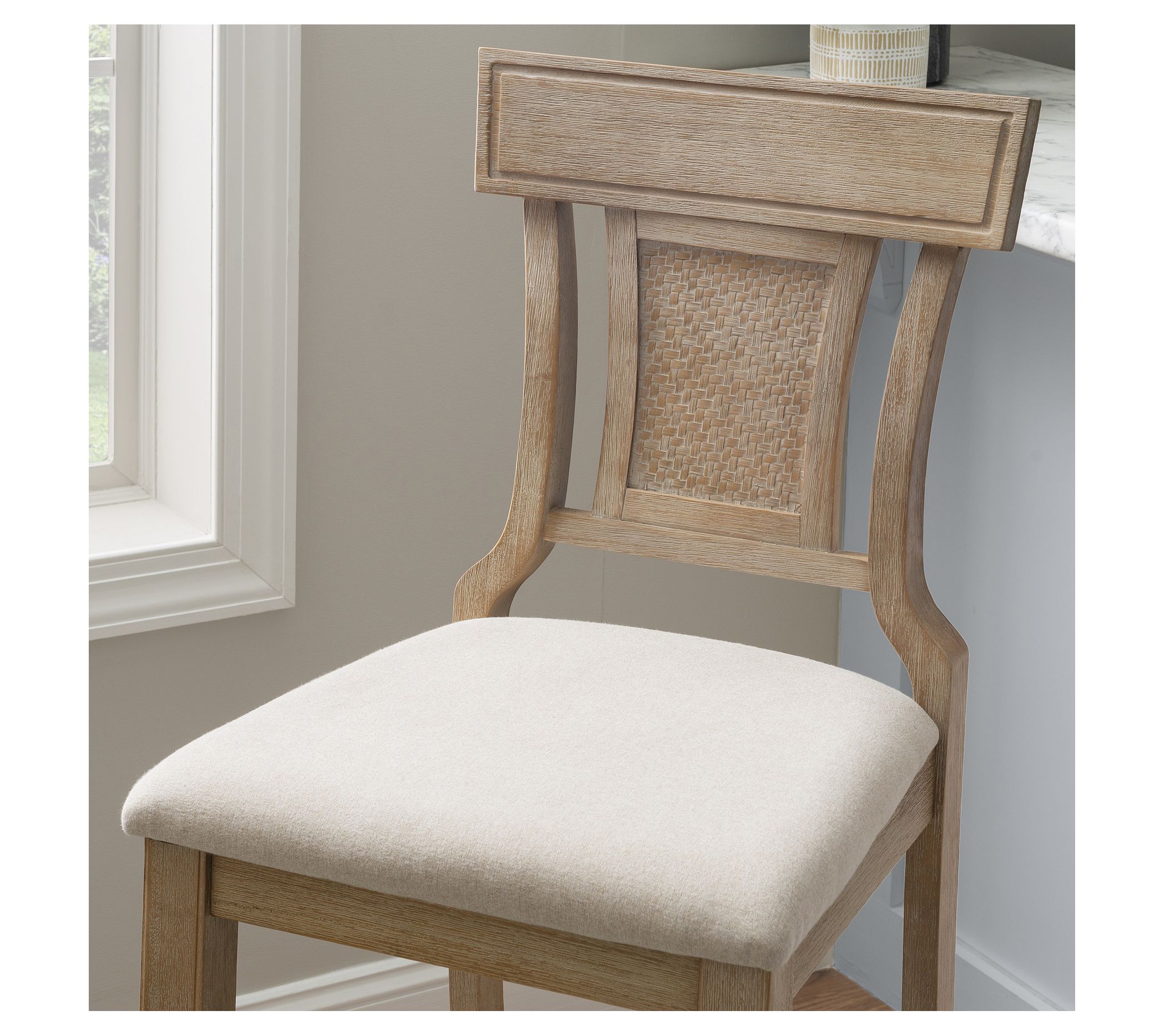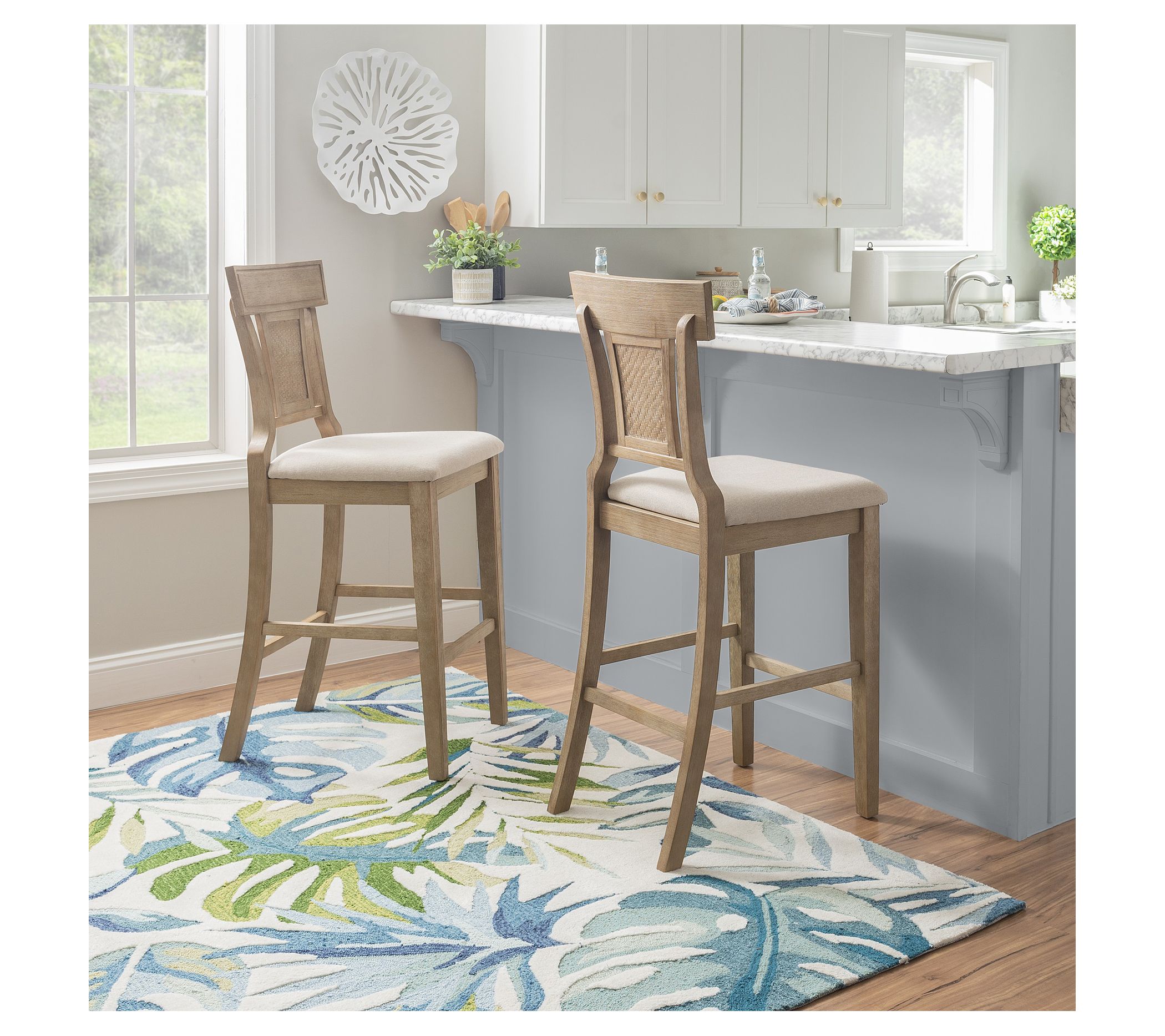 Add a touch of rustic charm to your home with the Linon Home Brooklyn solid wood upholstered bar stool. Its eye-catching back features swooping sides, a straight-lined top rail, and a woven rattan center detail, while the comfortable seat is upholstered in beige linen weave fabric. From Linon Home.