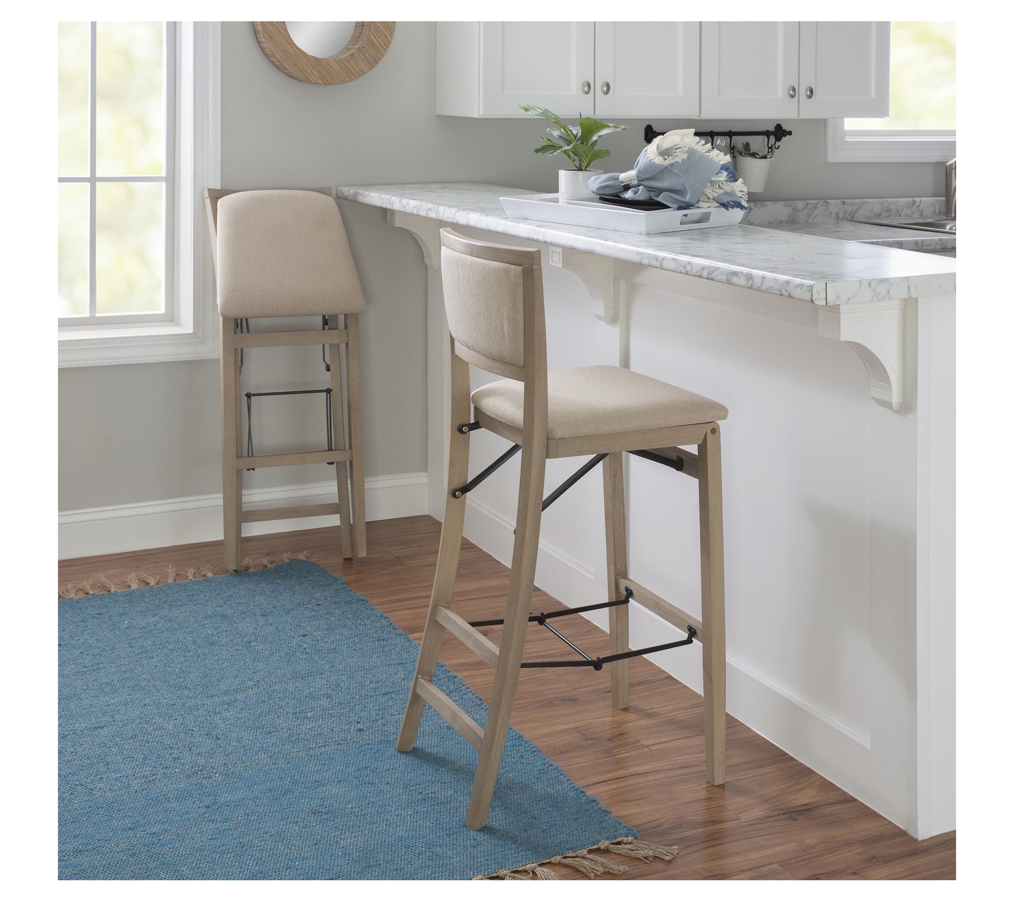 Now you can enjoy the convenience of a folding bar stool without sacrificing style! The Kasey stool features a padded back for comfort and folds up compactly for effortless storage. From Linon Home.