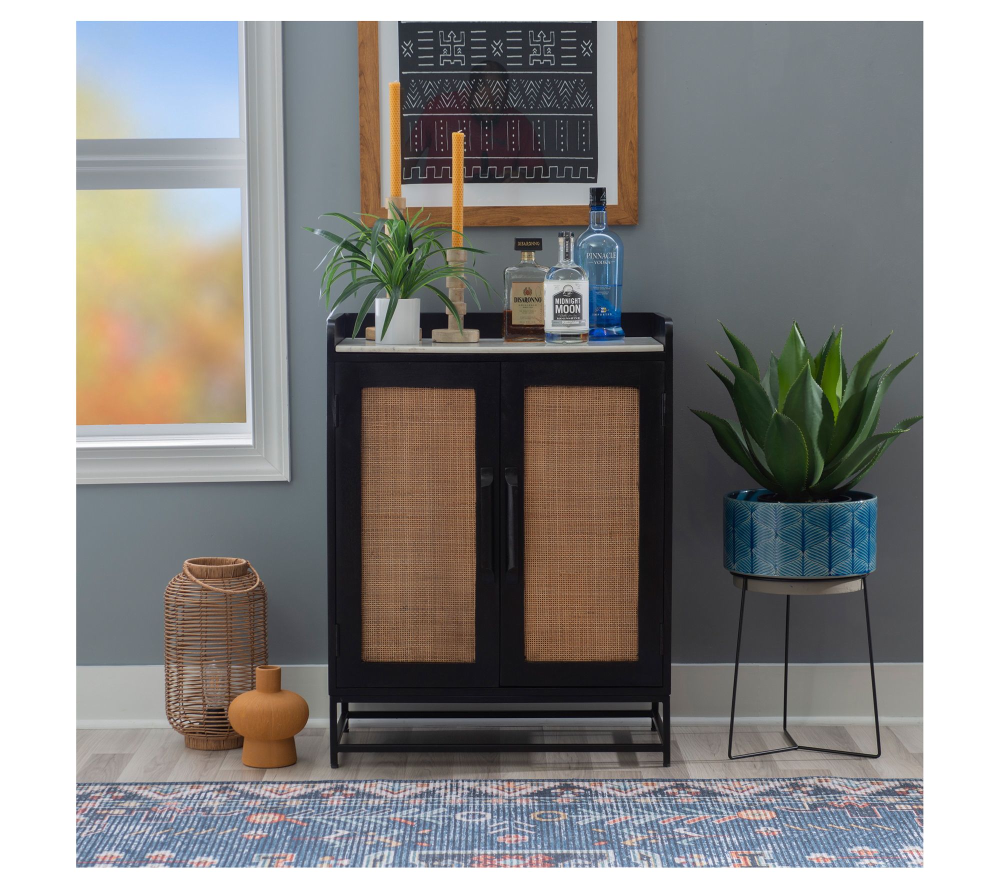 Elevate your home decor with the Fielding bar cabinet, featuring a sophisticated marble top and ample storage. Its midcentury design, highlighted by two rattan panel doors and a solid mango wood frame, complements any room, while the interior boasts four shelves, six wine glass racks, and three cubbies to keep your essentials organized. From Linon Home Decor.