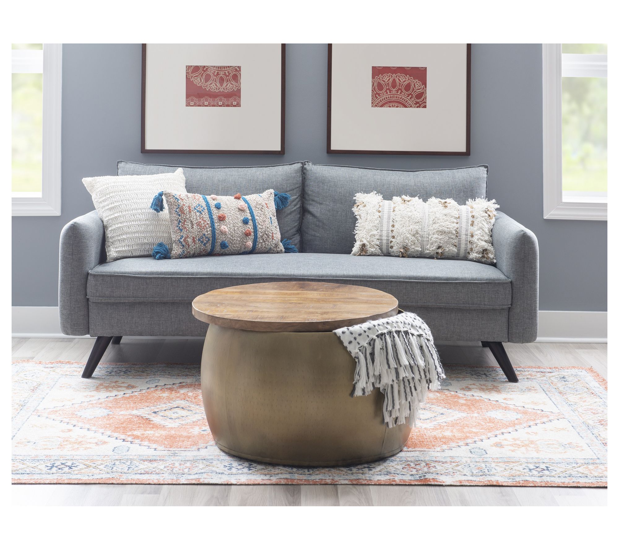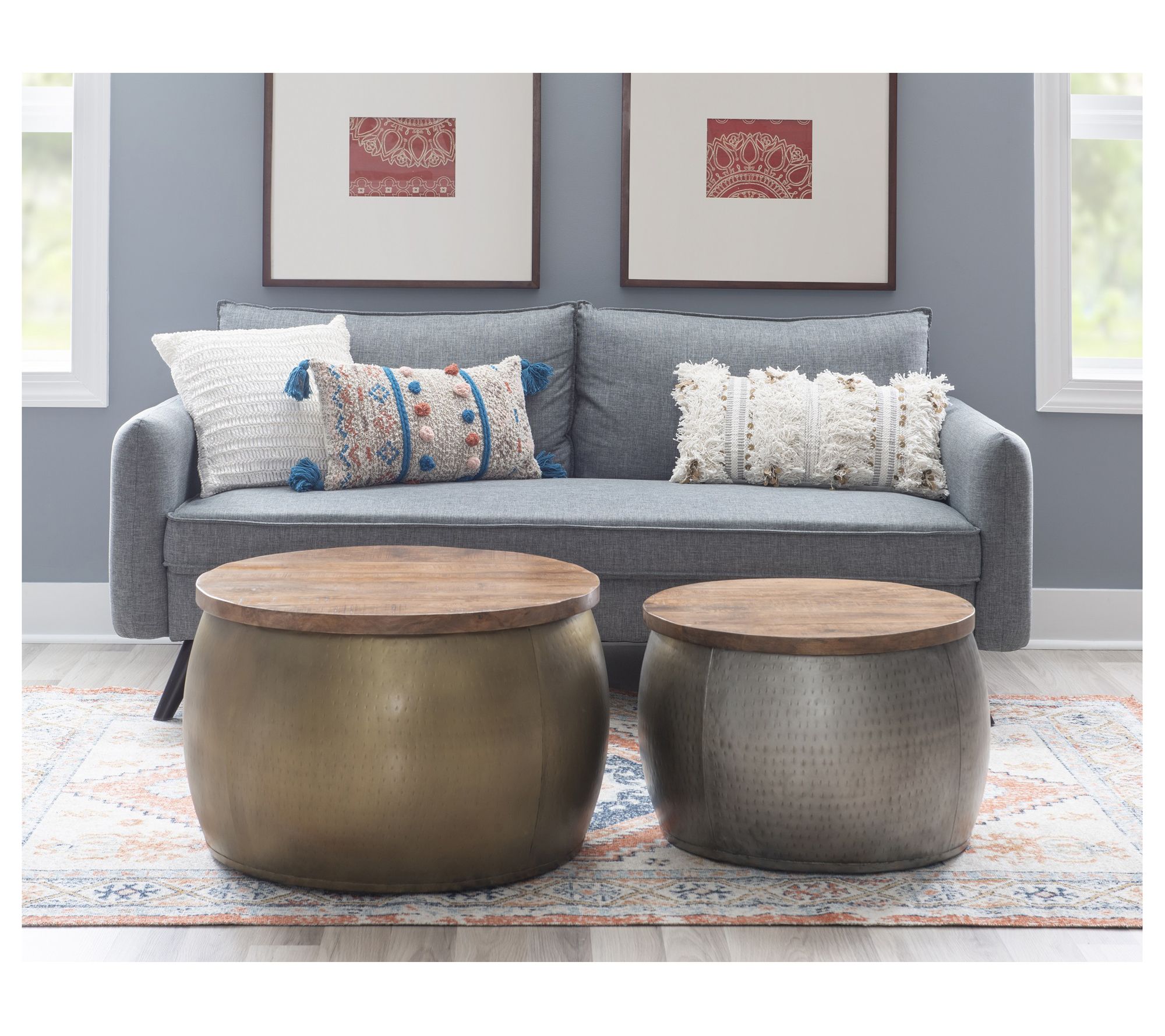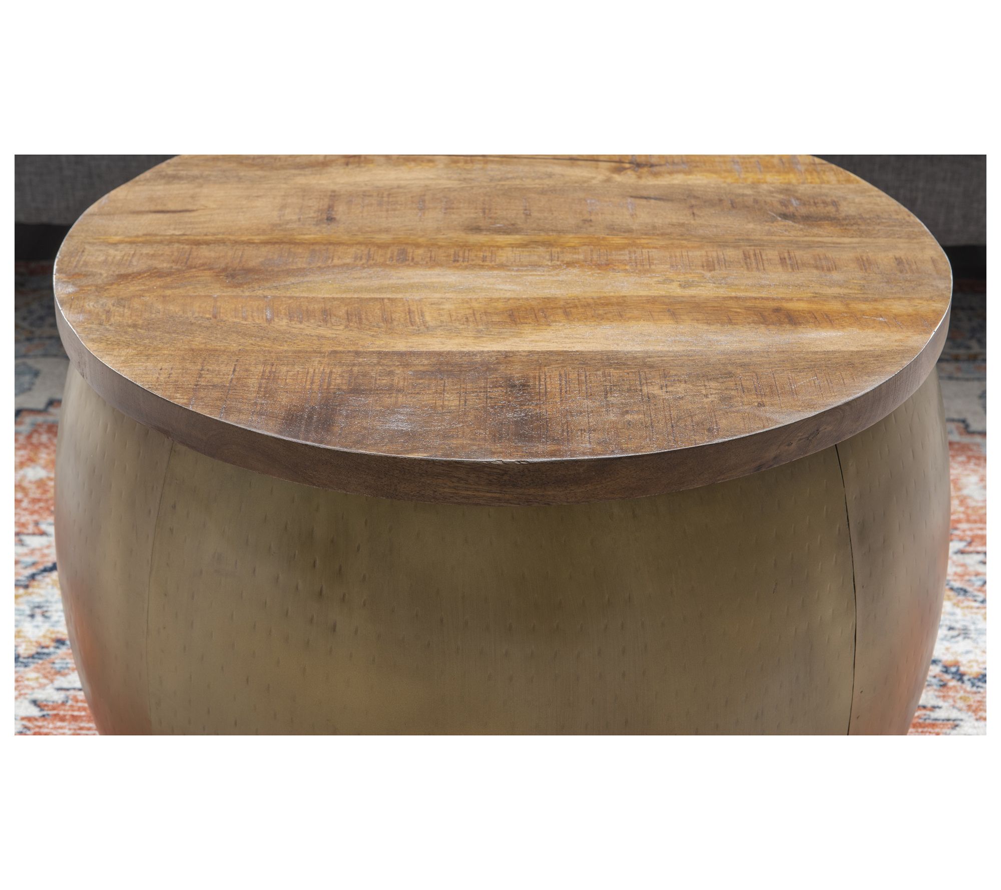 Elevate your home's aesthetic with the Massey large storage drum table with lid, a piece that effortlessly combines functionality with elegance. Crafted from hammered metal with a lustrous brass finish and topped with a solid distressed wood lid, this piece offers a chic solution for tucking away blankets, pillows, or remote controls, while serving as a stylish table or ottoman. From Linon Home Decor.