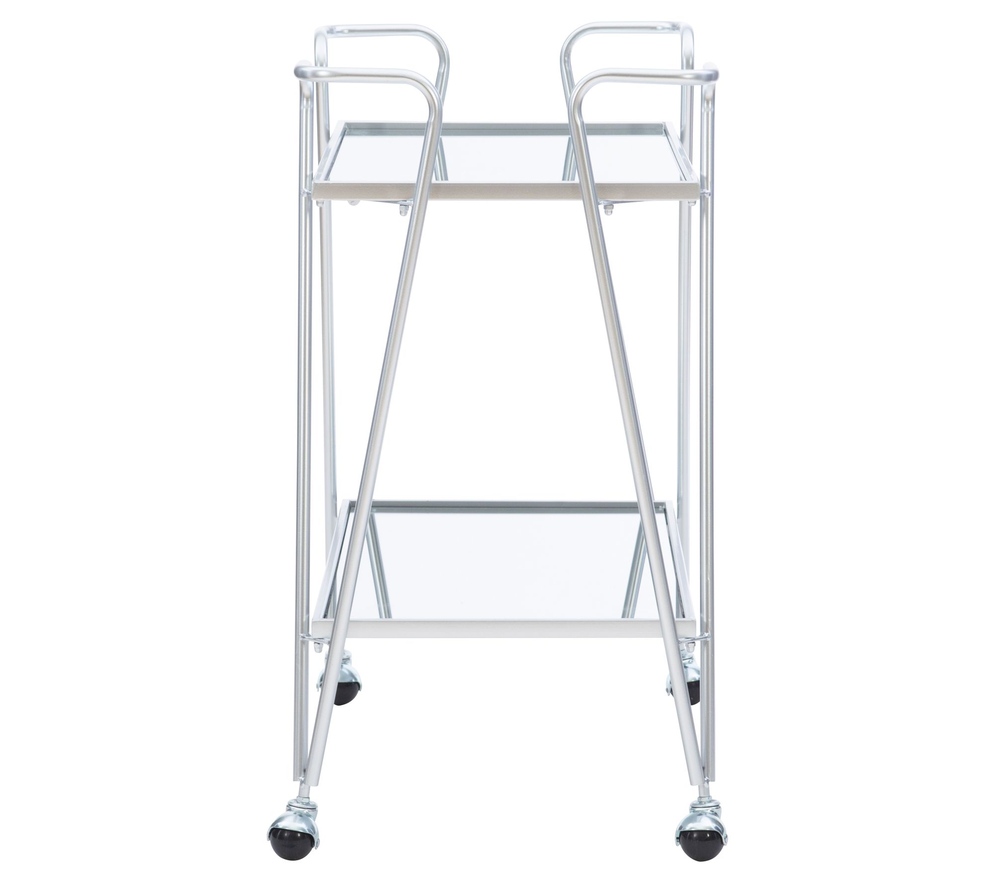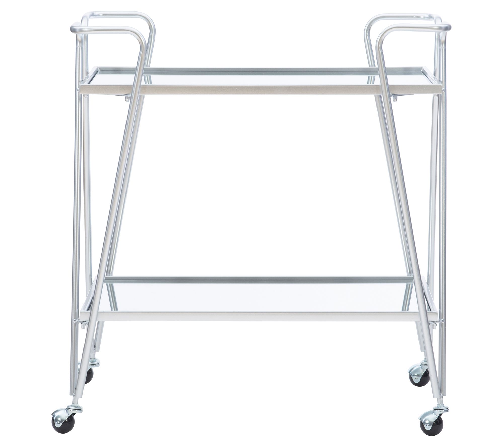 With its mirrored tops, glass shelves, locking wheels, and chrome finish metal frame, this cart is ideal for a adding a touch of mid-century charm to your living room or home bar. From Linon Home.