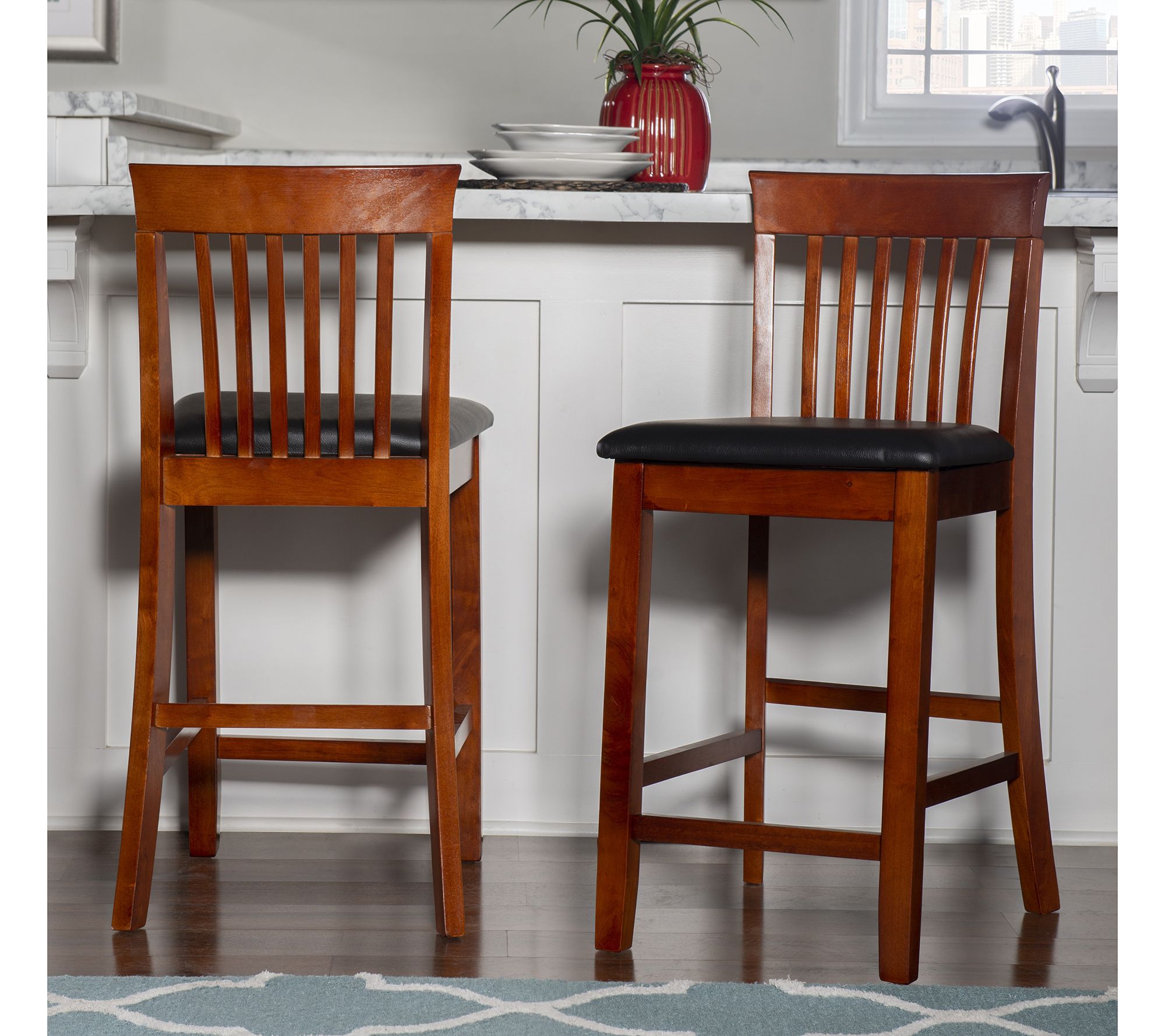Classic in style, this kitchen counter stool marries well with most home decor. Fashioned in a rich brown cherry finish, this sturdy addition has a padded seat for extra comfort and foot rails for convenience. From Linon Home.