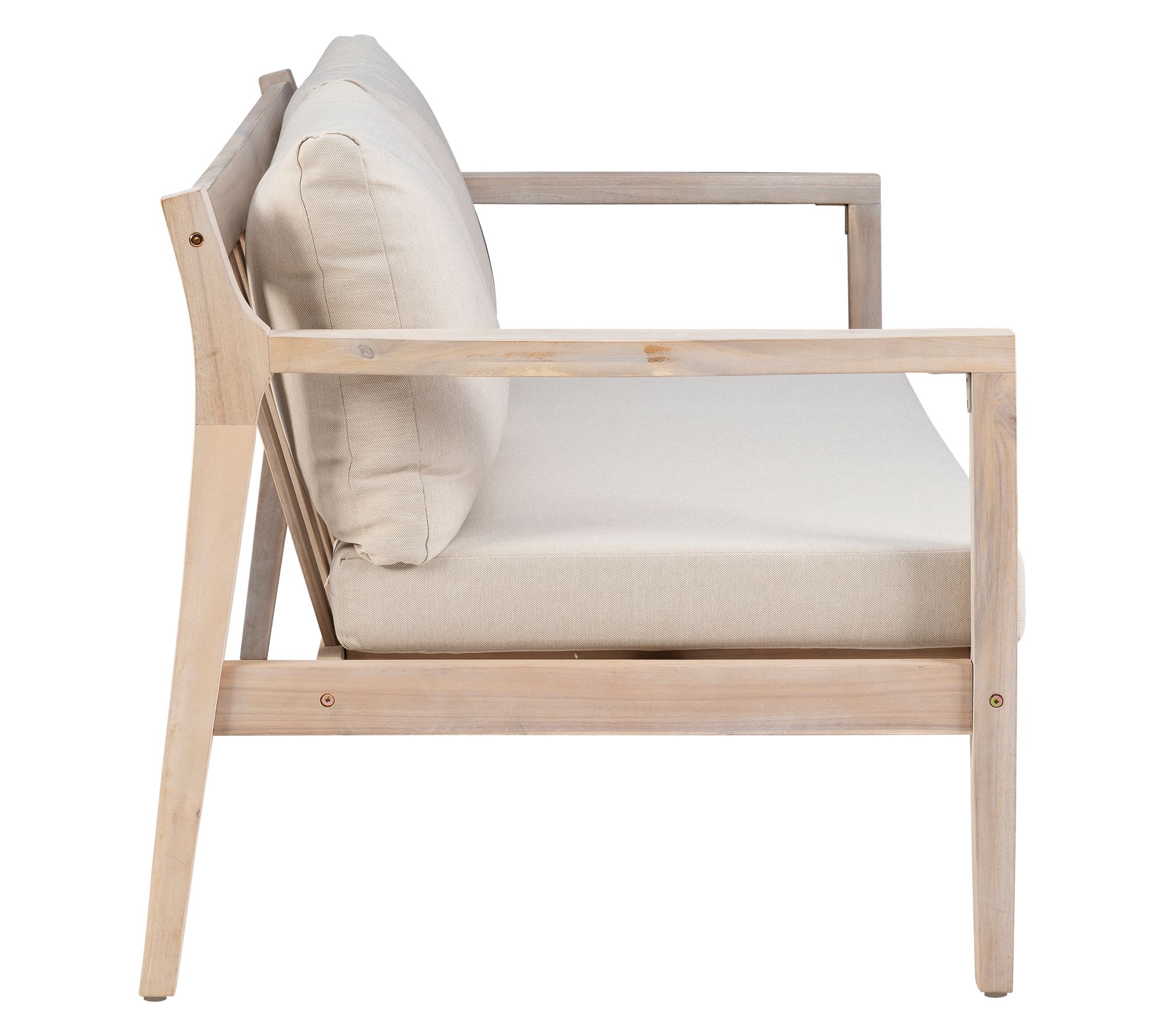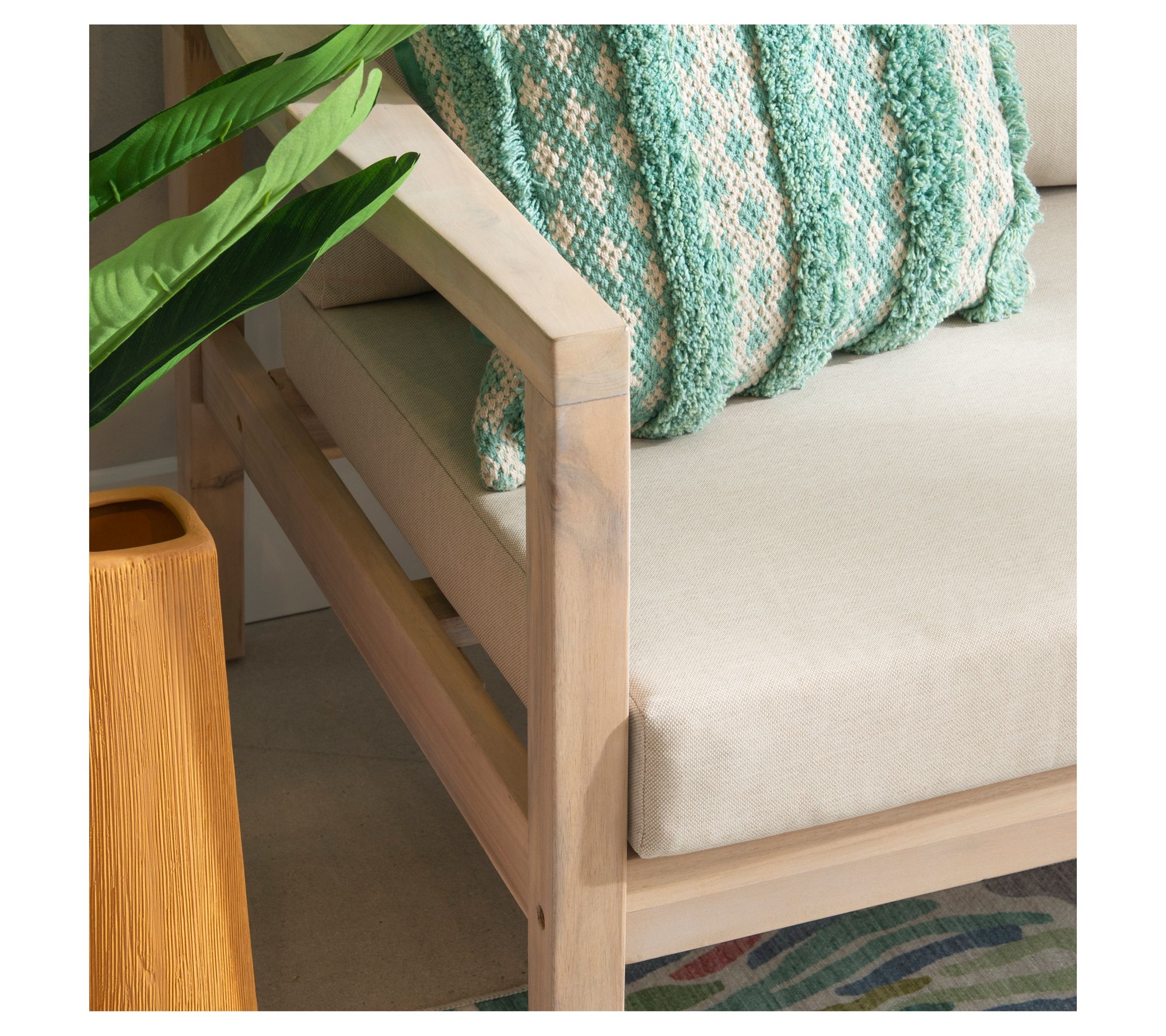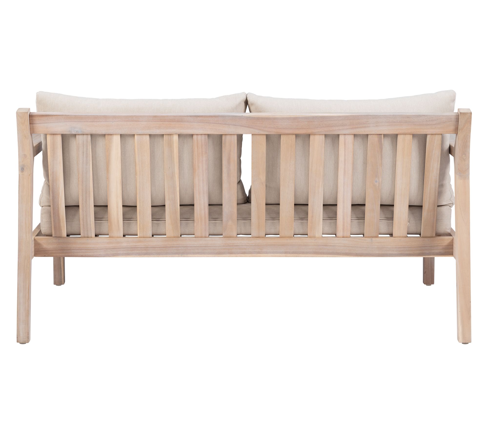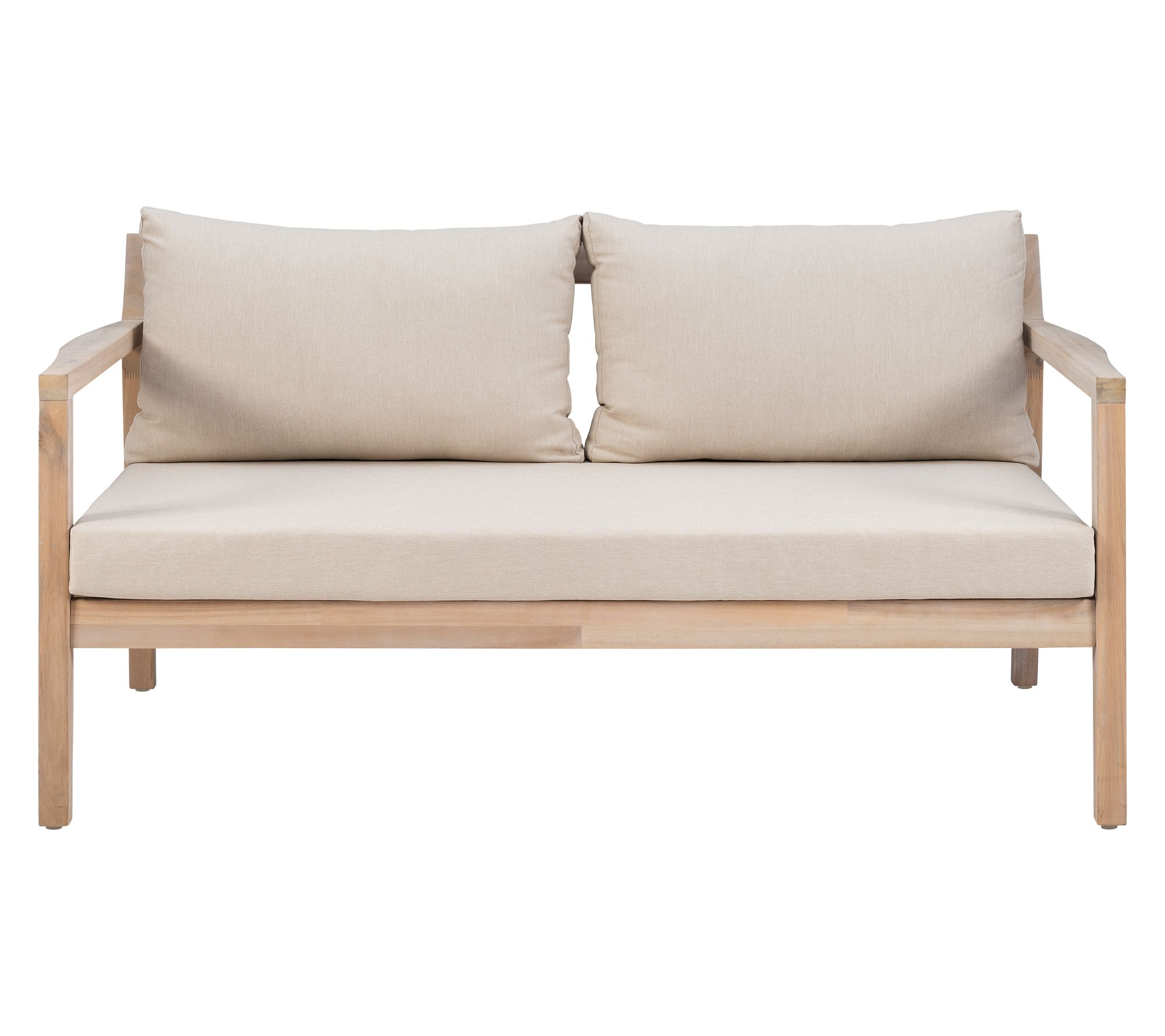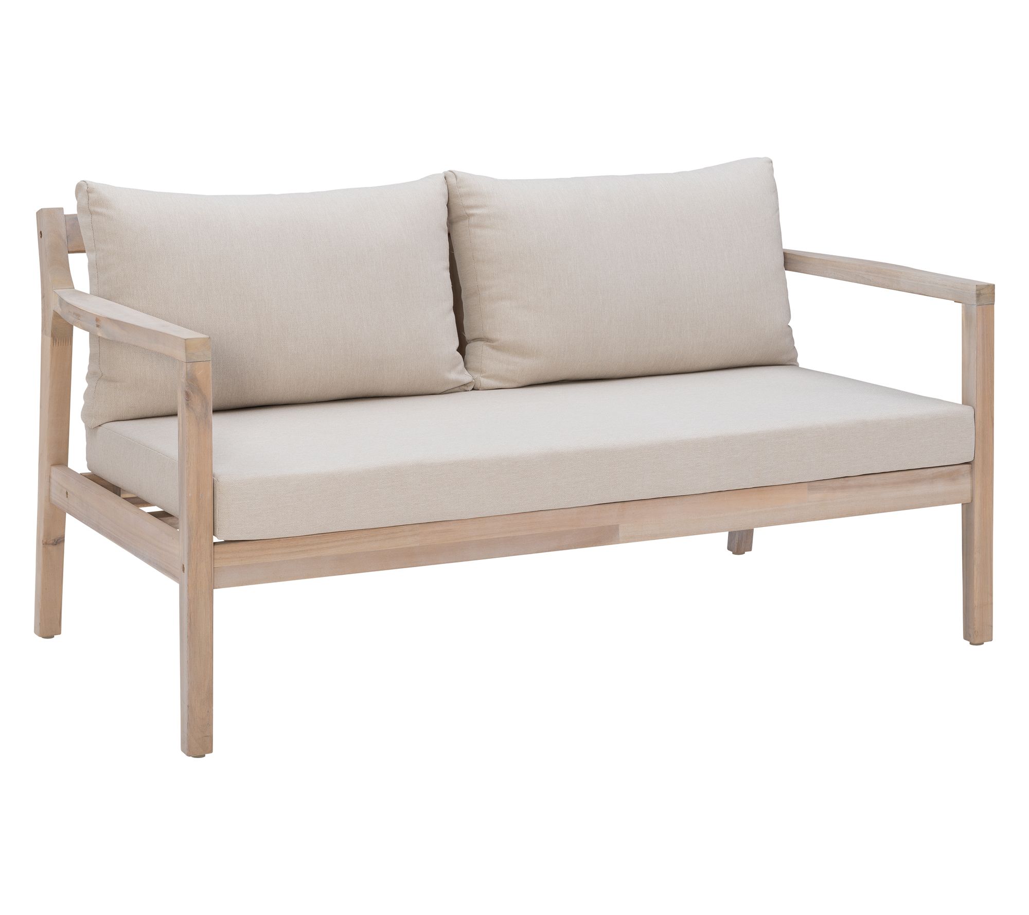 A cozy spot for you and a loved one to relax together outdoors, this two-seater blends comfort and durability. High-density cushions in beige resist water and fading, making afternoons on the porch or sunny rooftops even more enjoyable. Rustic acacia wood brings boho character, while its oil-based finish helps protect through changing seasons. From Linon Home.