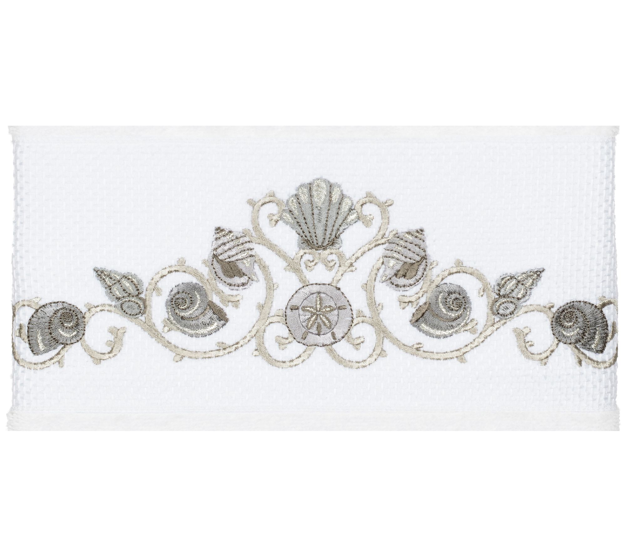 Celebrate a seaside theme in your master or guest bathroom with this charming bath towel featuring glittering embroidered seashells and scrollwork on a woven, textured border. Made with luxuriously soft 100% cotton, this towel is superbly absorbent and durable for years of enjoyment. From Linum Home Textiles.