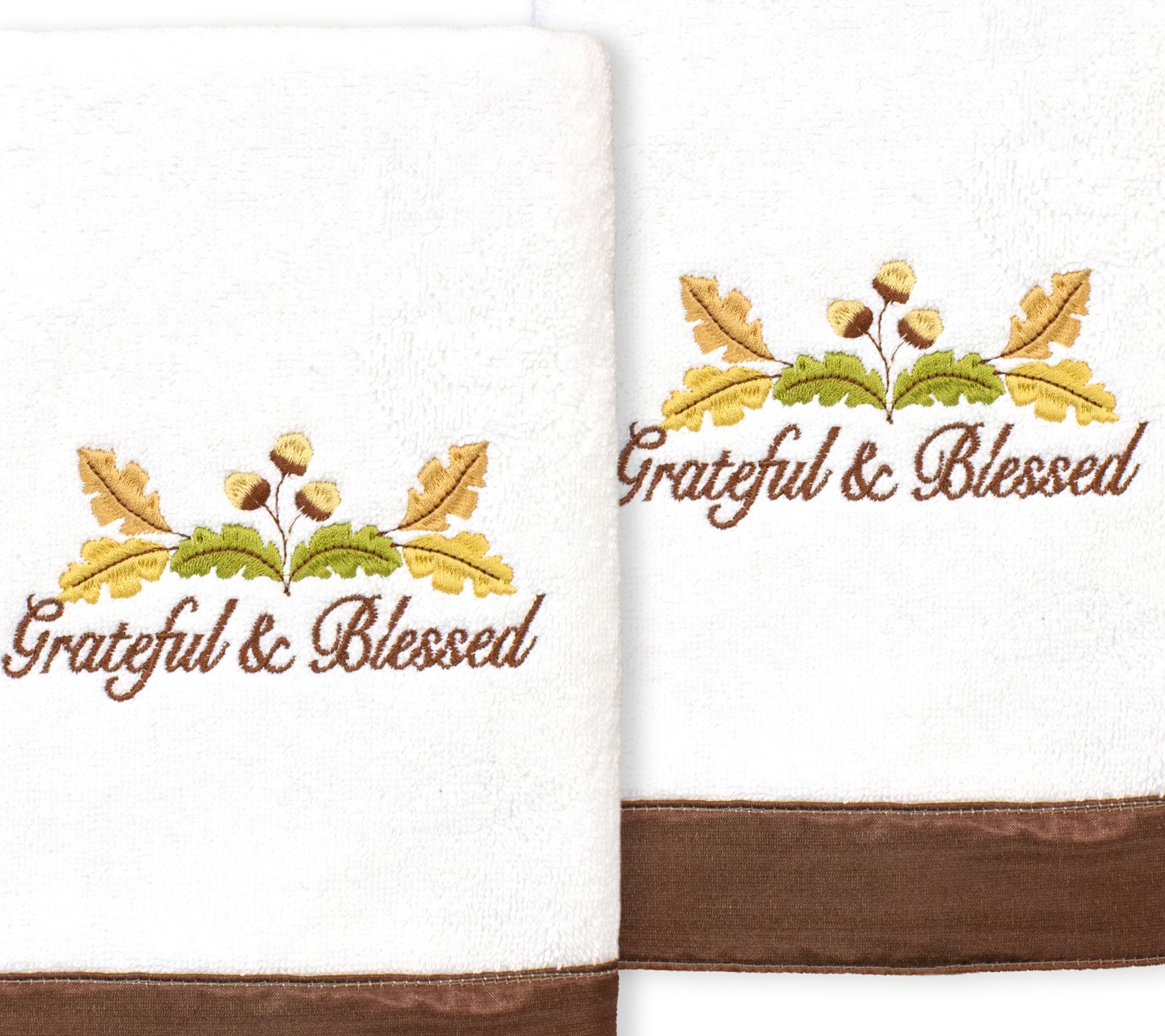 Bring the spirit of the holidays into your space when you place this set of two "Grateful & Blessed" towels in your master bedroom, guest room, or kitchen. It features maximum softness with an elegant design that's made from 100% cotton with a polyester border. From Linum Home.