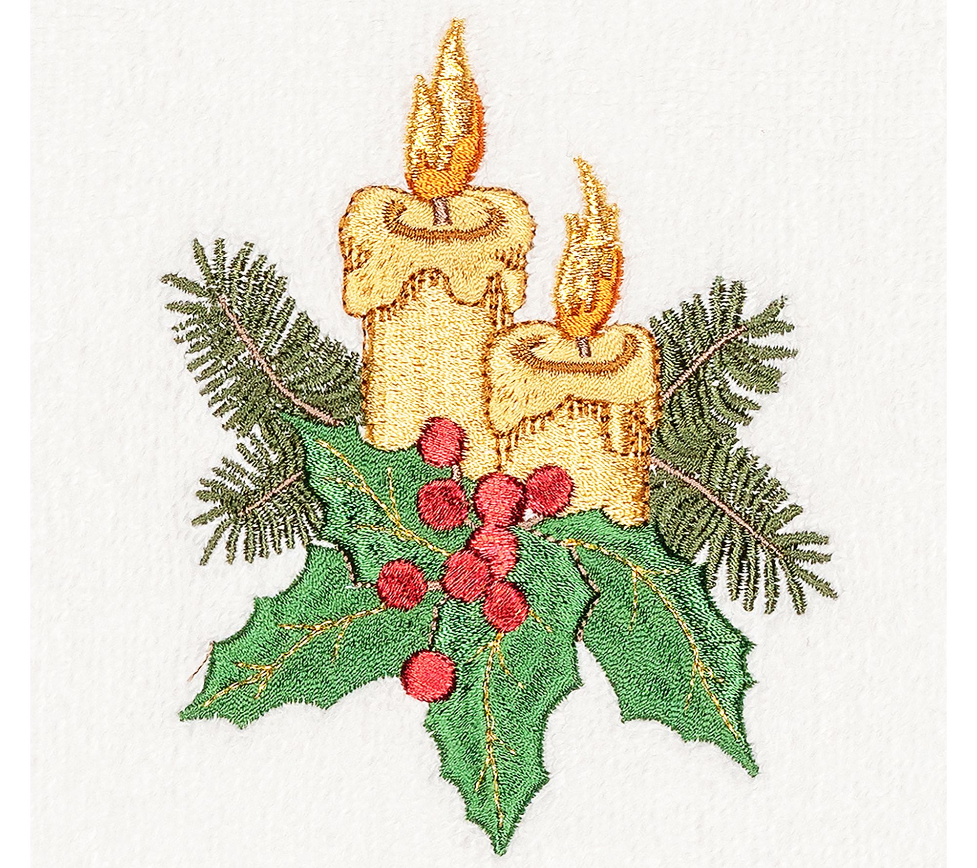 • Embroidered bouquet of candles, pine branches, and holly leaves with sparkling red berries
