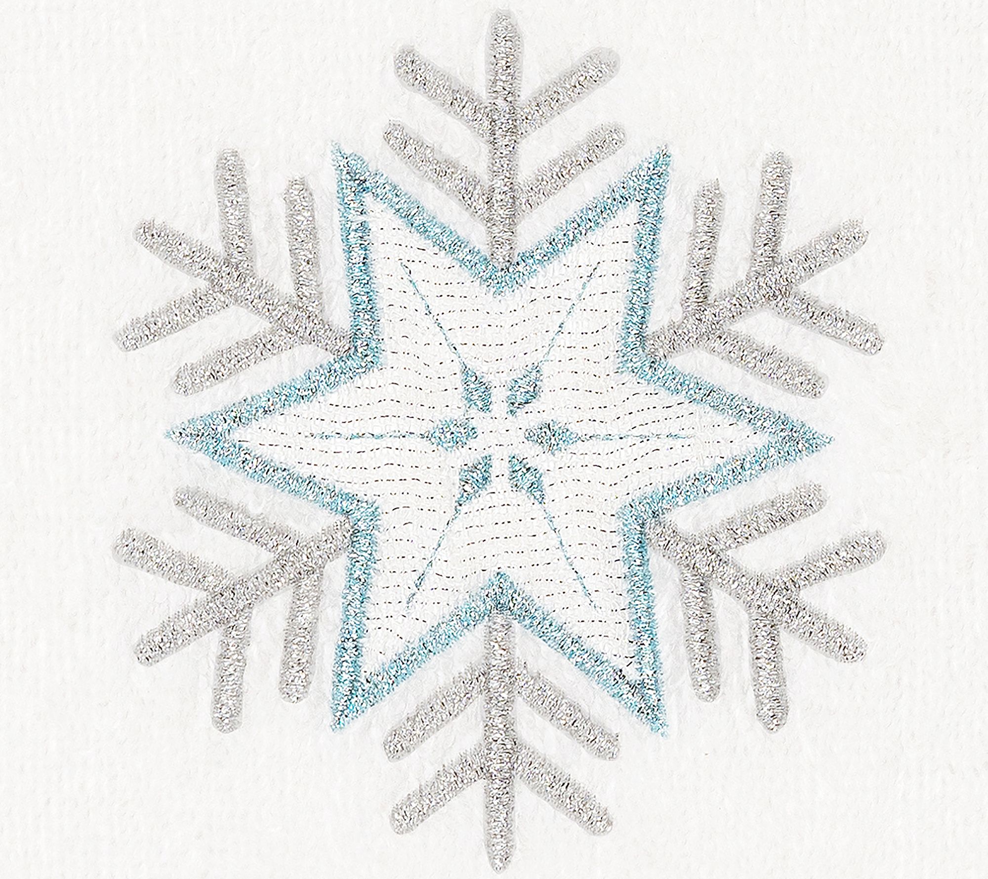 • Embroidered applique snowflake with metallic, aqua, and silvery accents