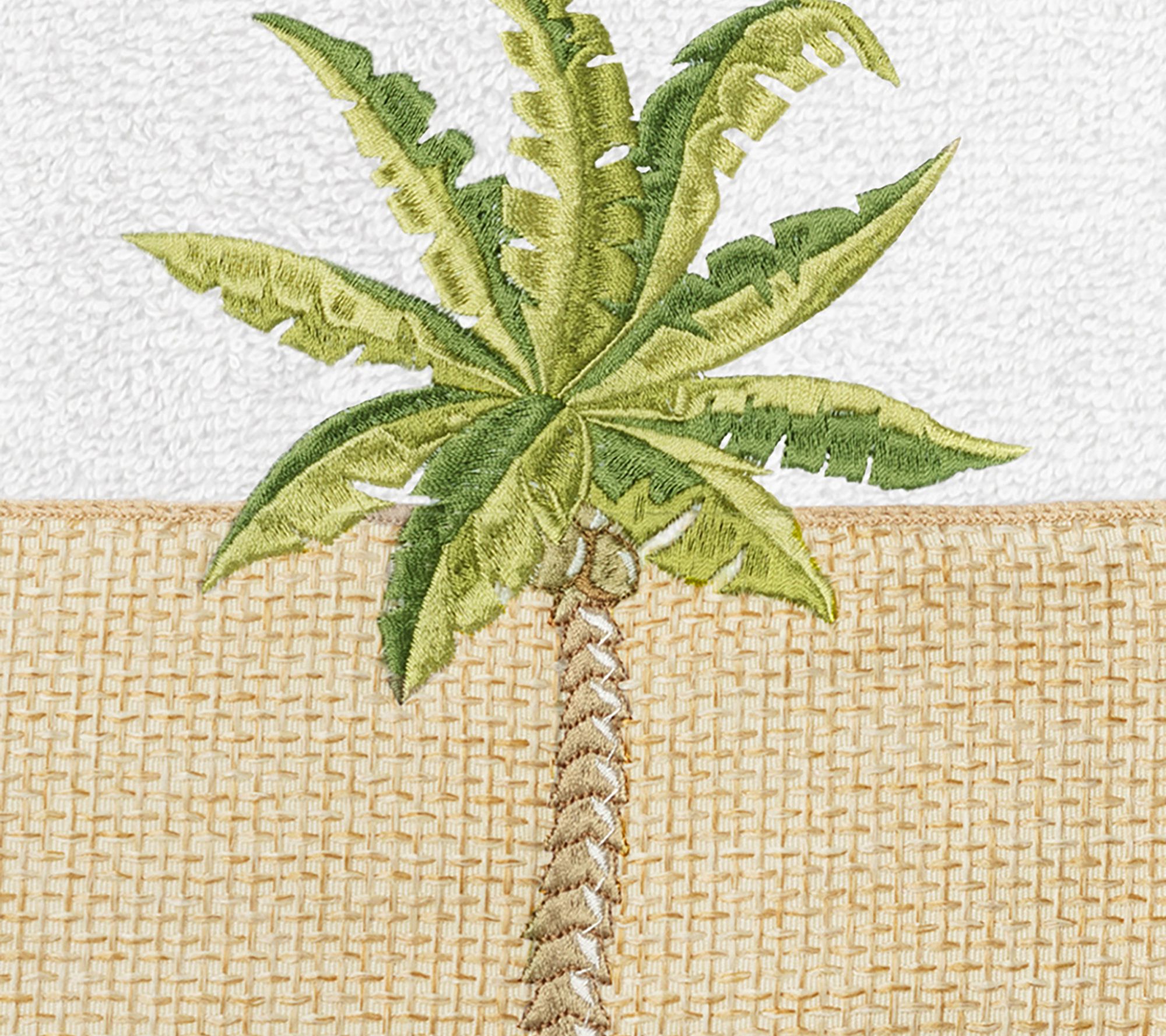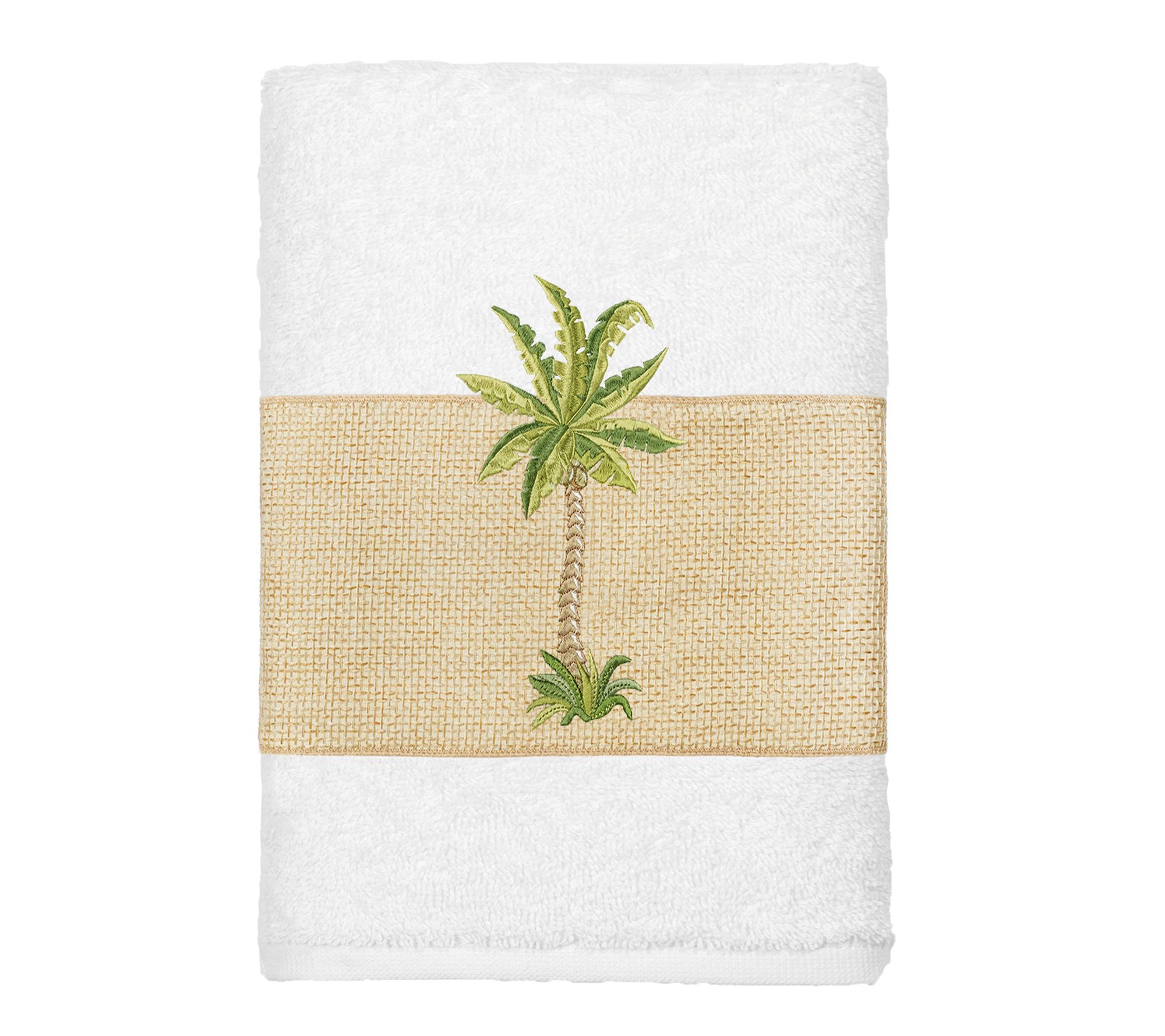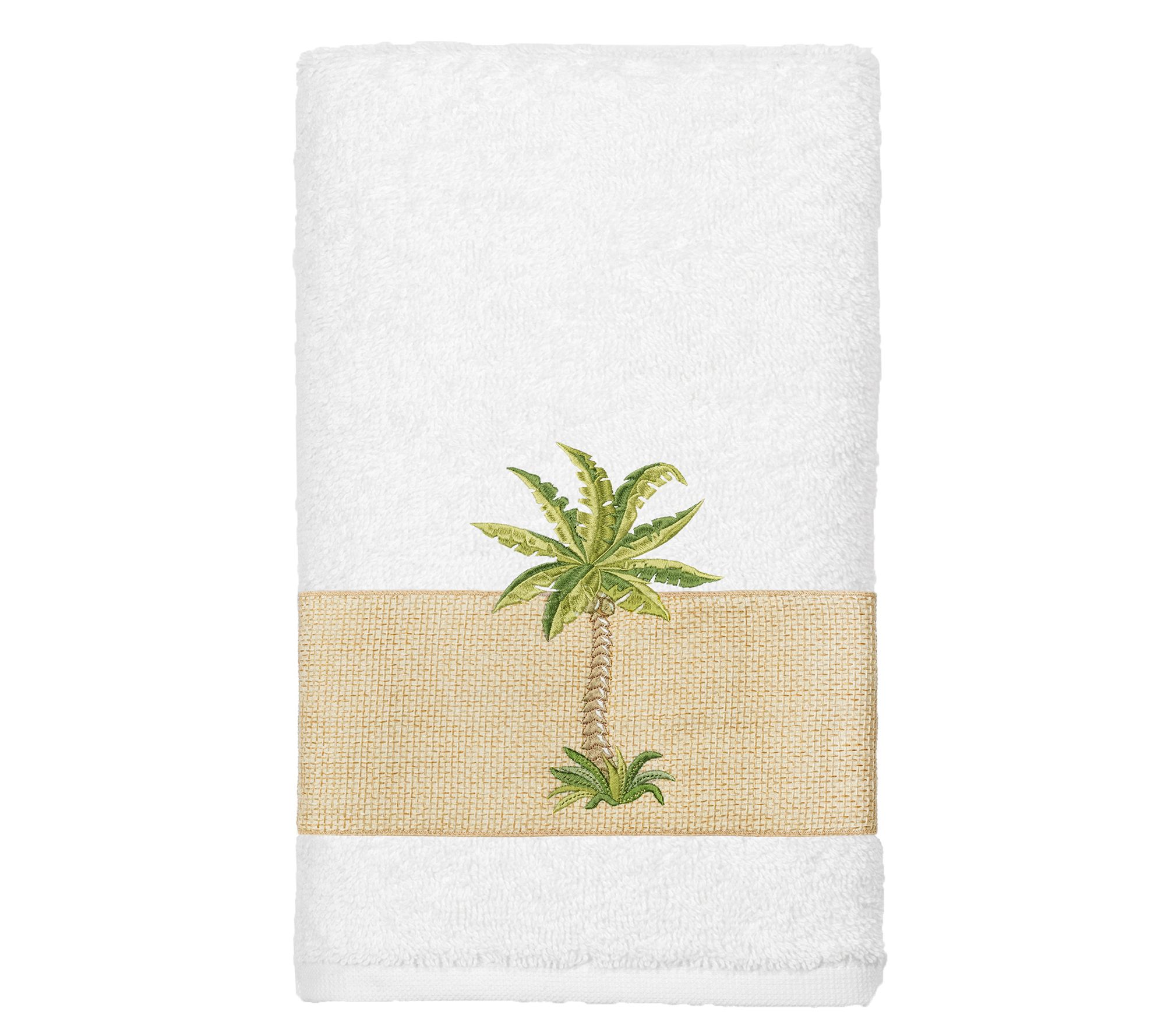 Bring an elegant, yet peaceful tropical aura to your bath decor with this towel set embellished with a regal palm tree on a textured, woven border. Made of premium cotton, these absorbent, durable towels also make a beautiful housewarming gift. From Linum Home Textiles.