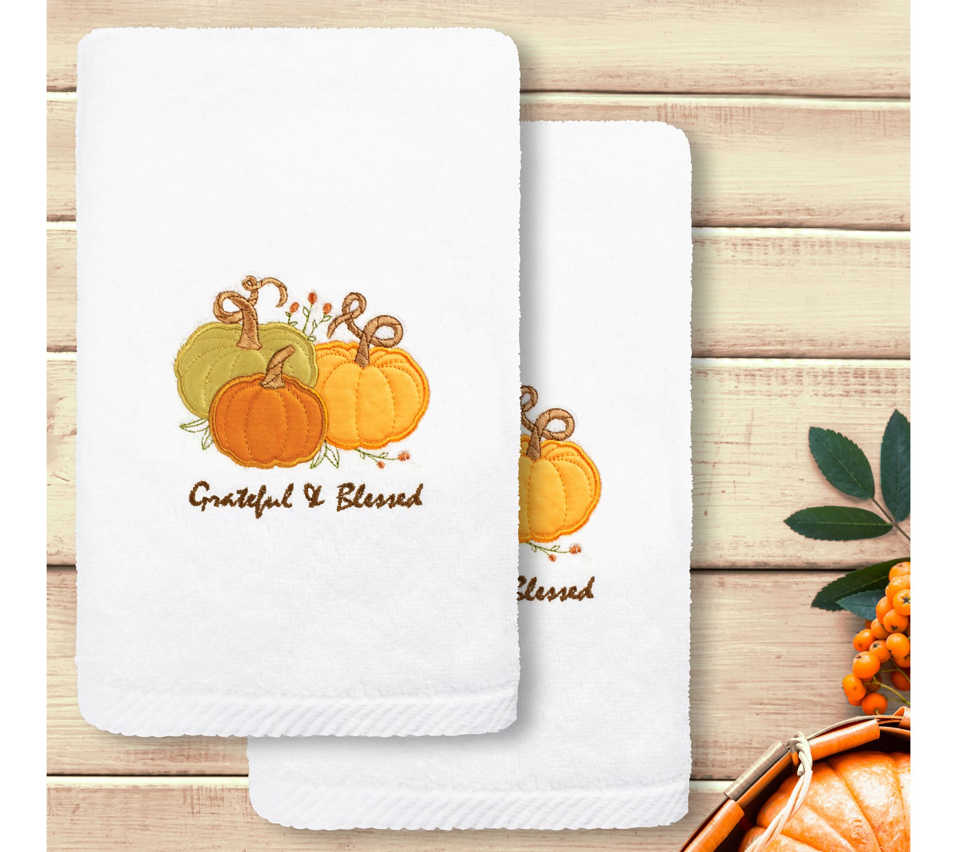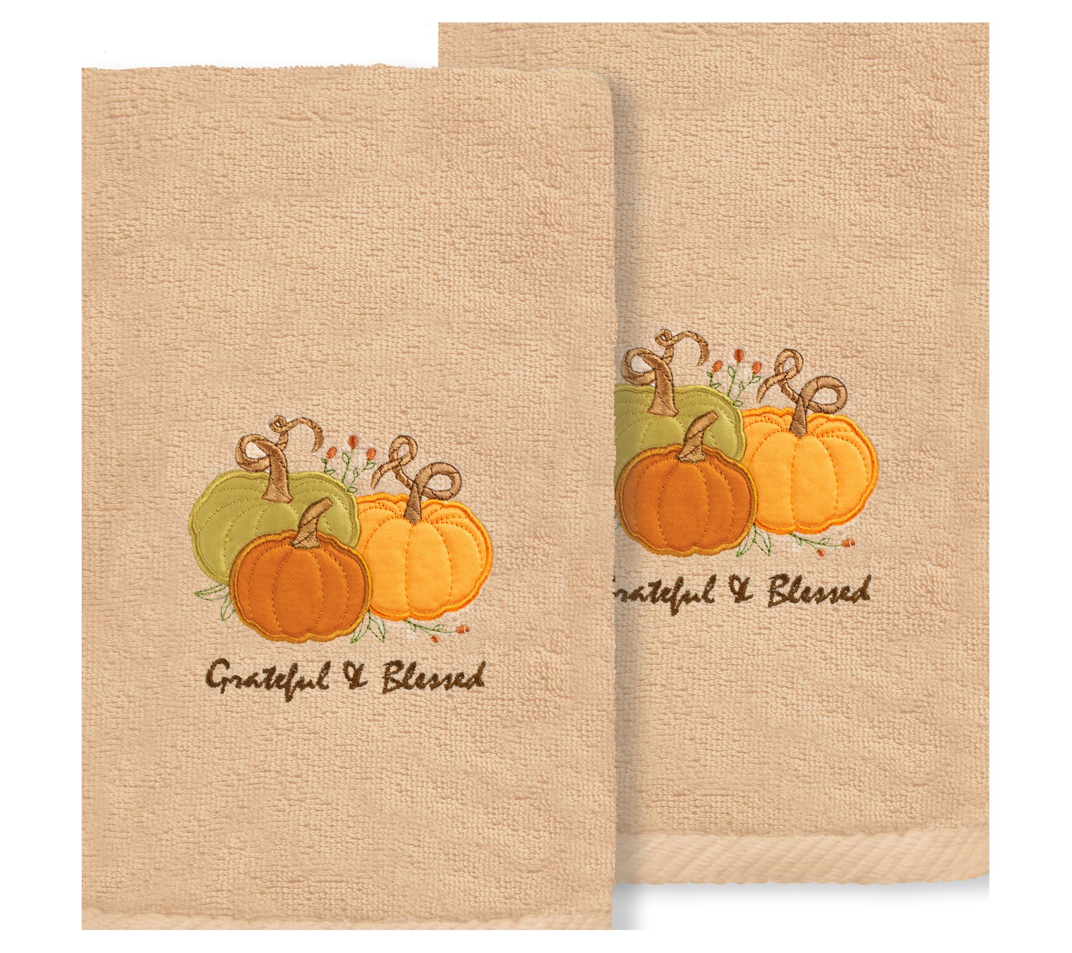 Featuring an autumnal pumpkin design, these plush hand towels provide maximum softness and absorbency. From Linum Home Textiles.