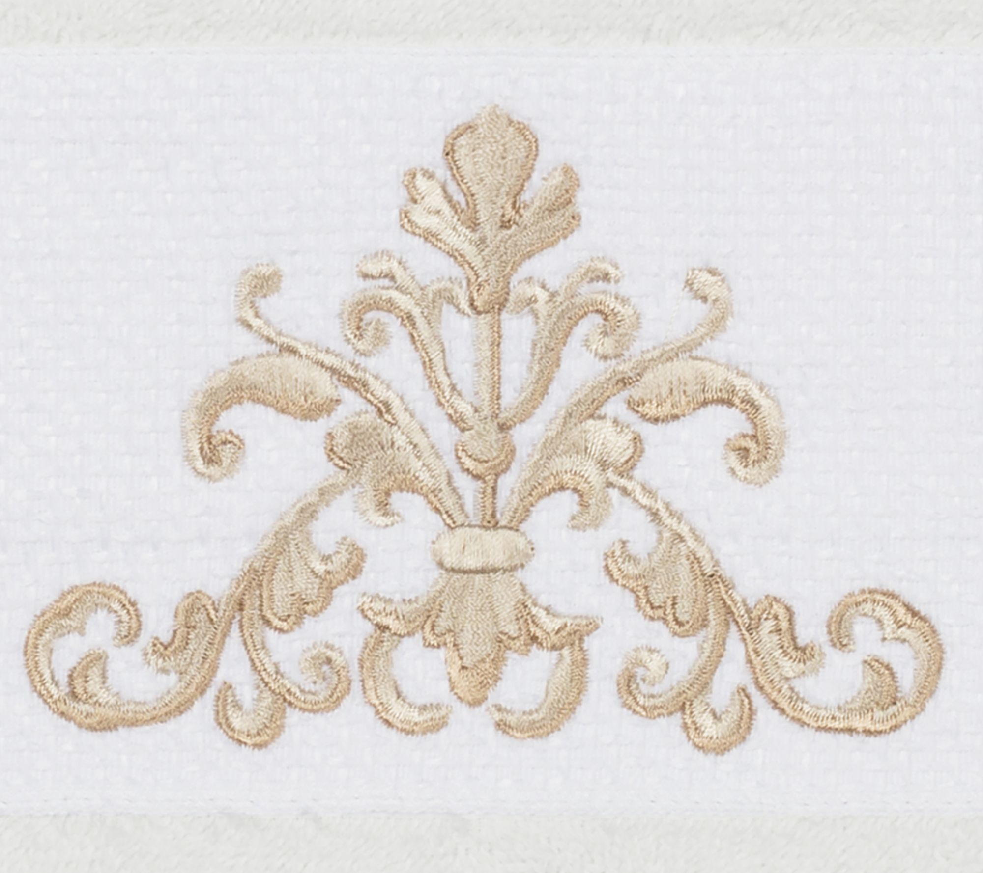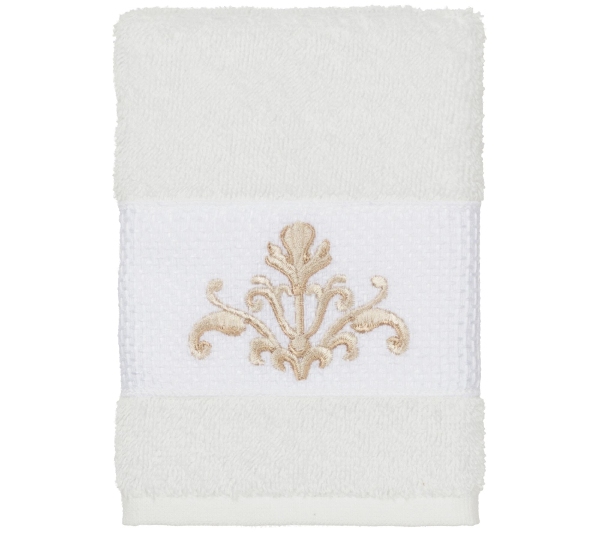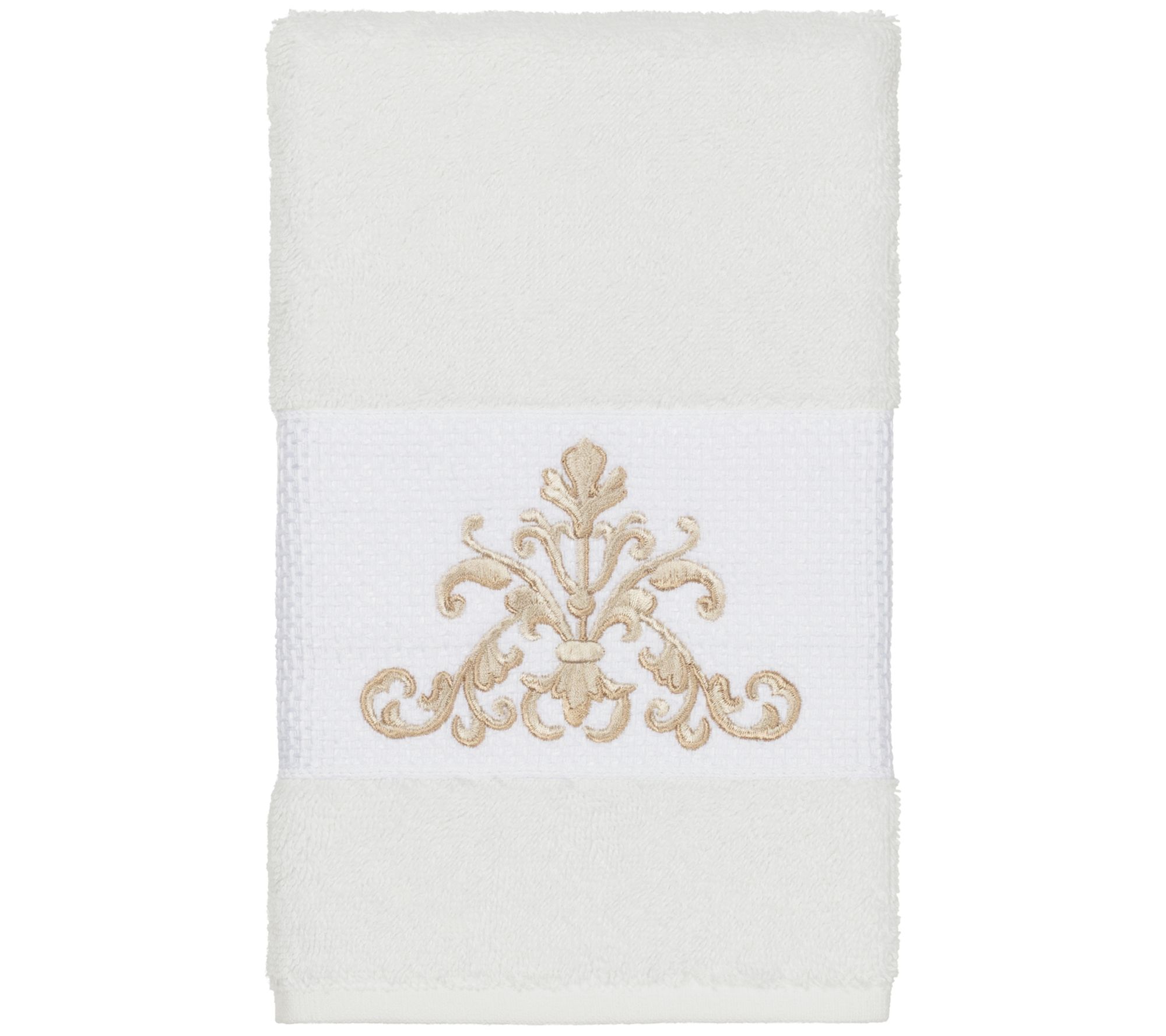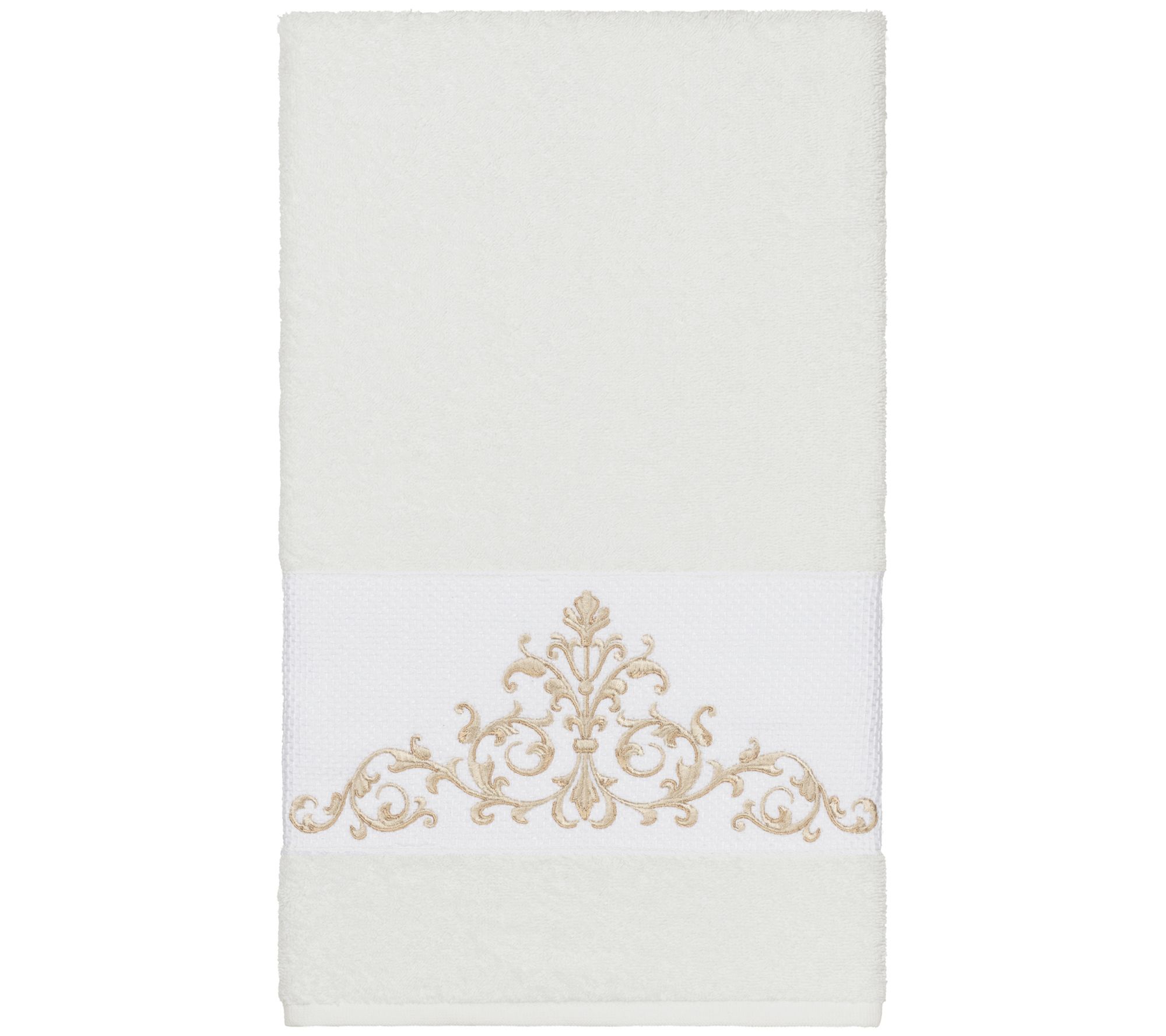 Upgrade your bath decor with this towel set featuring an elegant, scrolling crest motif embellishment on a textured woven border. These soft and luxurious towels are made of premium cotton and offer lasting absorbency and superior durability. From Linum Home Textiles.