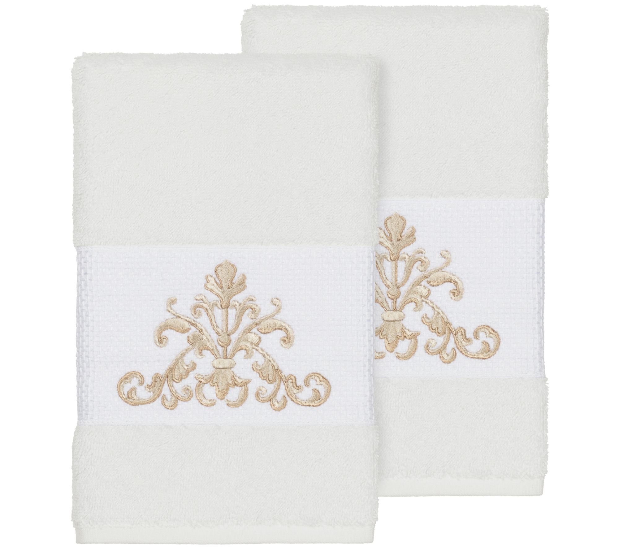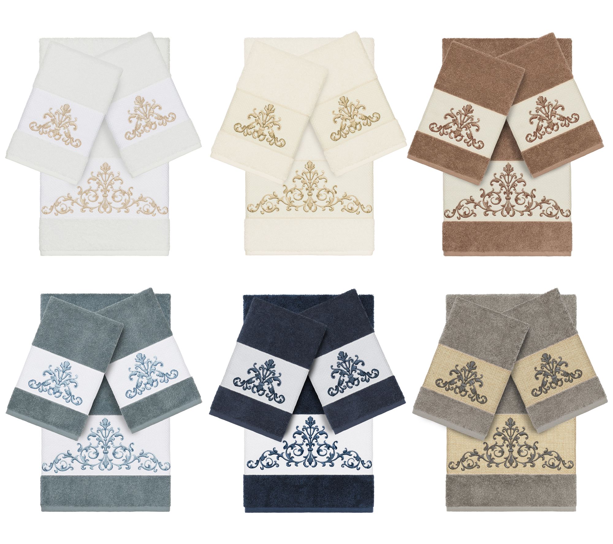 Upgrade your bath decor with this towel set featuring an elegant, scrolling crest motif embellishment on a textured woven border. These soft and luxurious towels are made of premium cotton and offer lasting absorbency and superior durability. From Linum Home Textiles.