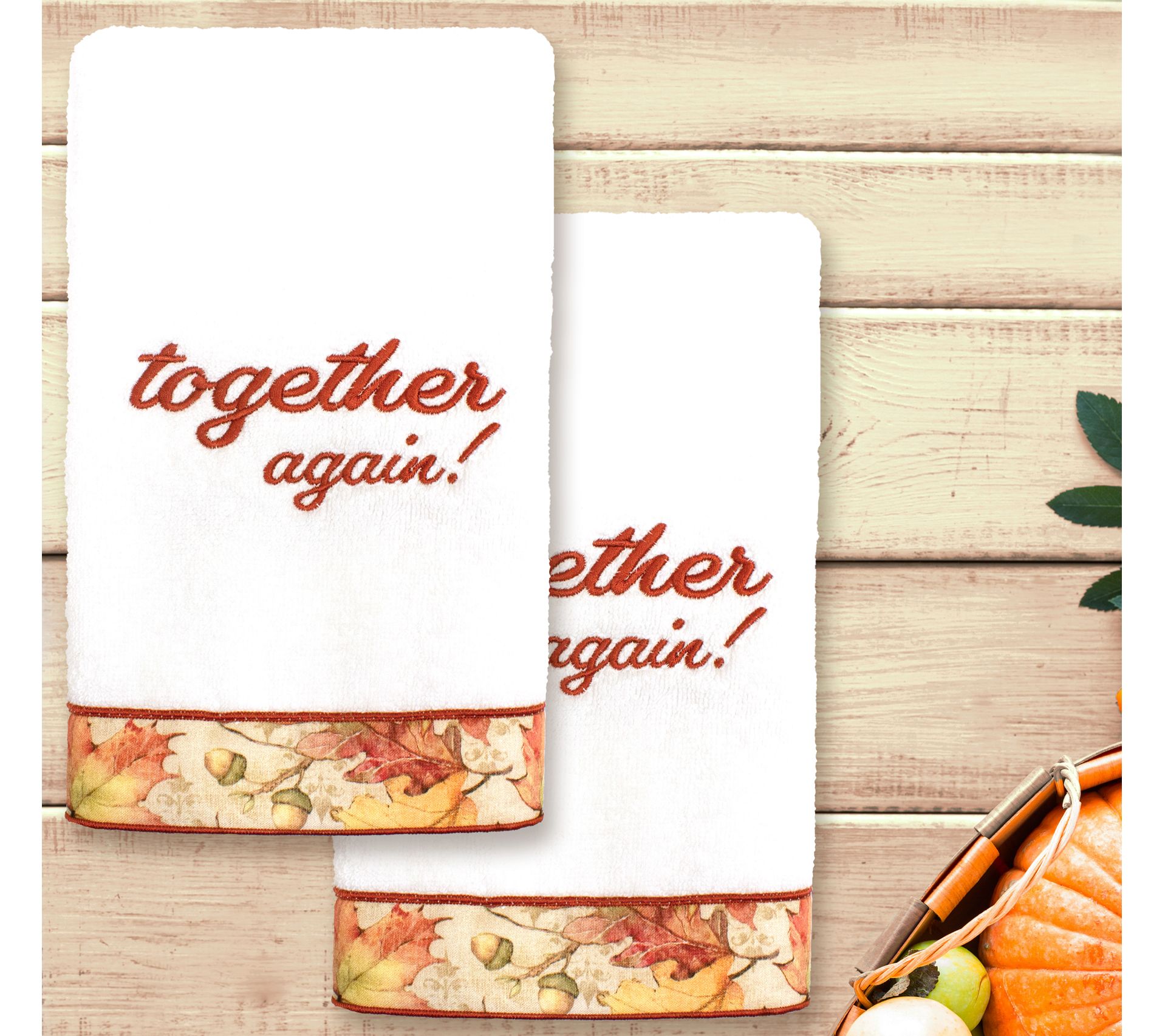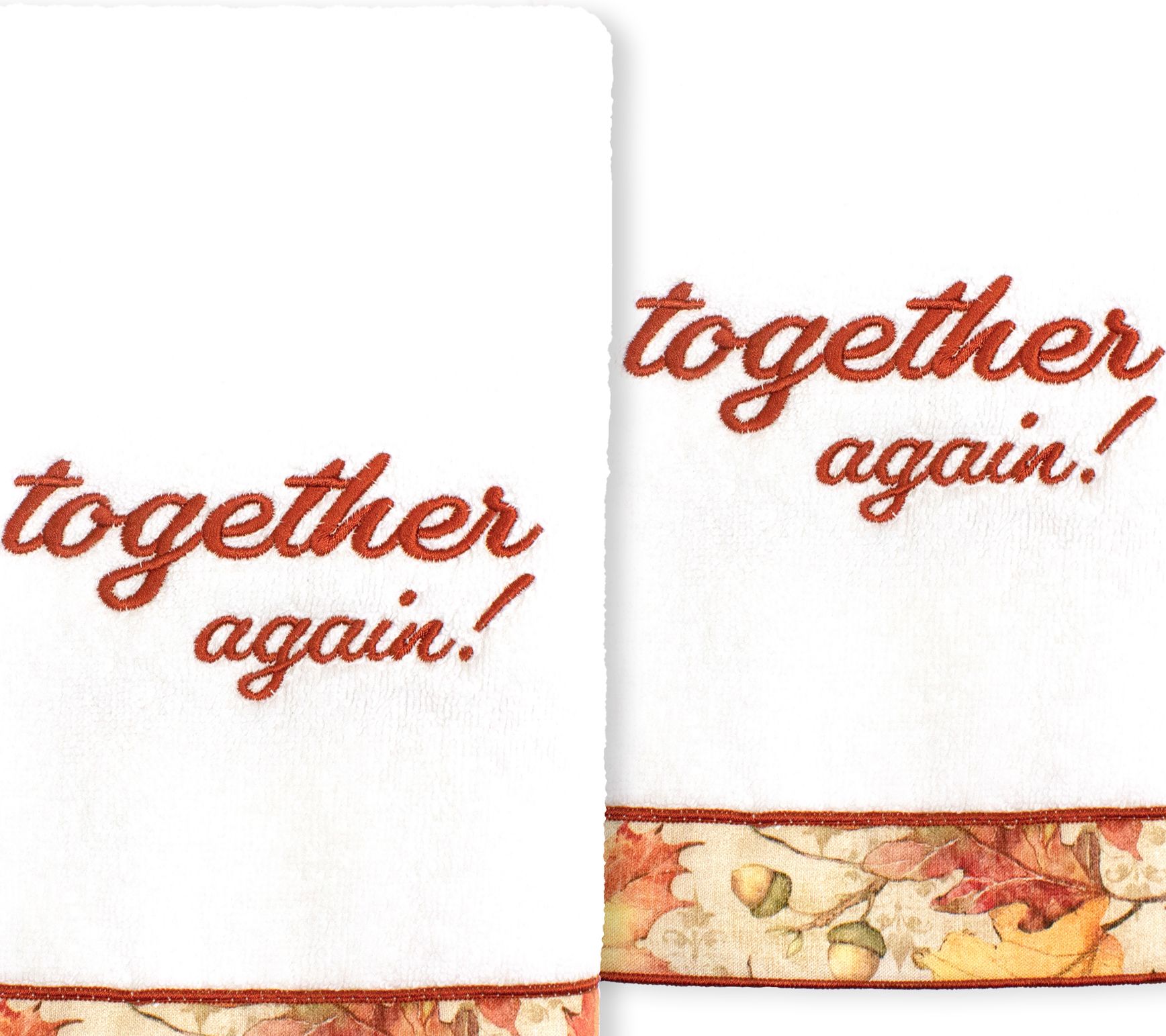 Bring the spirit of the holidays into your space when you place this set of two Thanksgiving "Together Again!" towels in your master bedroom, guest room, or kitchen. It features maximum softness with an elegant design that's made from 100% cotton. From Linum Home.