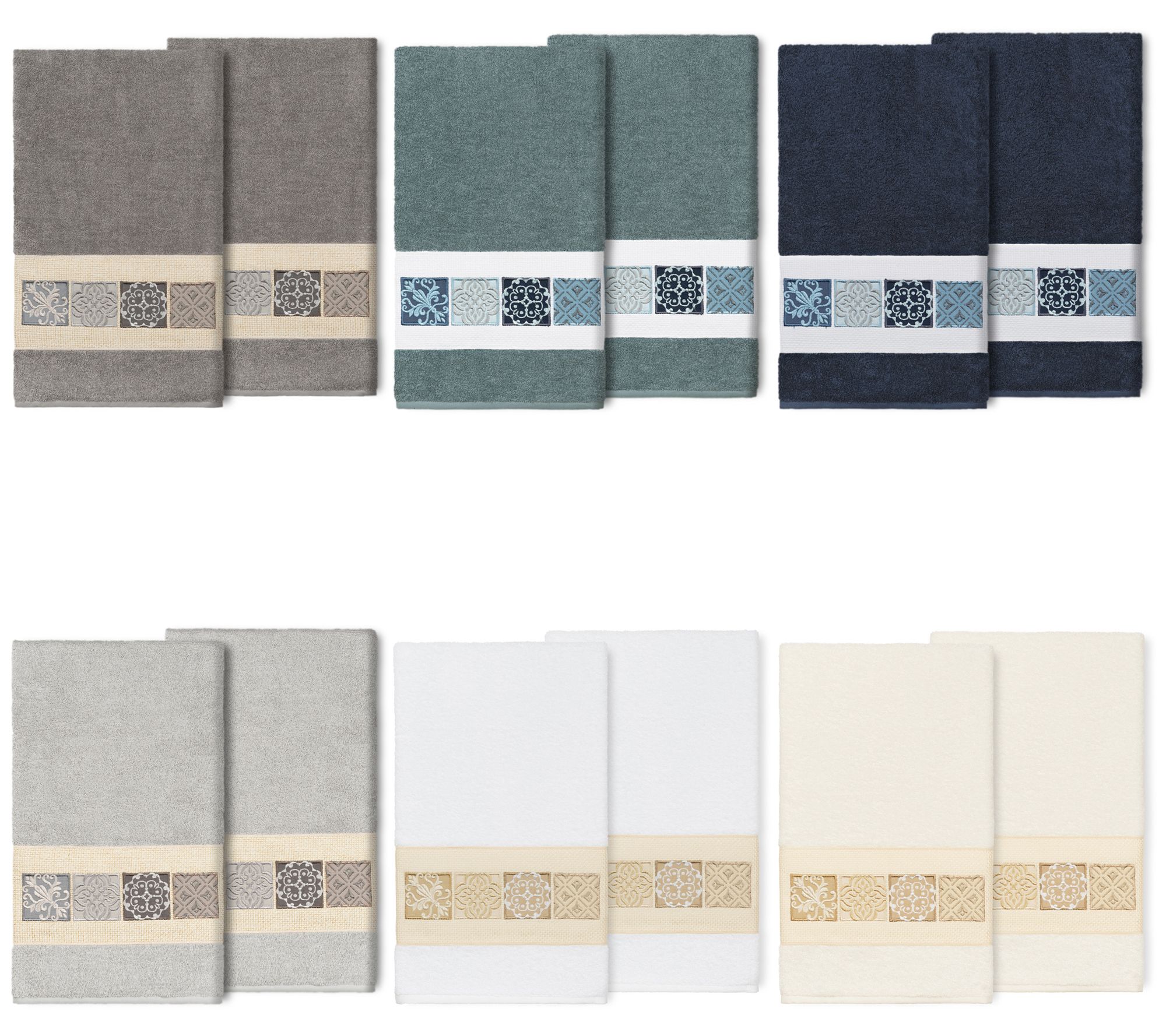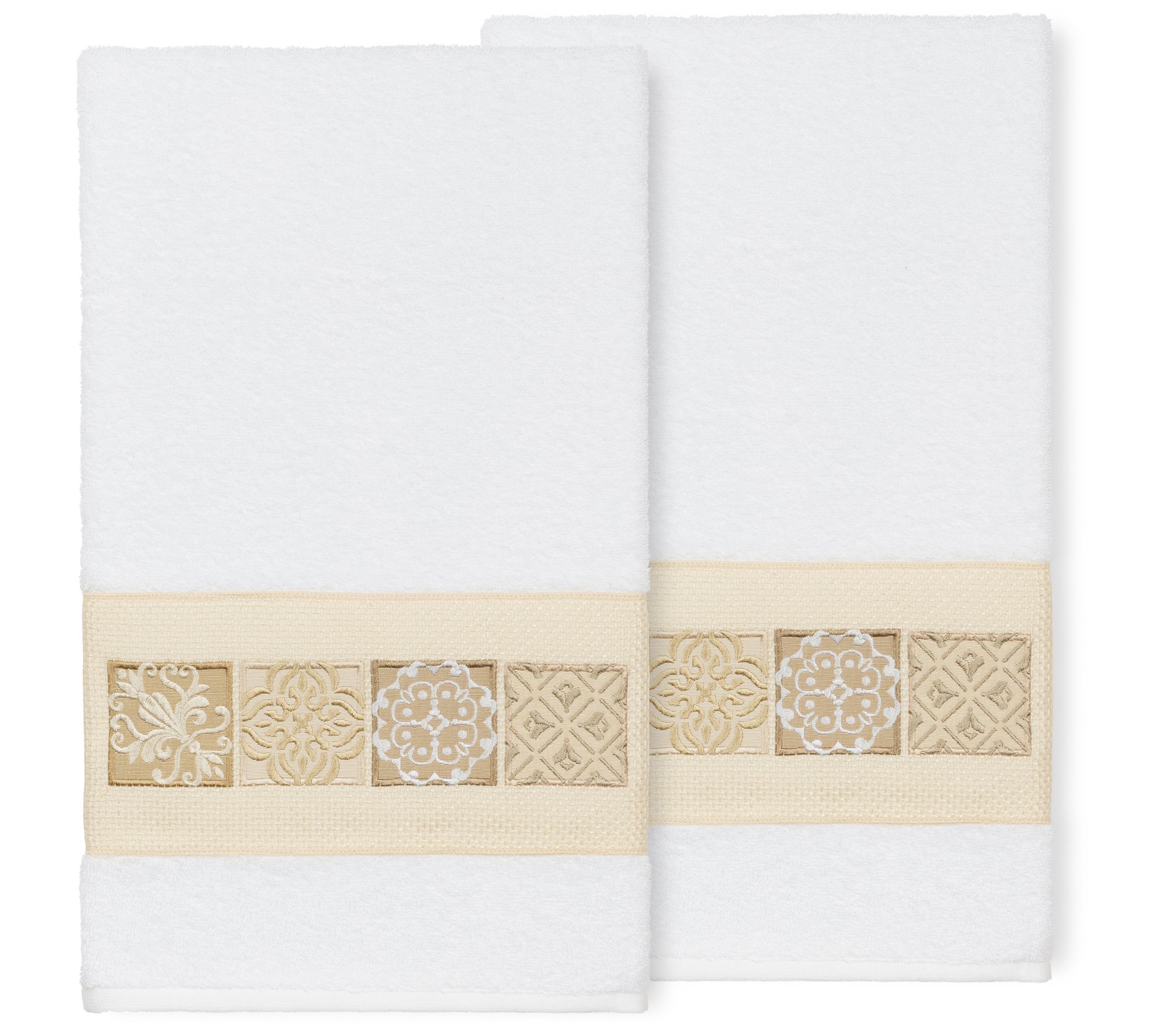 Cotton gives these towels their cuddly soft feel and super absorbent, quick-drying qualities. The classic embroidered tile pattern ensures they blend effortlessly into most any bath decor. From Linum Home Textiles.