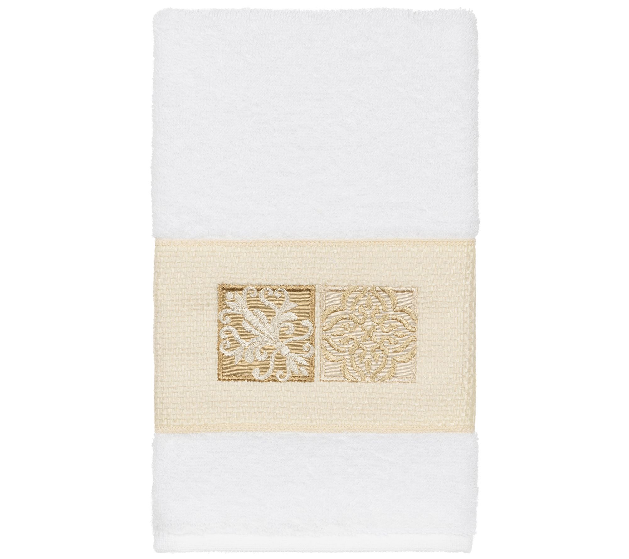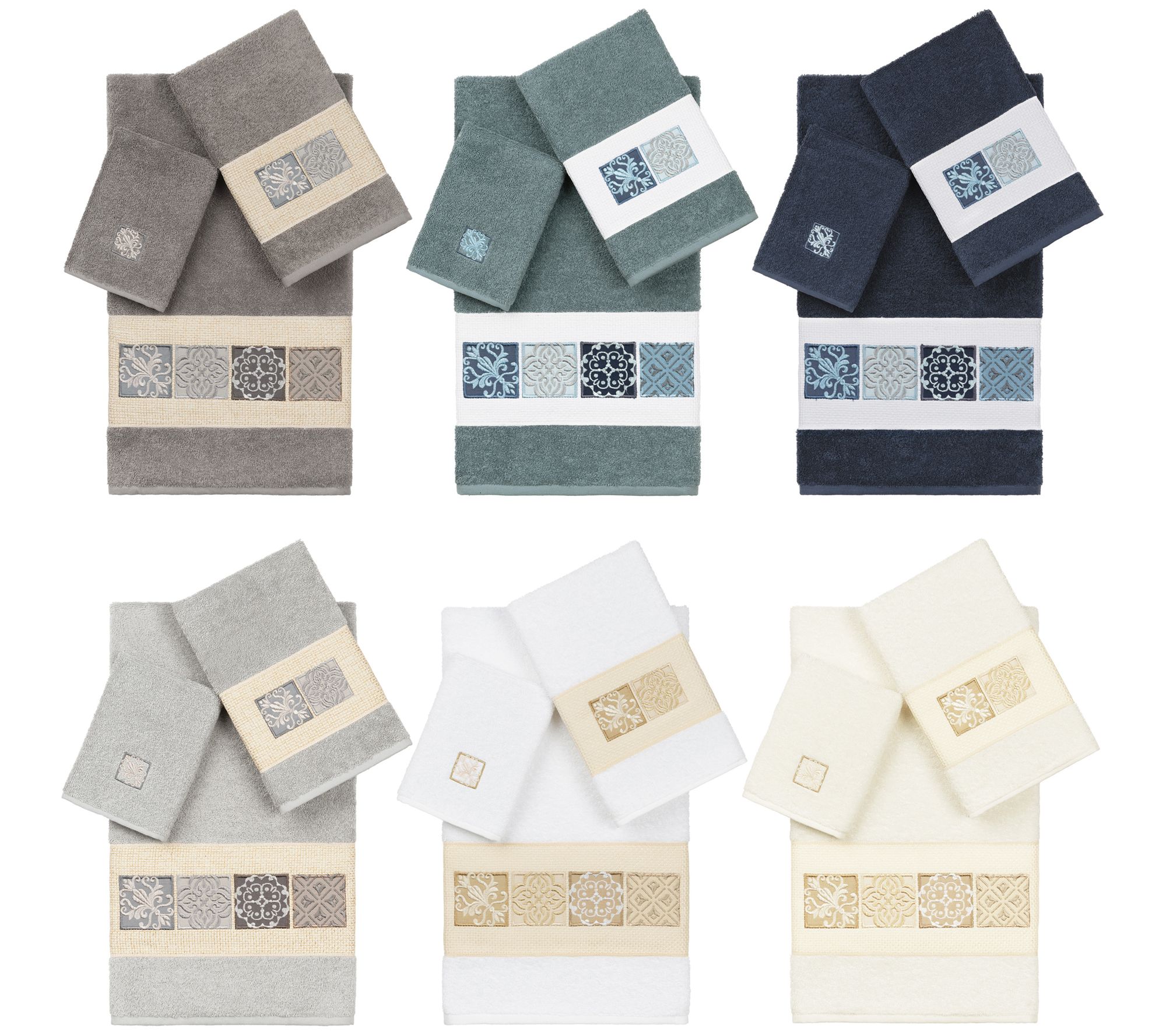 Cotton gives these towels their cuddly soft feel and super absorbent, quick-drying qualities. The classic embroidered tile pattern ensures they blend effortlessly into most any bath decor. From Linum Home Textiles.