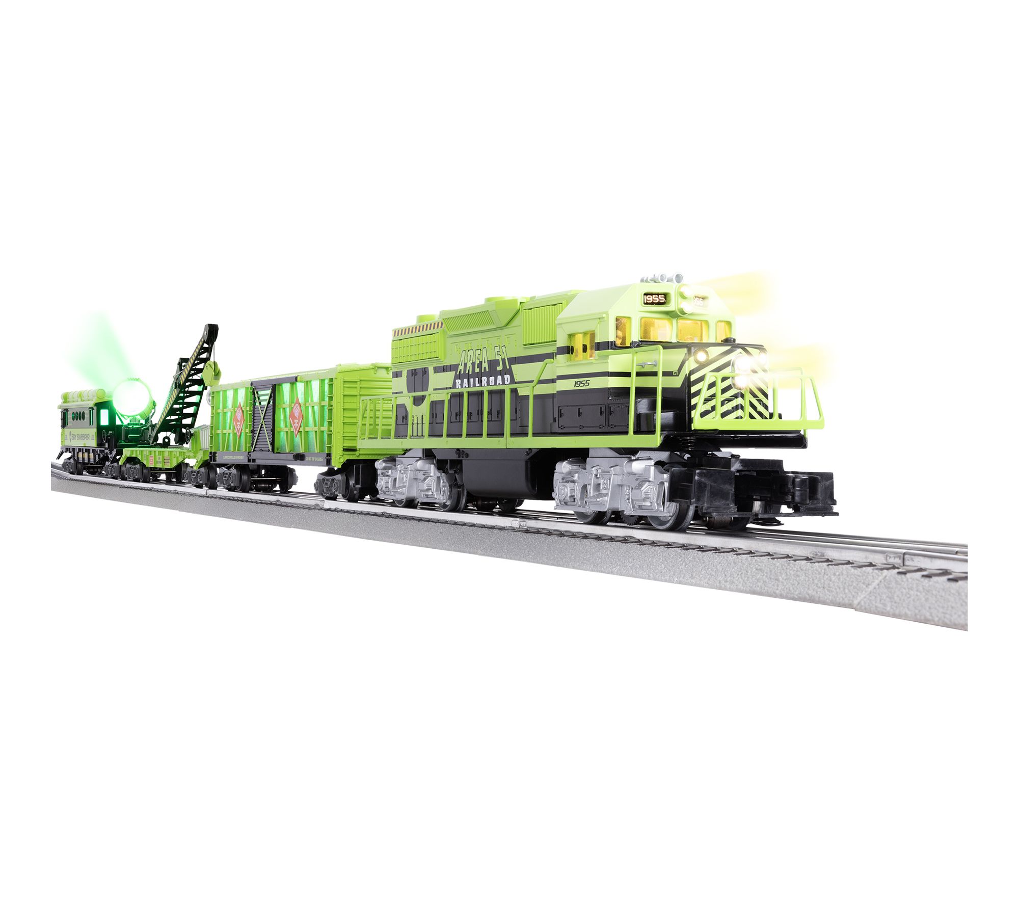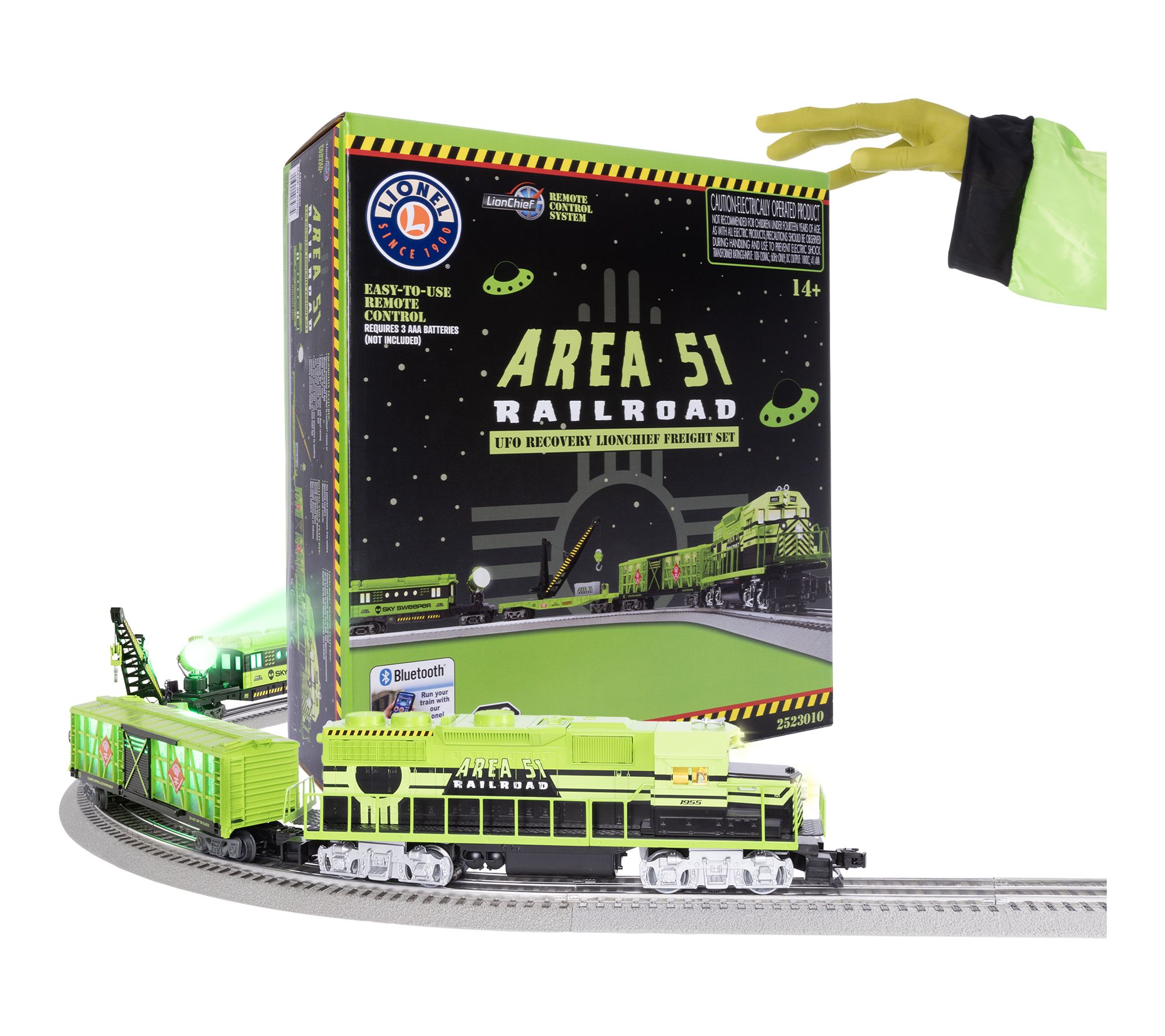 Includes Diesel Area 51 Locomotive, Damage Control Lighted Boxcar, UFO Recovery Derrick Car, Sky Surveillance Searchlight Caboose, eight curved O36 FasTrack sections, two straight ten inch FasTrack sections, terminal FasTrack section, Plug-Expand-Play Power Lock-on section, wall-pack power supply, and LionChief remote