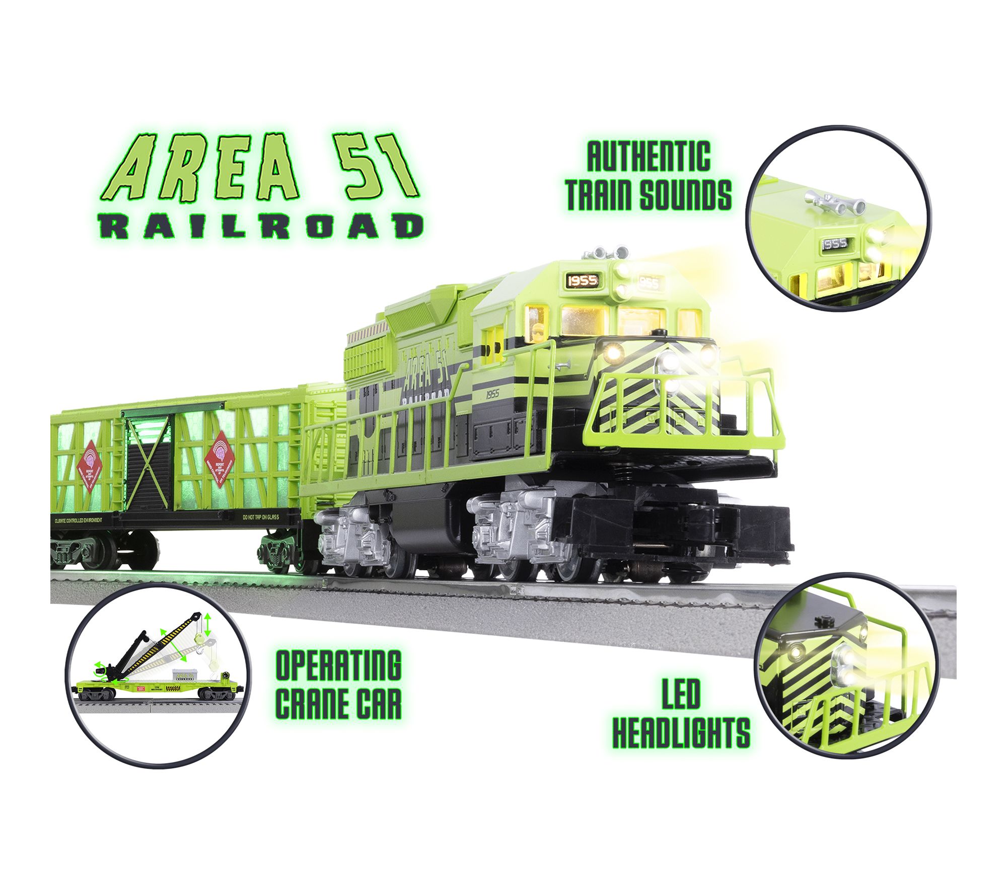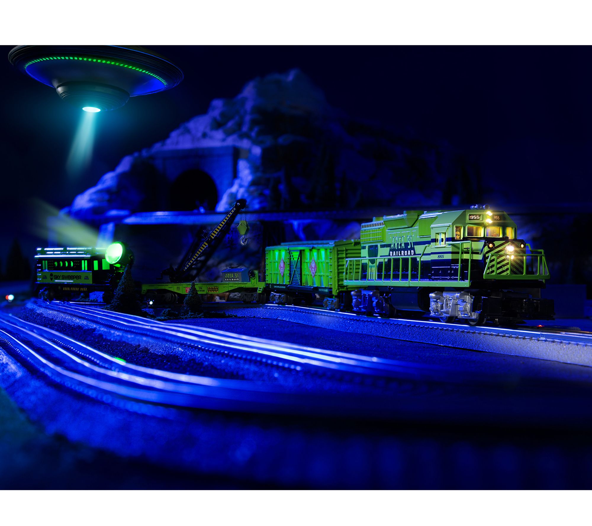 Embark on an intergalactic adventure as you command this Area 51 UFO Recovery train set, complete with Bluetooth control and immersive sound effects. Whether you're orchestrating daring rescue missions or exploring mysterious cargo, each run brings excitement to your layout with lighted cars, remote operation, and interactive features. From Lionel.