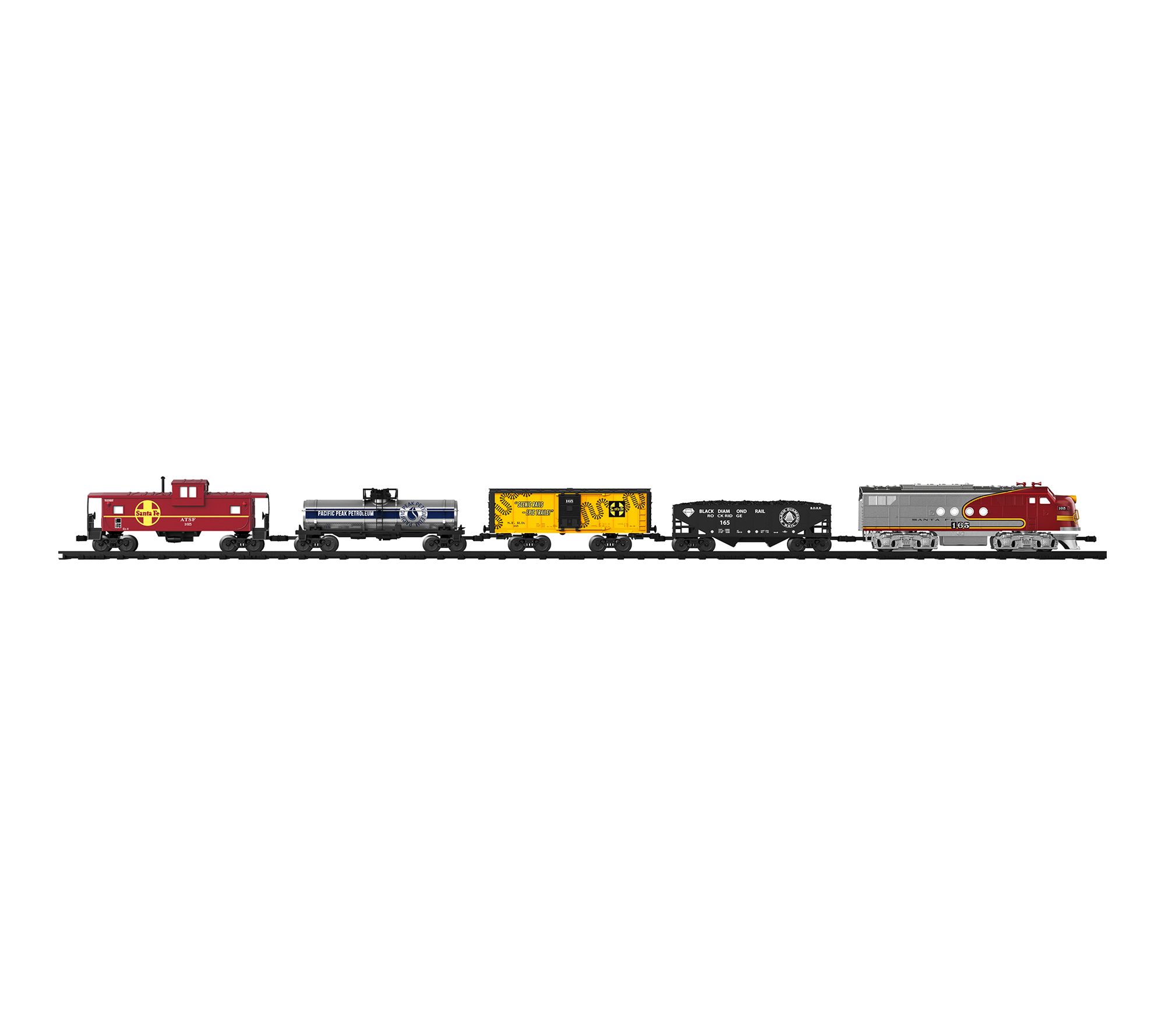 Includes battery-powered engine, hopper, boxcar, tank car, caboose, remote control, 10 straight O Gauge track pieces, 16 curved O Gauge track pieces, 2 right interchange switches, 2 left interchange switches, figure 8 crossover track piece, water bottle dropper, 4 road signs, 2 trees