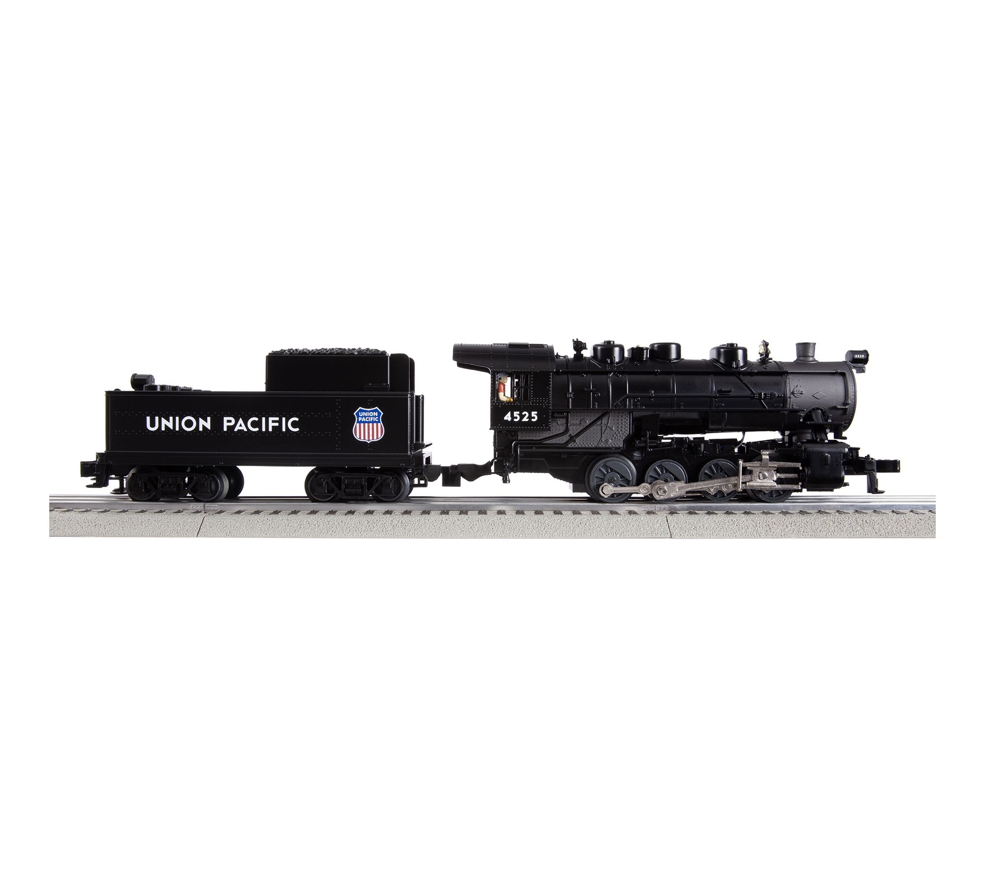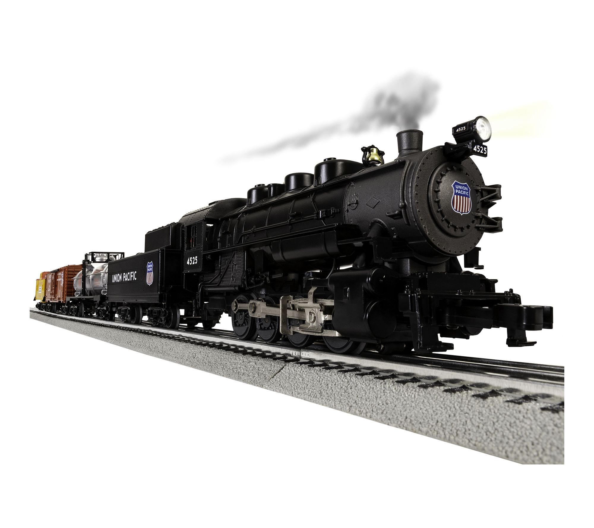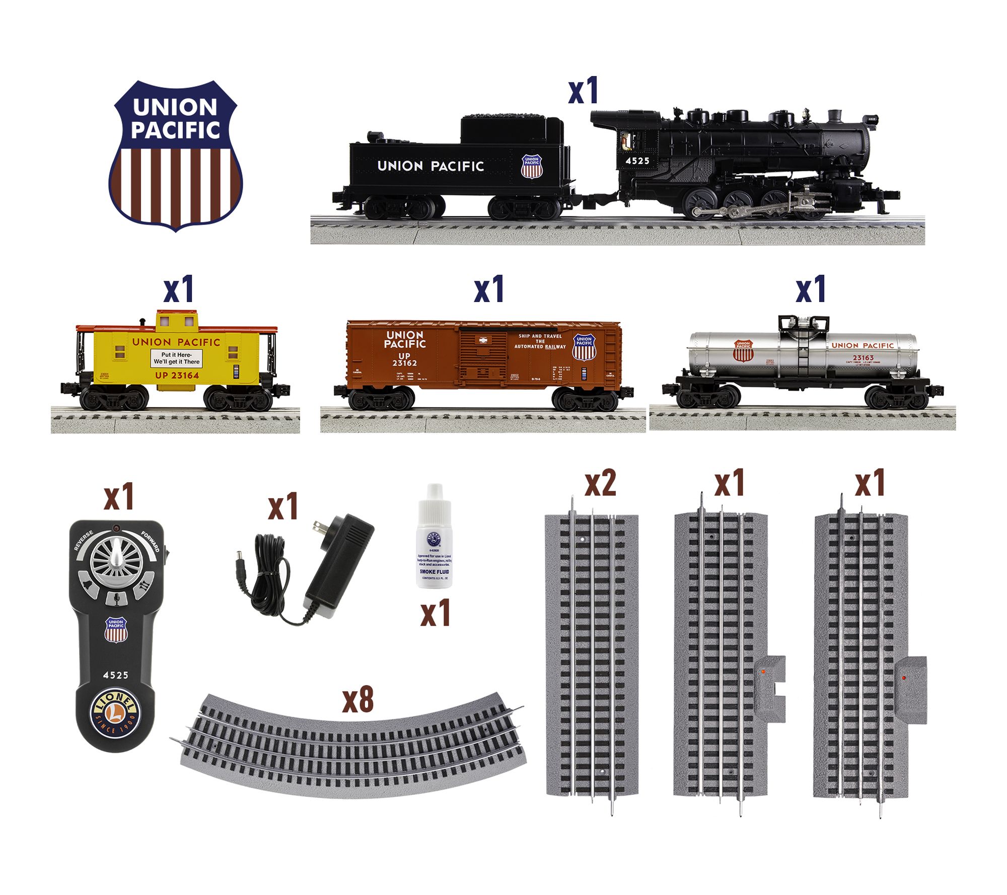 Includes 0-8-0 Steam Locomotive, Tender, Union Pacific Boxcar, Union Pacific Tank Car, Union Pacific Caboose, eight curved O36 FasTrack sections, two straight 10" FasTrack sections, Terminal FasTrack section, Plug-Expand-Play Power Lock-on section, Wall-pack Power Supply, LionChief Remote for Locomotive