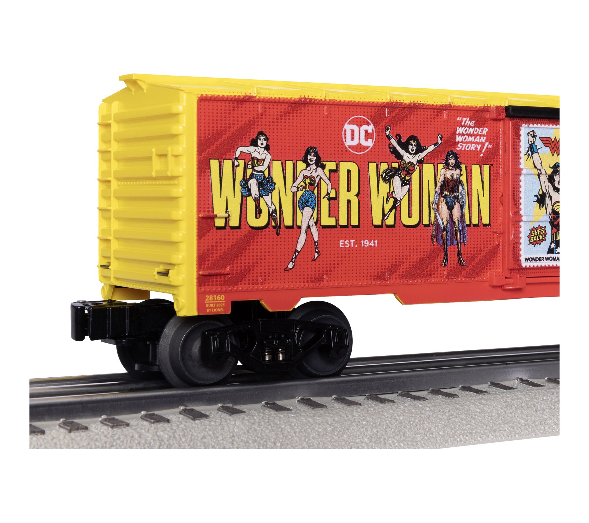 Add a pop of superhero flair to your train collection with this Wonder Woman boxcar. Crafted with die-cast metal trucks and operating couplers, it features opening side doors for interactive fun and is compatible with Lionel O Gauge sets. From Lionel.