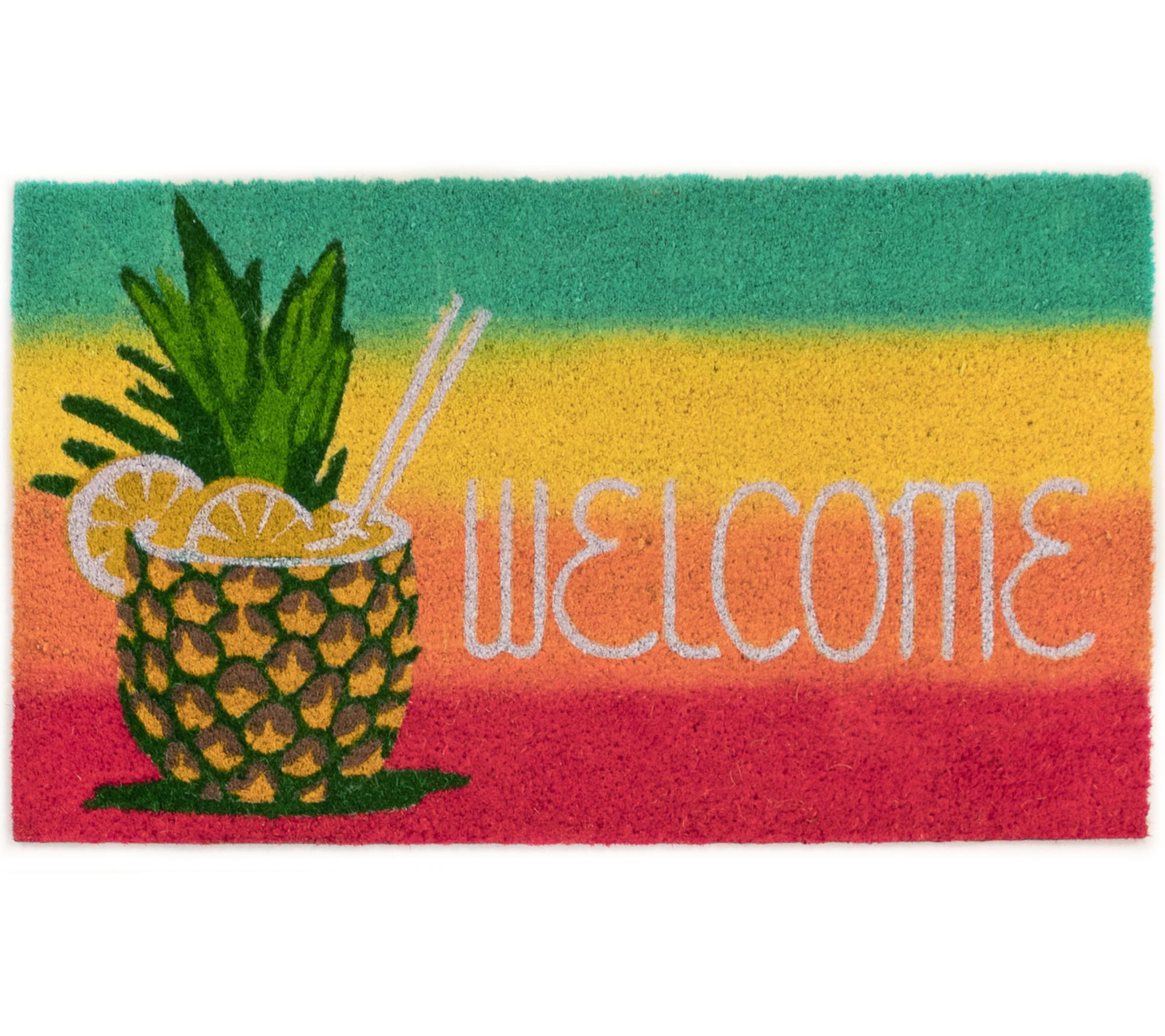 A traditional symbol of welcome, this pineapple design goes a step further, dressed as a tropical drink to welcome guests while providing a coir mat to wipe their feet. From Liora Manne.