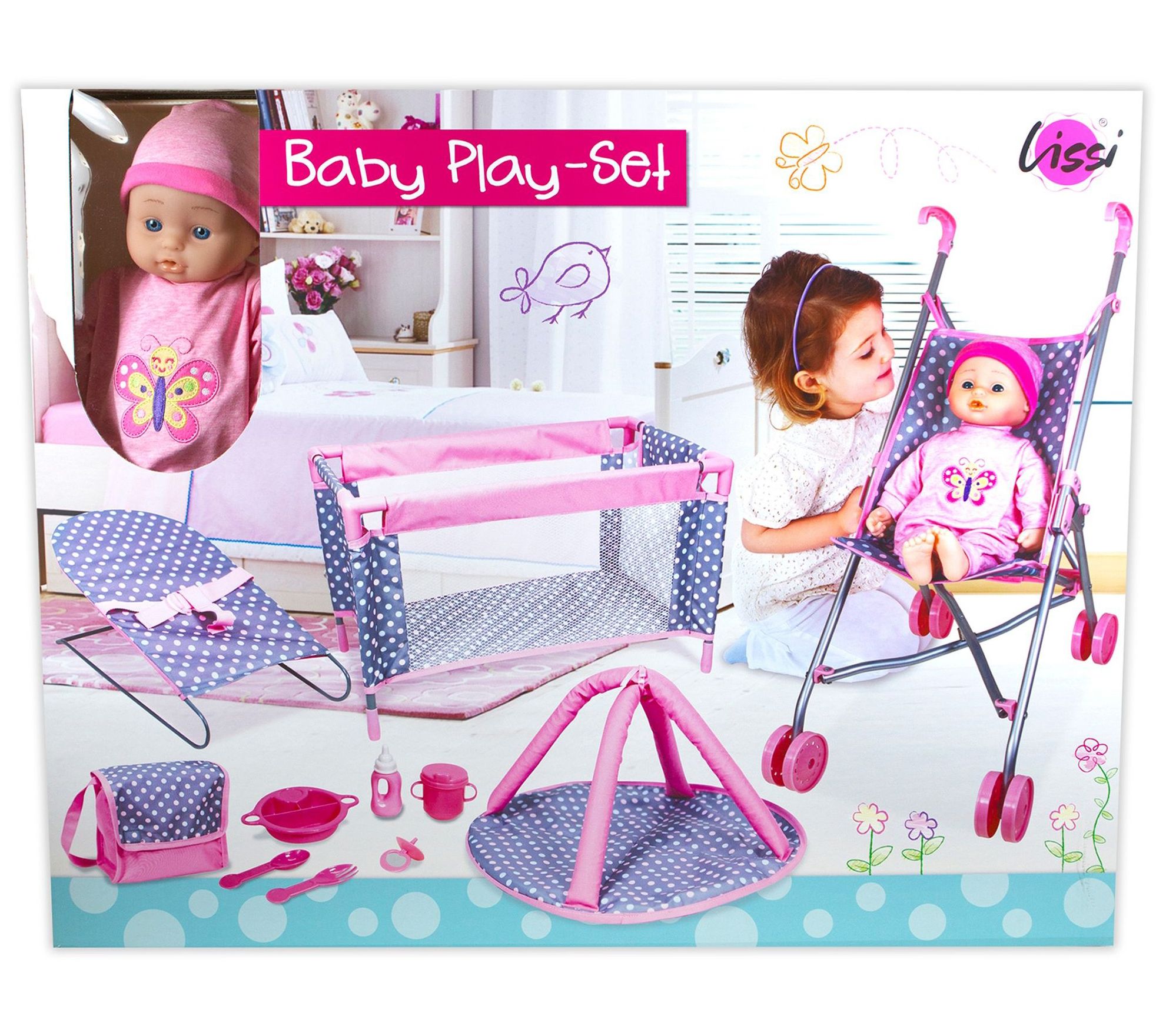 This play set has everything your child needs to take care of her baby. Take her for a spin in the stroller, let her take a nap on the travel bed, or rock her in the bouncer for hours of playtime fun. From Lissi Doll.