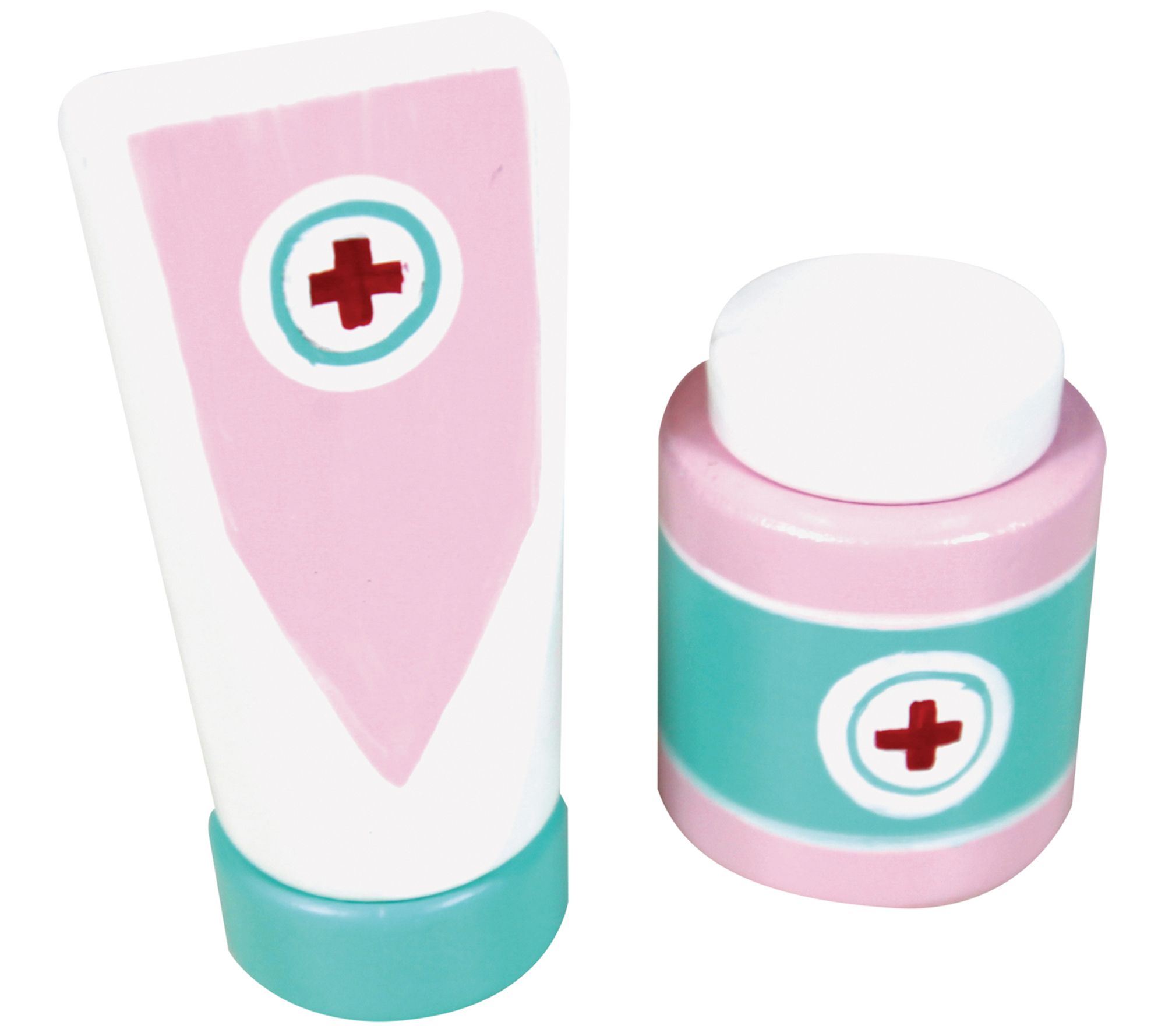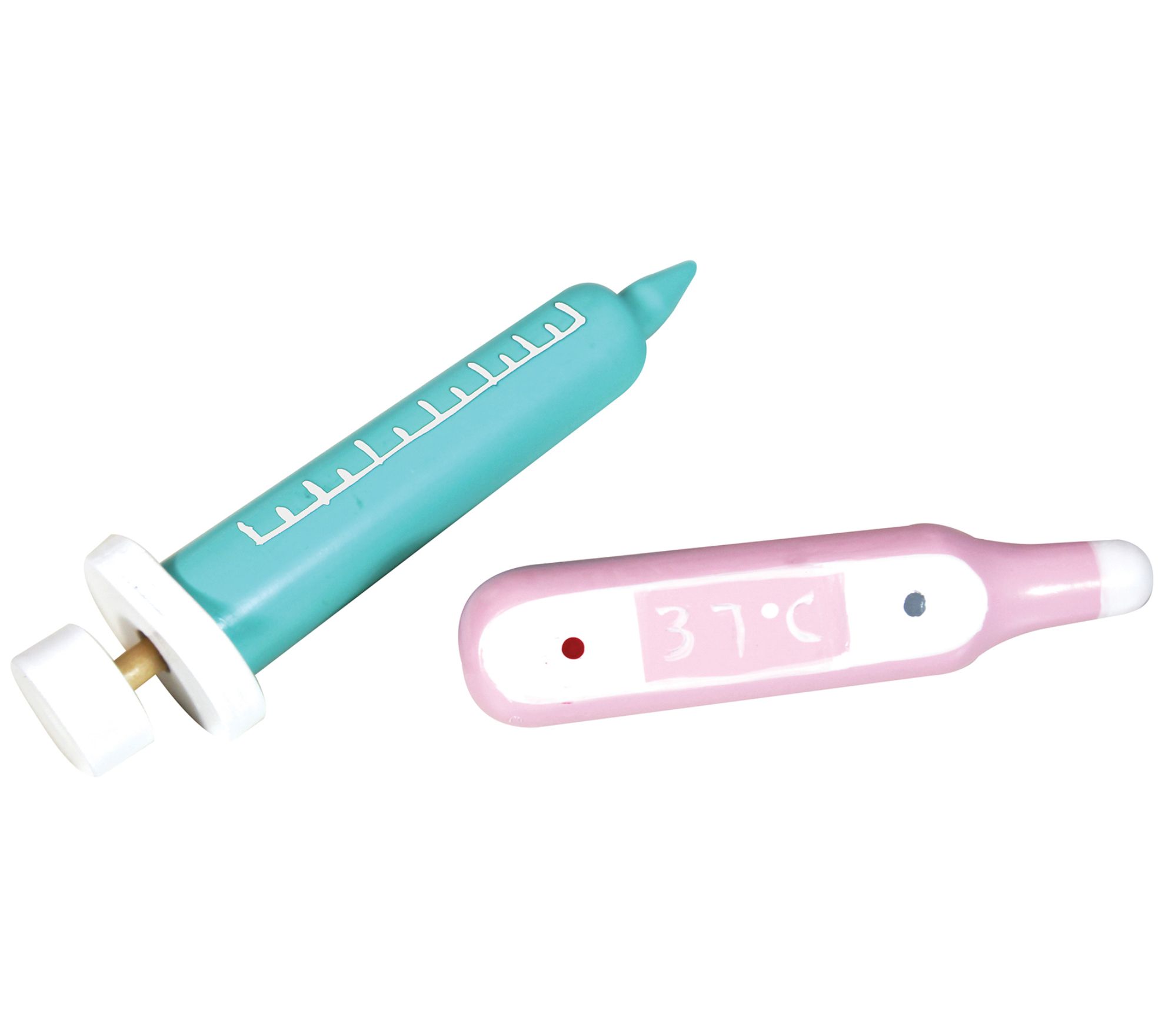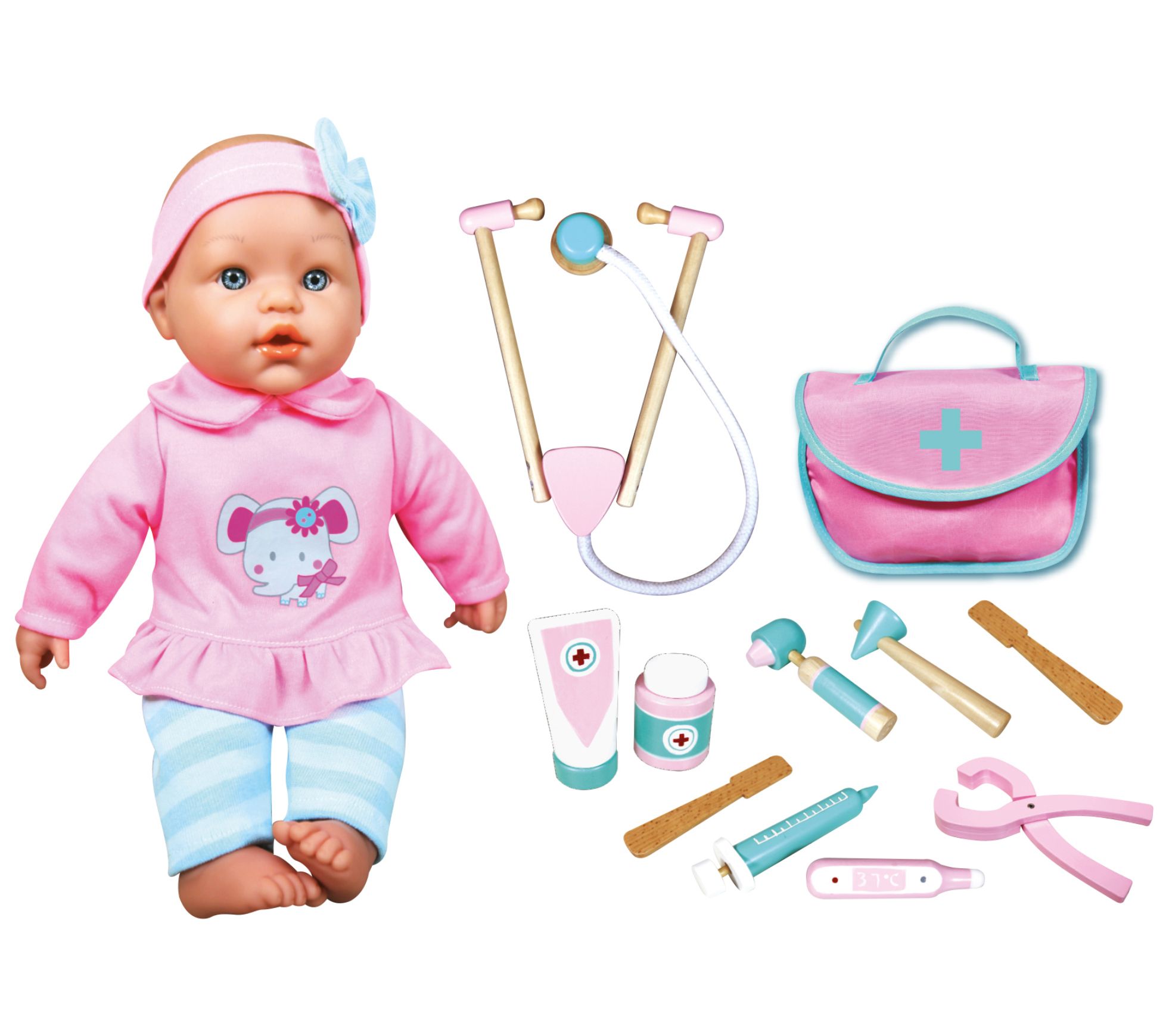 • Includes doctor baby, stethoscope, bottle, container, syringe, thermometer, otoscope, testing hammer, clip, surgical clip, spoon, and bag