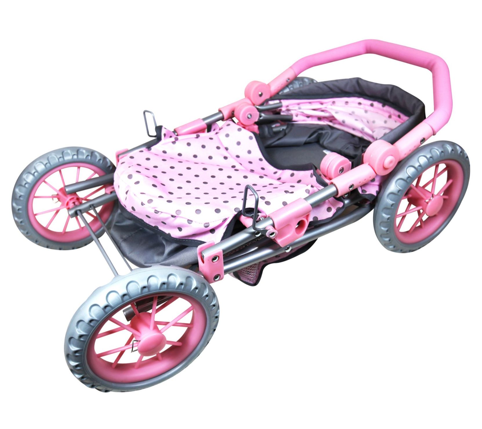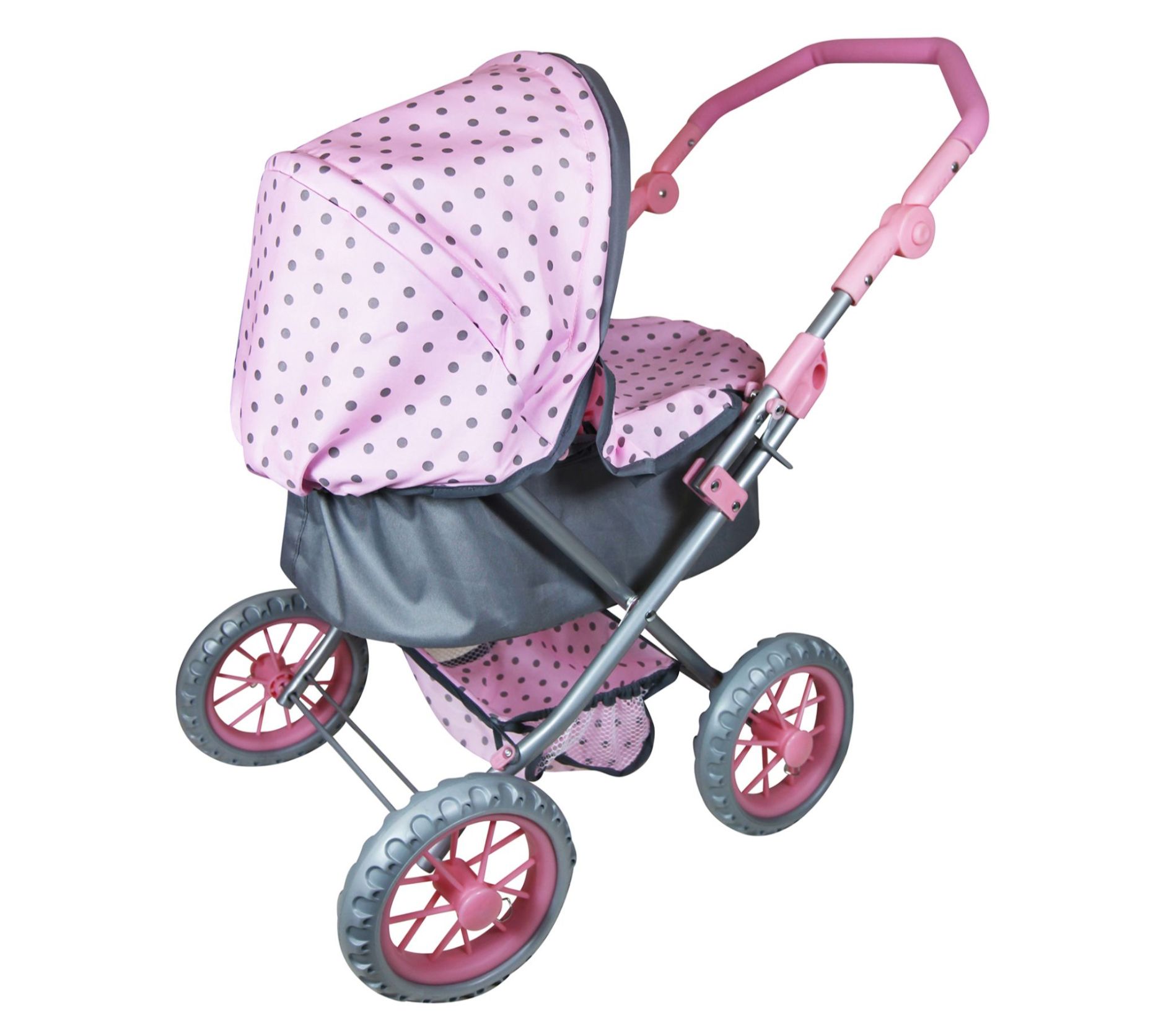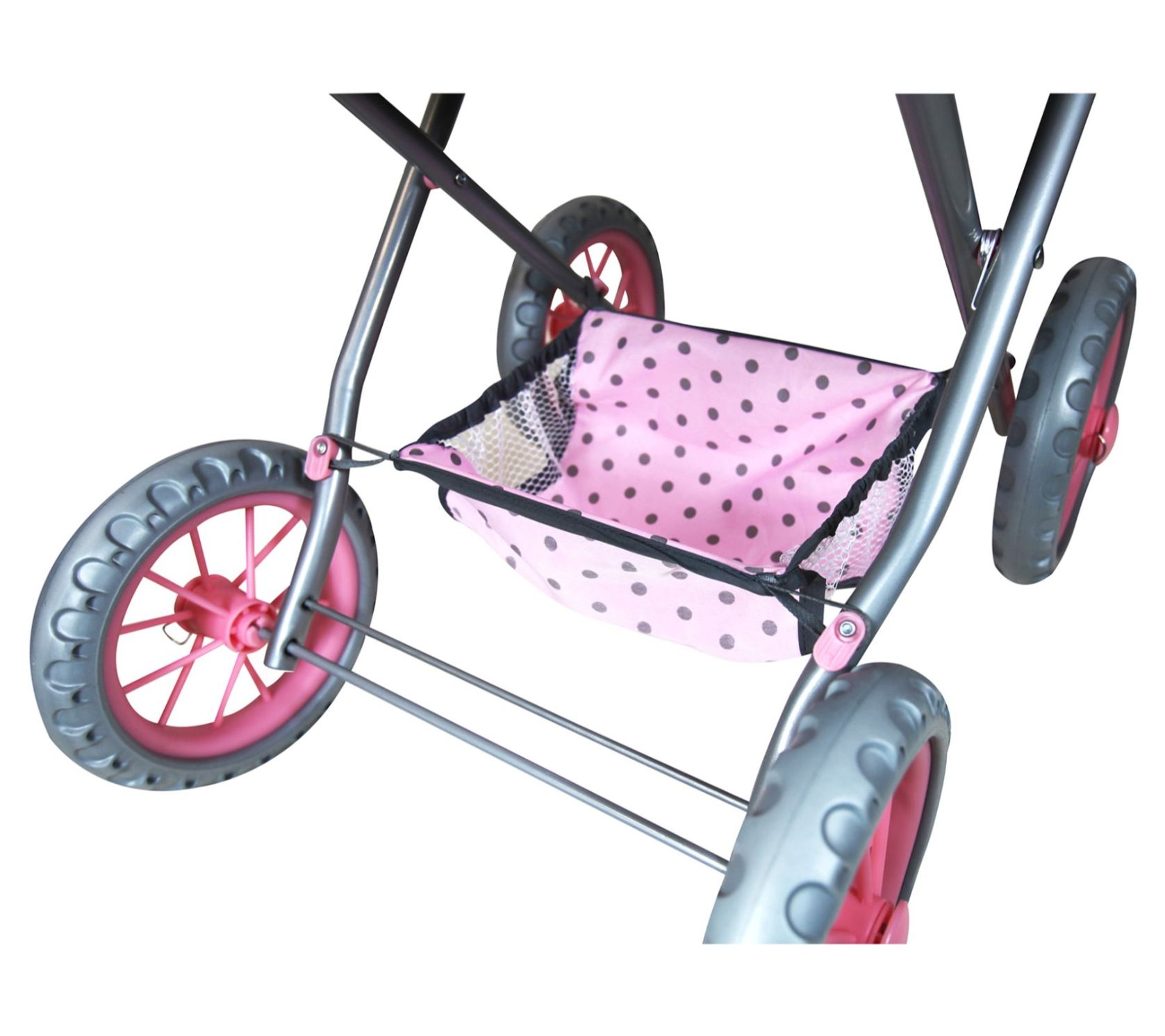 Your little one will love to roll around town with their favorite doll tucked away in this pretty pink doll pram complete with a matching shopping basket and changing bag. From Lissi.