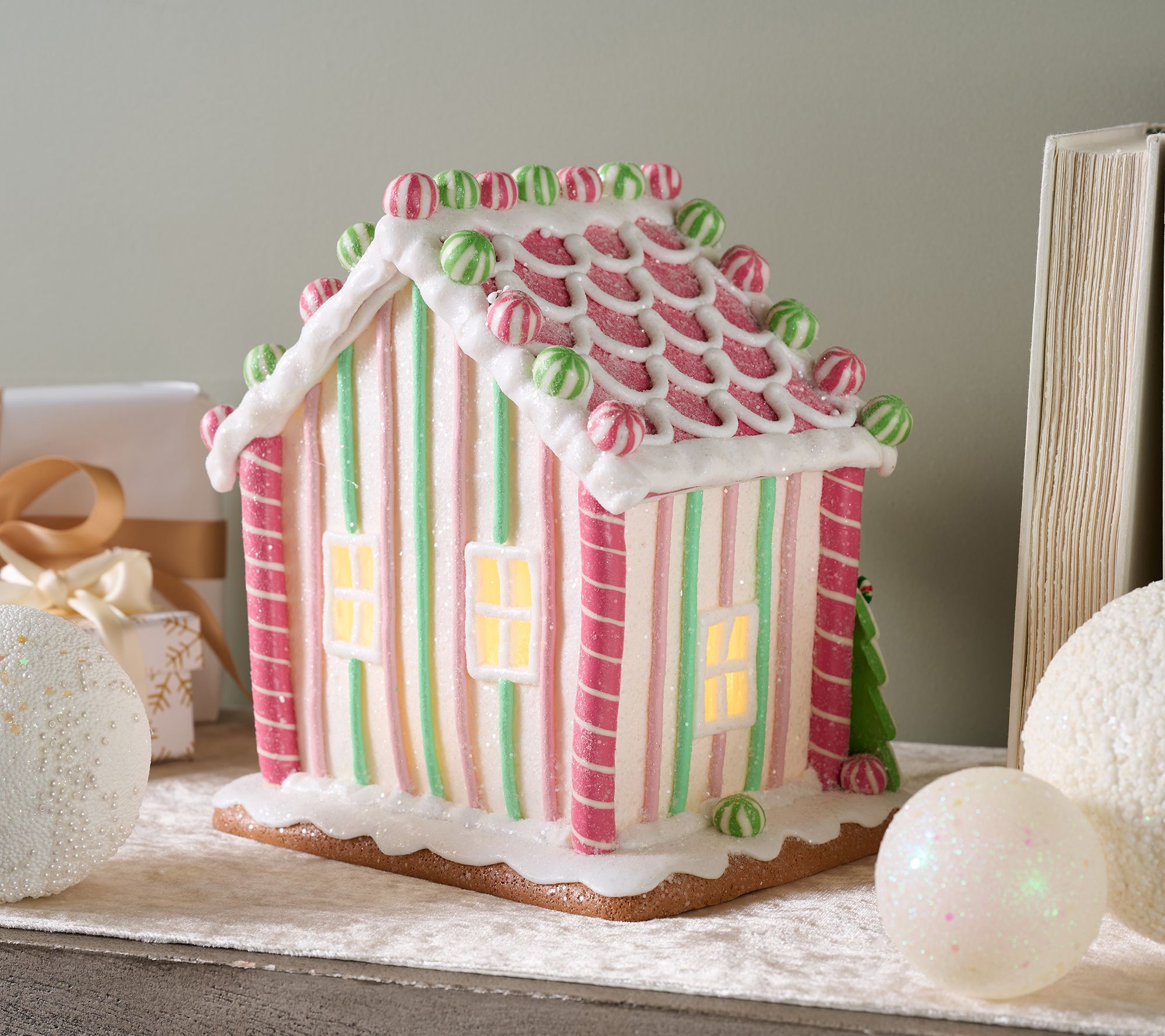 Bring the charm of the holidays to your home as this candy-striped gingerbread cottage glows with warmth from within. Whether nestled on a mantel or welcoming guests from your entryway table, its playful peppermint accents and cheerful figures add a spirited touch to festive gatherings. From the Valerie Parr Hill Collection.
