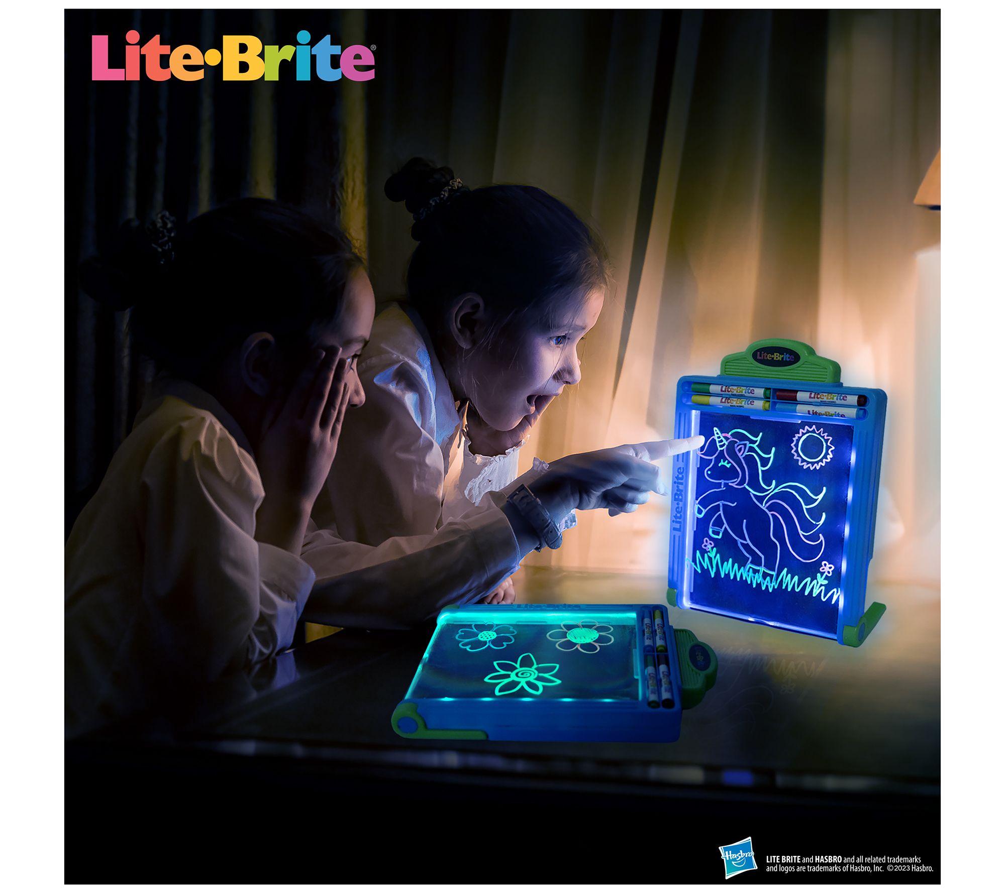 Celebrate creativity with your kiddos (and being young at heart!) with this set of two Lite Brite Glow Deluxe Power Boards and markers. Interactive LED lights illuminate your artwork at home or on the go. Want to create something new? Just wipe the screen with the included squeegee and start again! From Lite Brite.