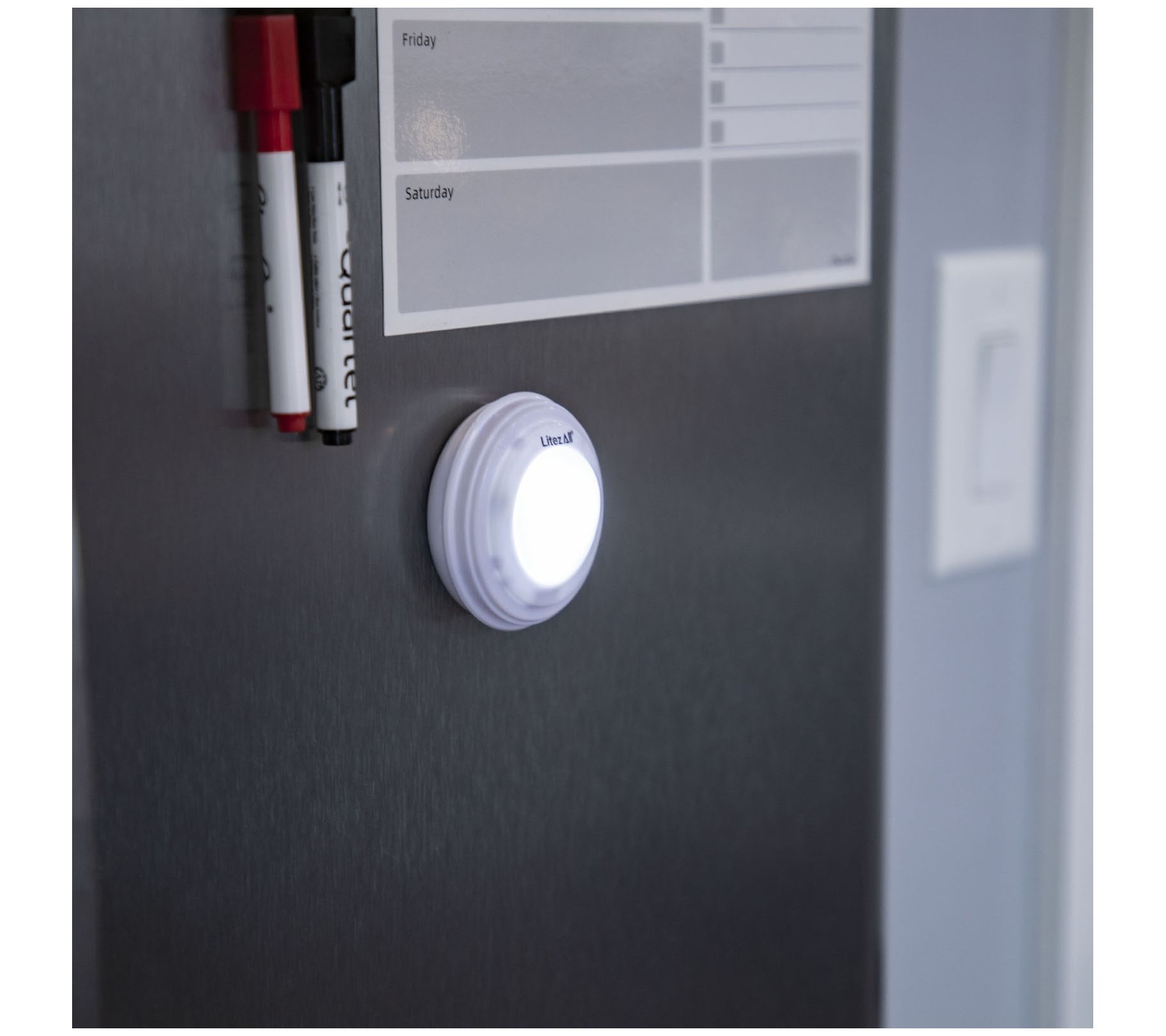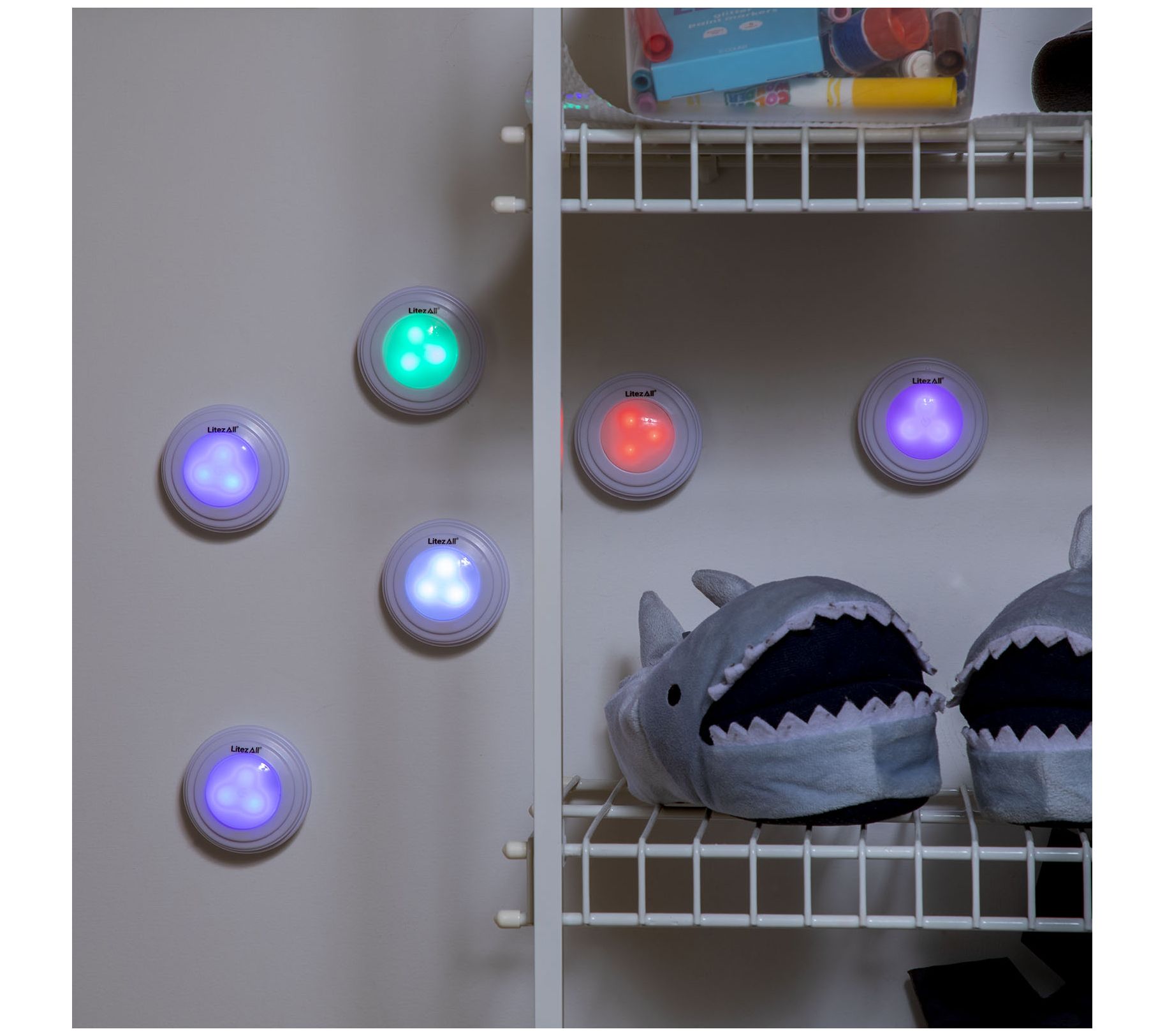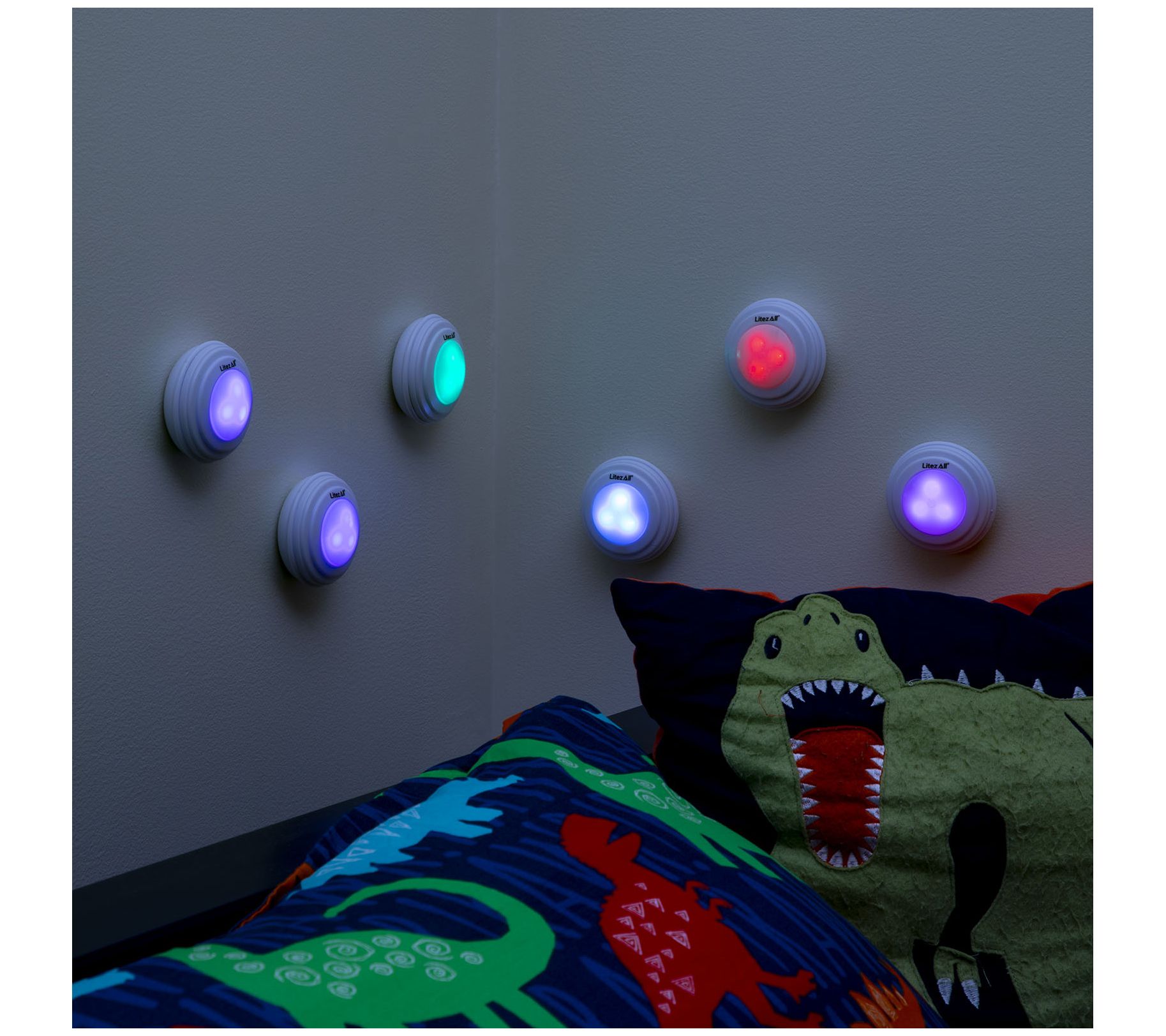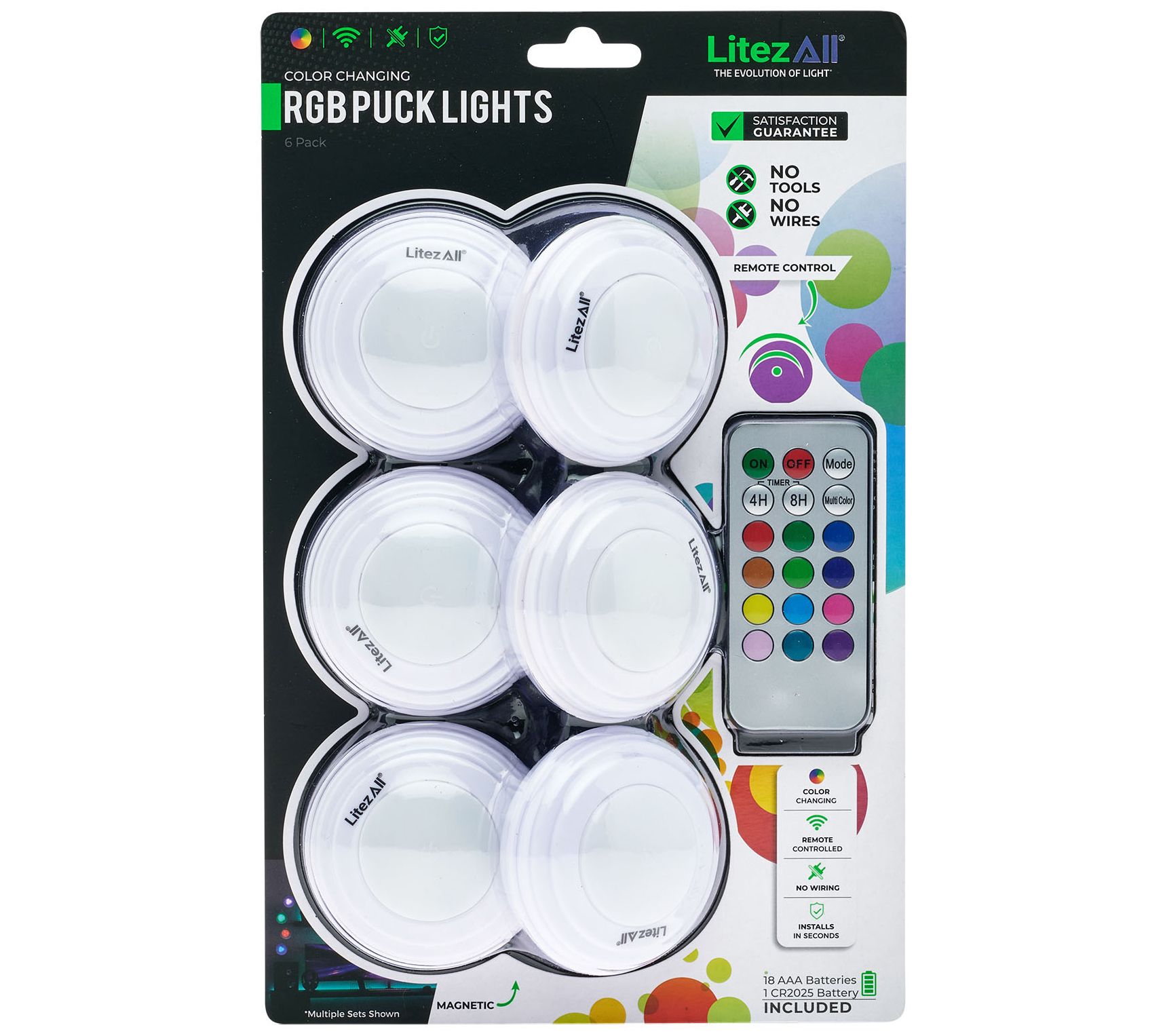 • Includes six RGB puck lights with remote control and 18 AAA batteries