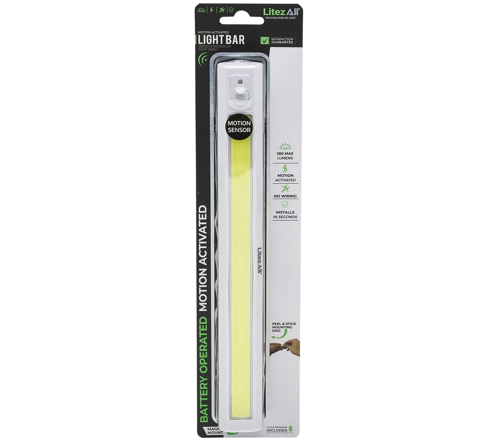 • Includes COB LED motion-activated jumbo light bar, mounting hardware, and four AAA batteries