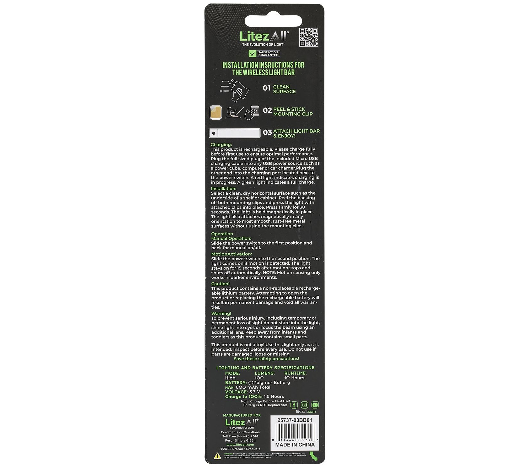• Includes rechargeable motion-activated light bar, mounting clip, and micro USB charging cable