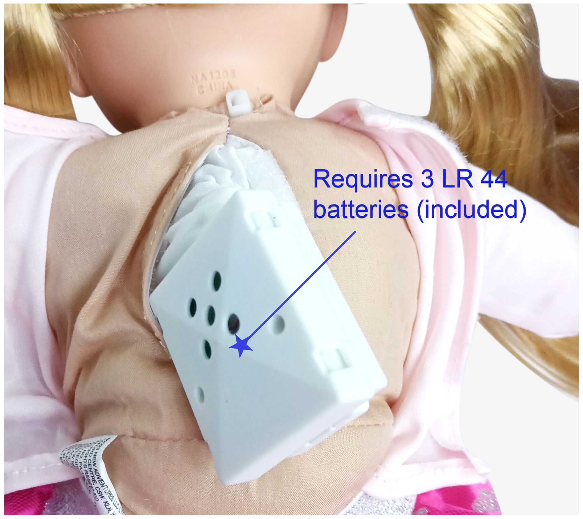 • Includes doll, comb, songbook, and three LR44 batteries