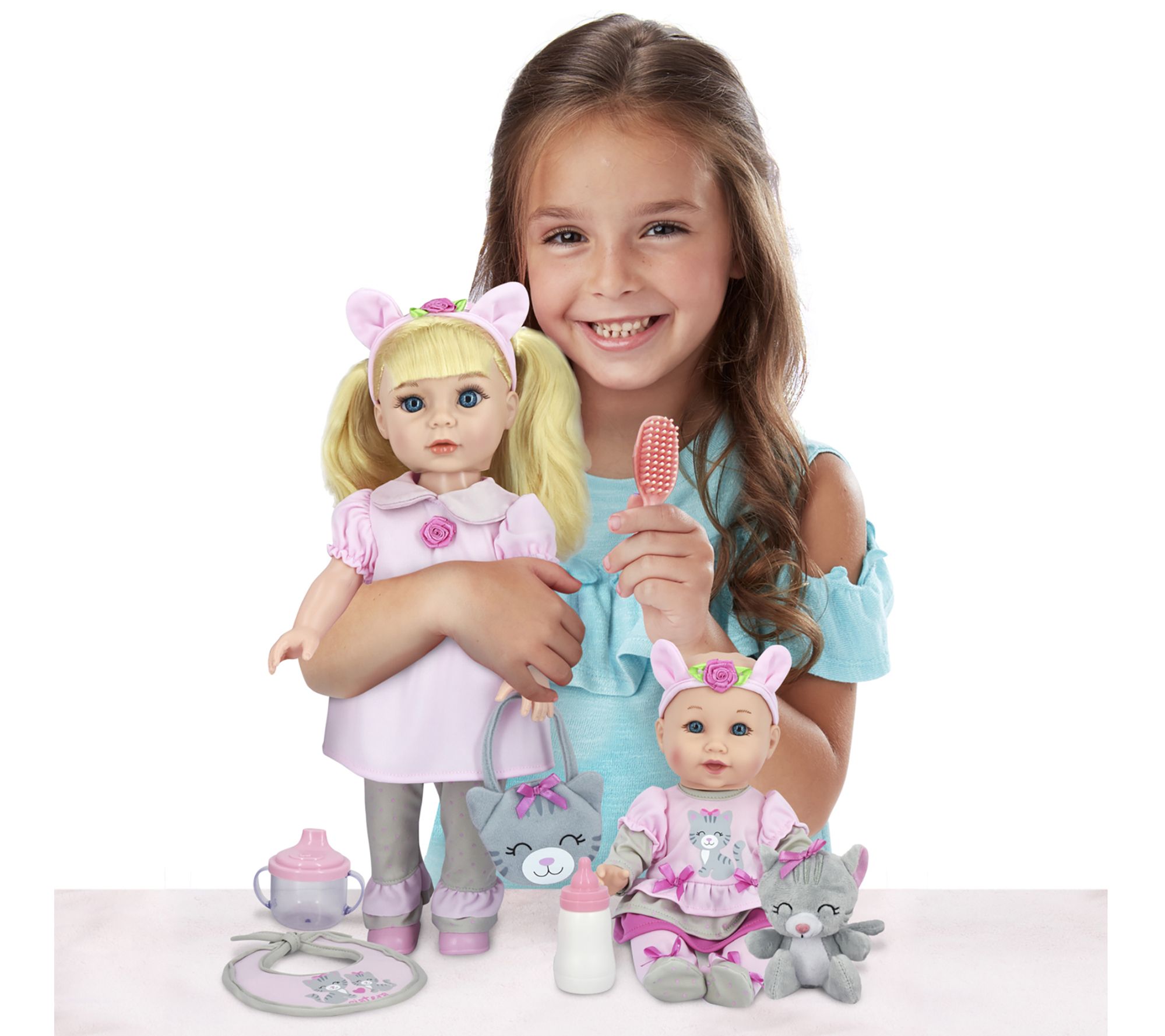 • Includes little girl doll, baby doll, two stuffed cats, sippy cup, bottle, hair brush, and bib