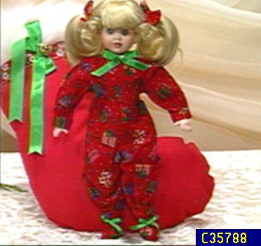 Little Holly Noel has blonde hair and green eyes. She is wearing a Christmas print jump suit trimmed at the neck with a green ribbon and faux pearl at center front. The doll peeks out of a red velvet Christmas stocking trimmed with white fur, a green bow and a bell. Cert. of auth. and hang tag. Meas. approx. 10"H. Porcelain head, hands and feet. Limited to 1500. Made in Taiwan.