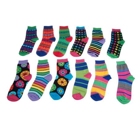 If life is a circus, you're the ringmaster. Slip on a pair of these Zany Circus crew socks and celebrate your unique style. Fashioned with zany hearts, circus stripes, and peace, love, and happiness designs, this 12-pack of mismatched yet coordinating socks offers up to 66 different combinations to choose from. From Little MissMatched.