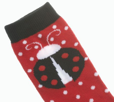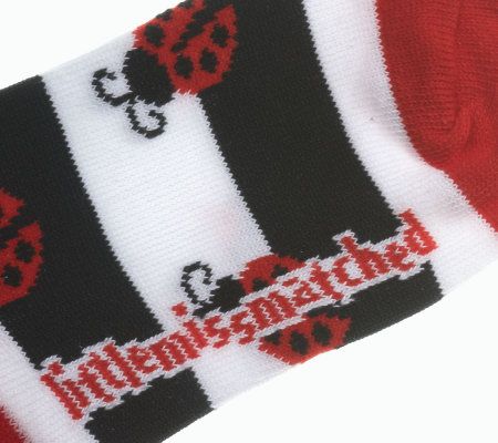 • Includes two three-packs of socks; one of black and white stripes with ladybugs and one of polka dots with ladybugs