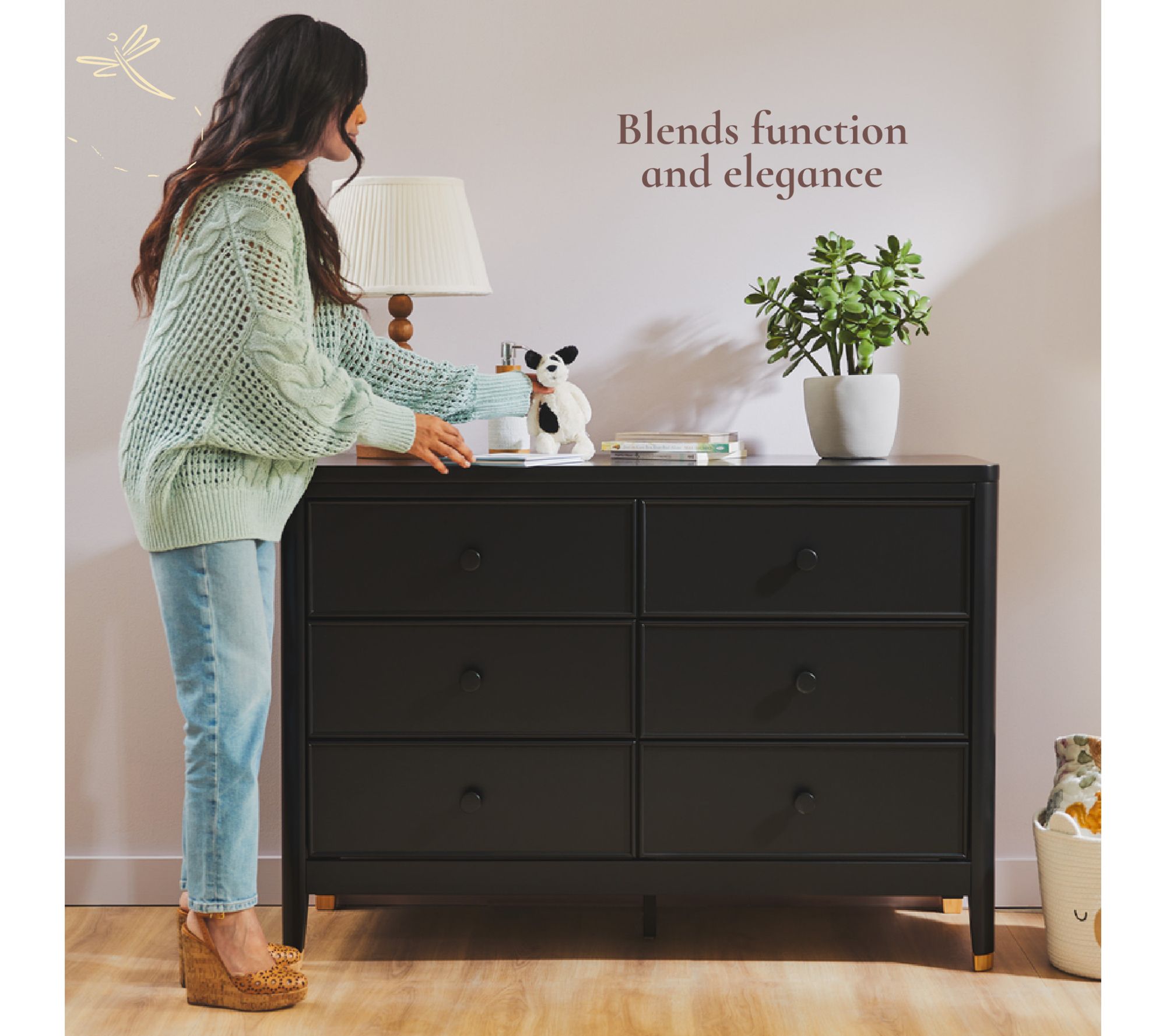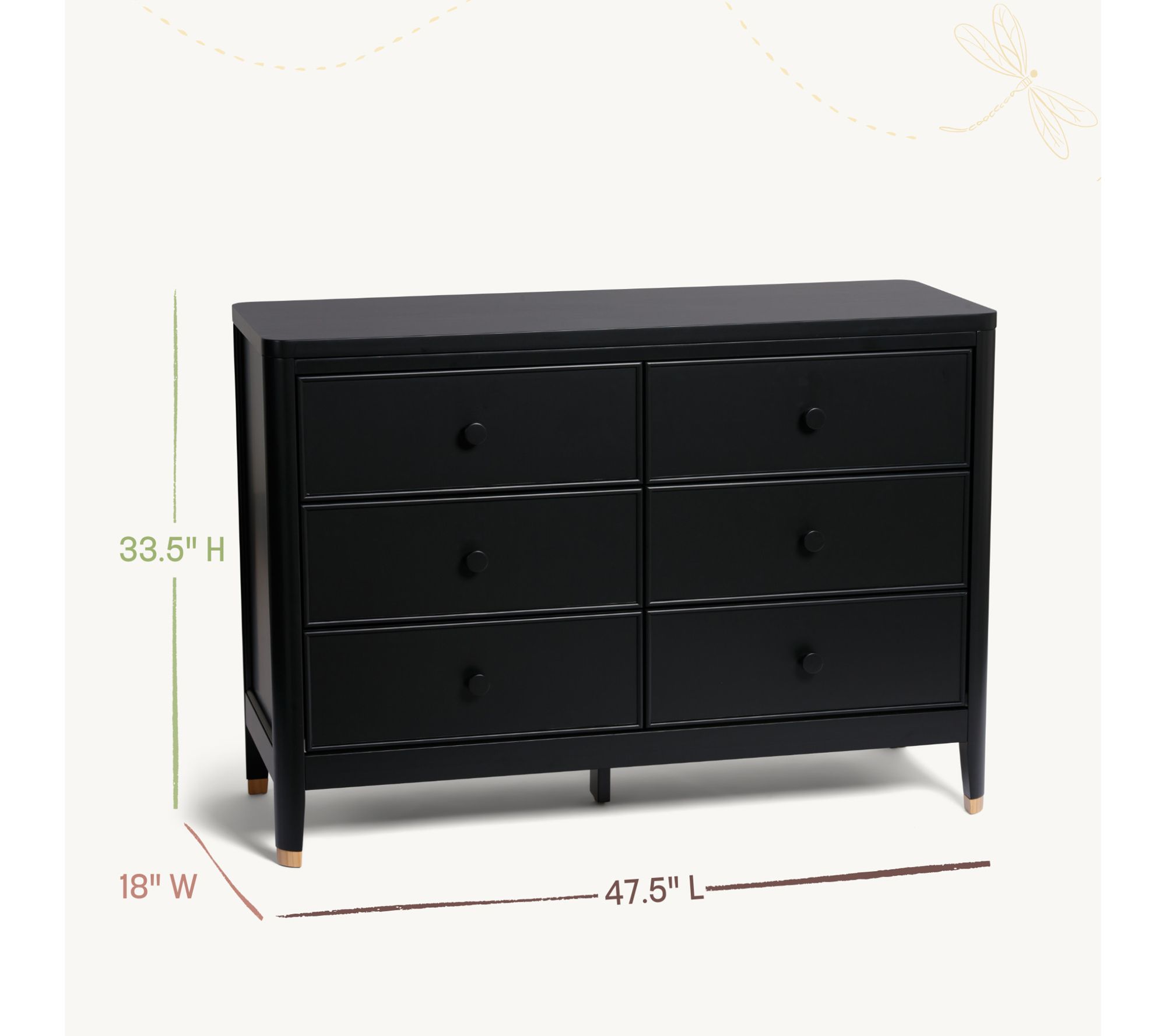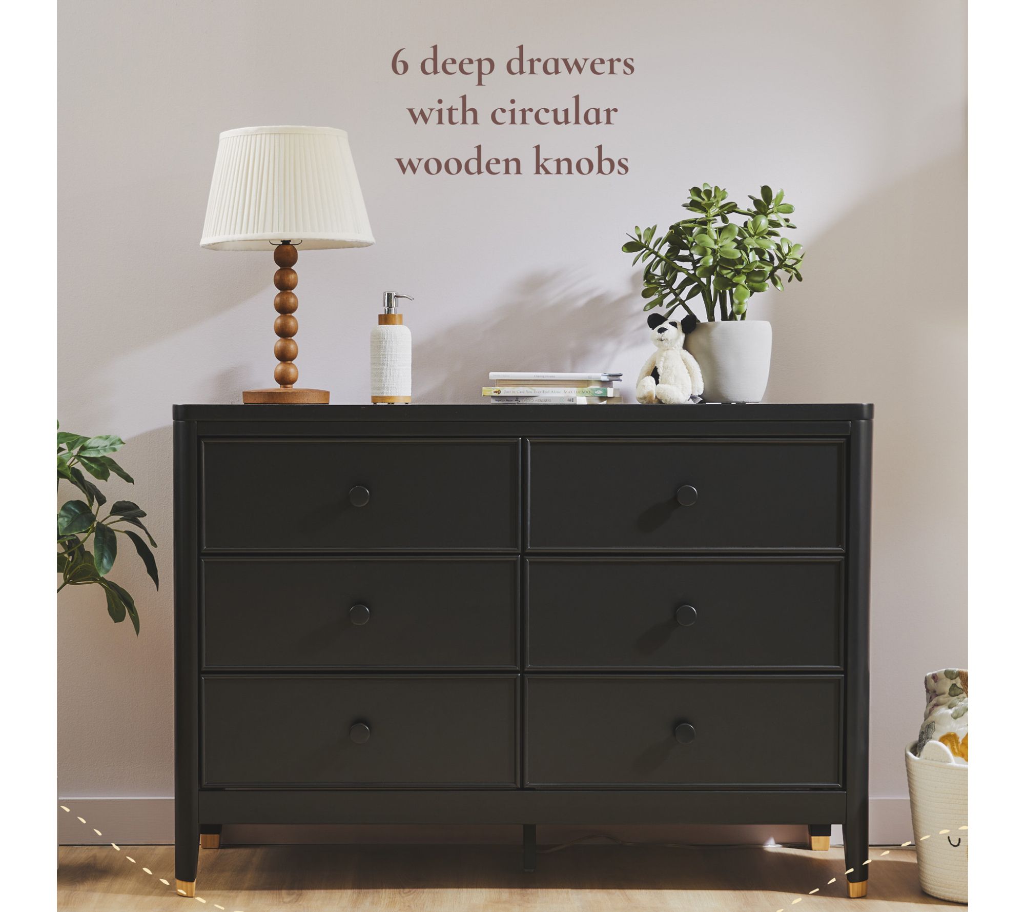 Elevate your nursery or bedroom with the Little Seeds Aster six-drawer dresser, designed for plenty of storage and undeniable style. Thoughtfully crafted from pine and composite wood, this dresser blends function and elegance with framed drawer fronts, rounded trim, and chic contrasting wooden tips on its tapered feet. Circular wooden knobs add a clean, classic finish, coordinating beautifully with other pieces in the Aster collection. From Little Seeds.