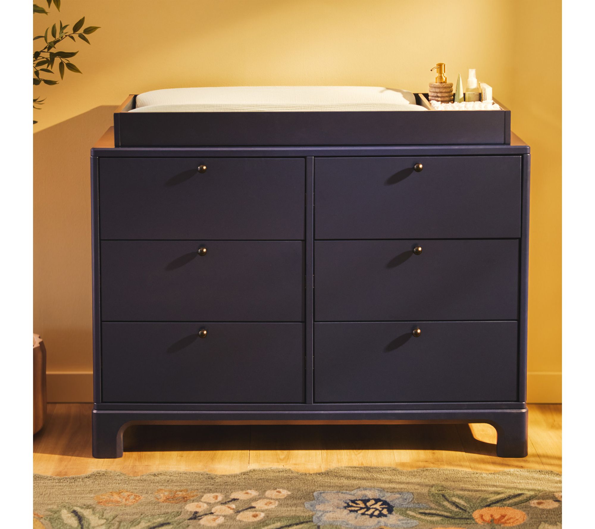 Transform your double dresser into a practical changing station with this changing table topper in deep blue -- designed with a handy storage compartment to keep wipes, creams, and diapers within arm's reach. Soft felt pads help preserve your furniture, and once your little one outgrows diaper changes, simply remove the topper for a new look. From Little Seeds.