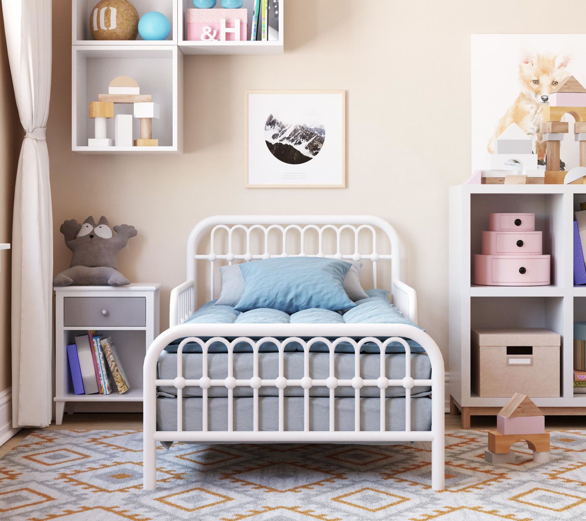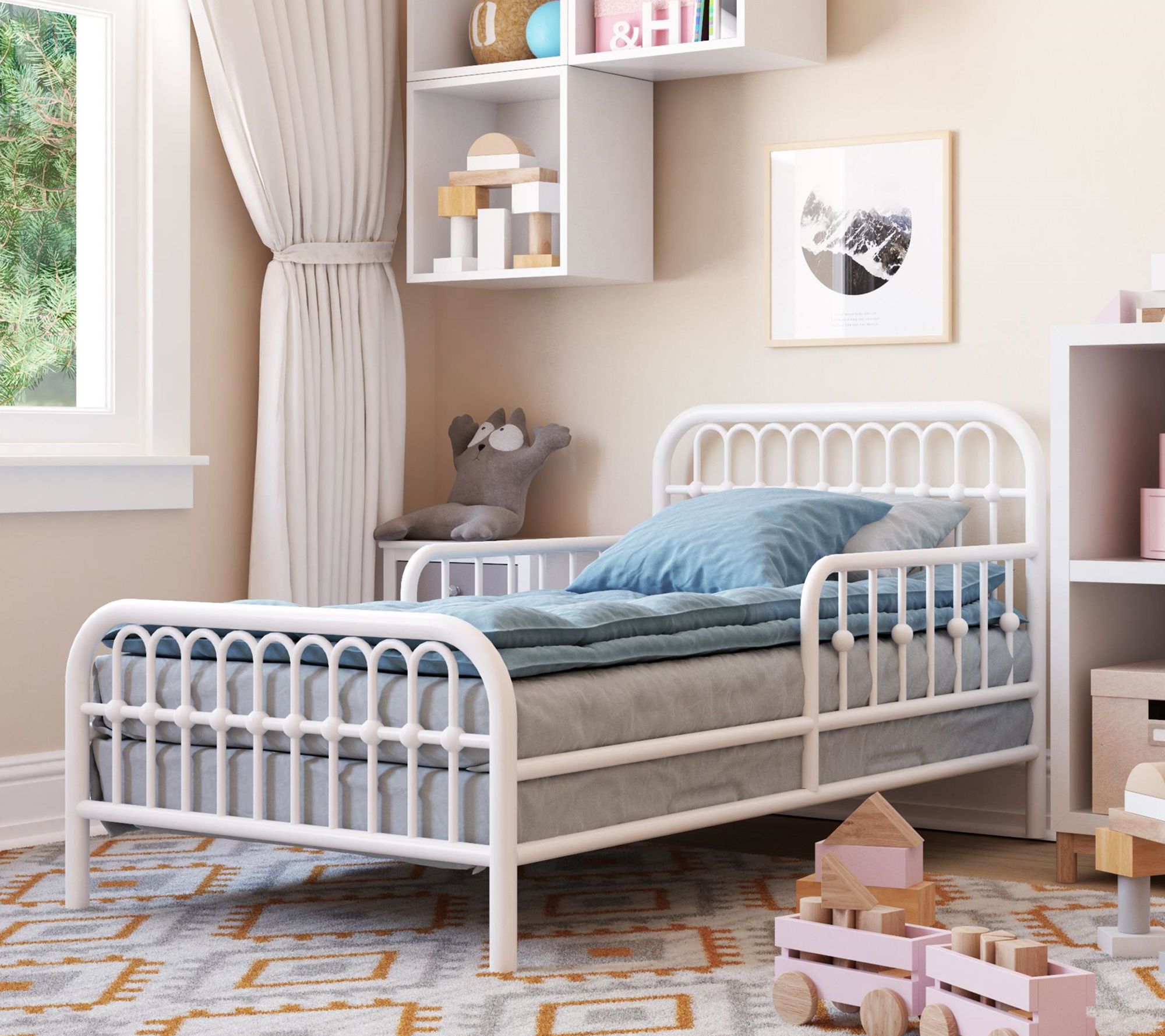 Inspired by classic wrought-iron furniture, this metal toddler bed brings storybook charm to your child's room while offering a safe and cozy space as they transition from crib to big-kid bed. The smooth white powder-coat finish and arched frame deliver timeless style that brightens up any bedtime routine. From Little Seeds.