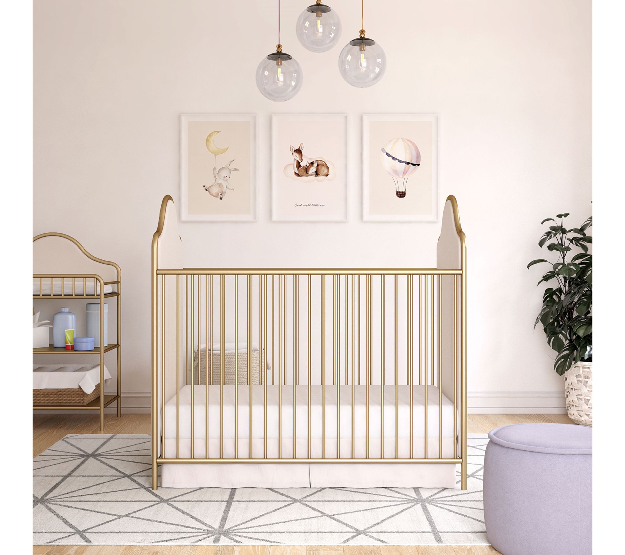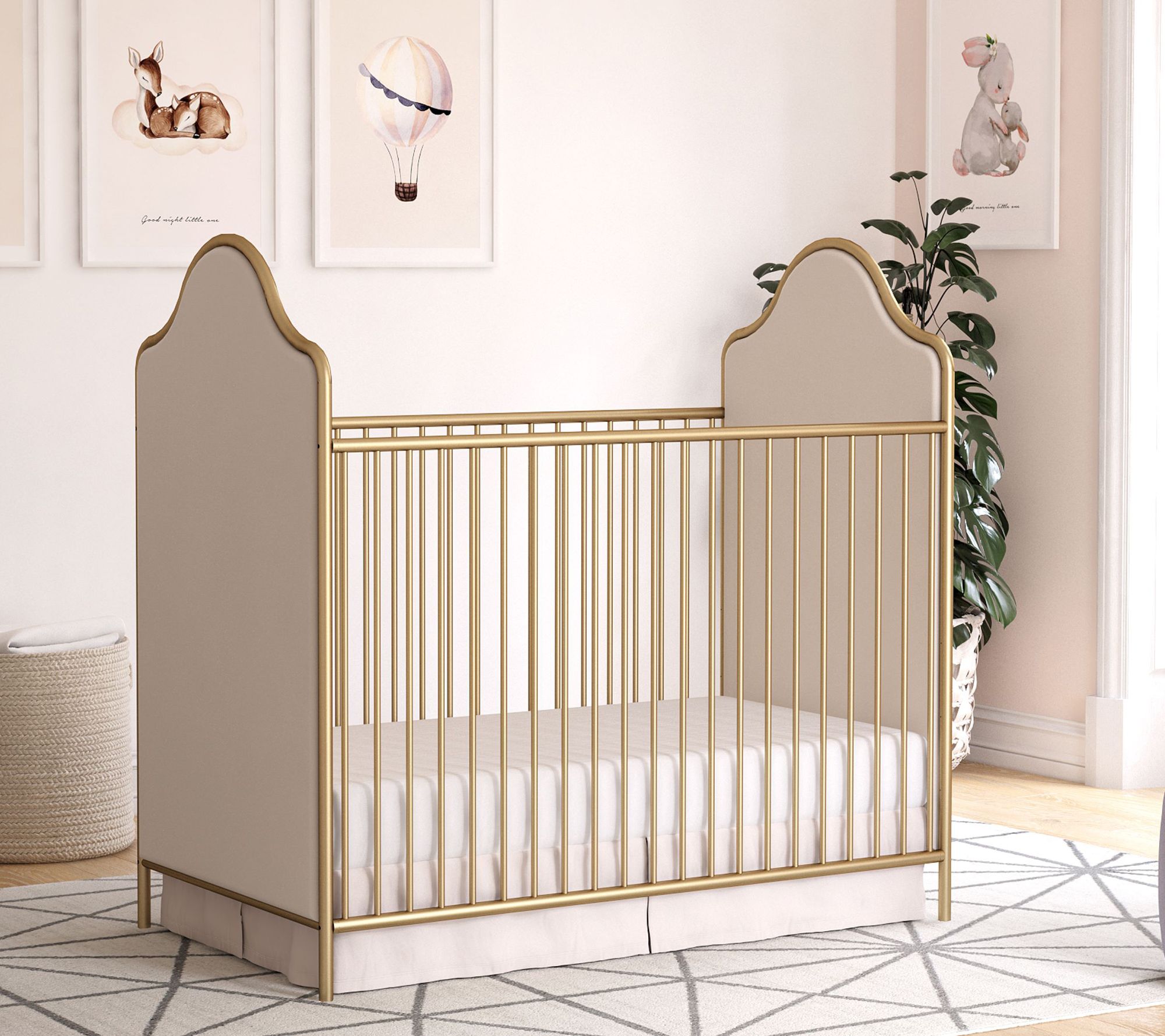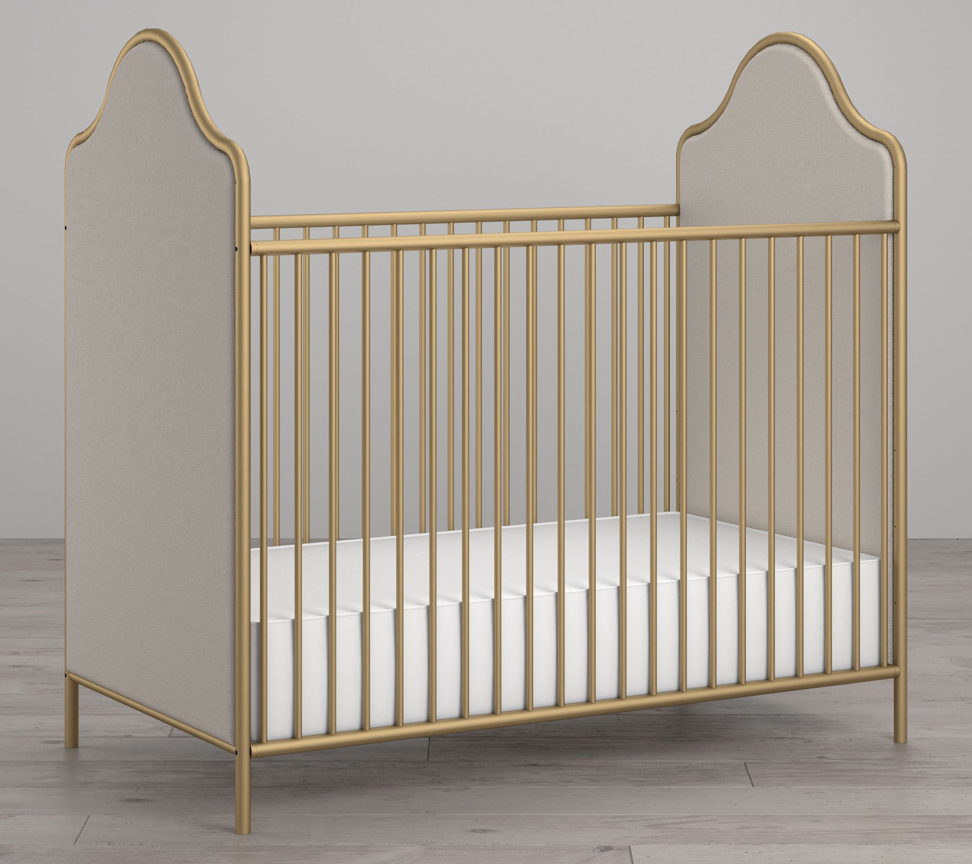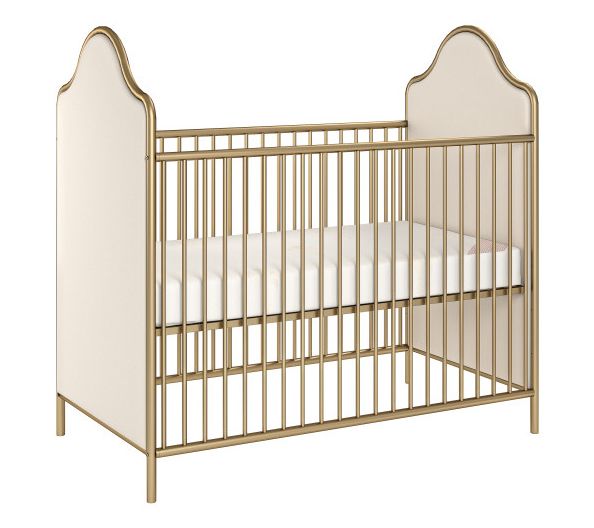 A stylish blend of modern design and timeless charm, this crib features beautifully upholstered curved side panels and an elegantly arched metal frame ready to grow with your little one. Adjustable heights allow you to easily reach your baby and continue using the crib as they grow, while the convertible design makes future transitions simple. From Little Seeds.