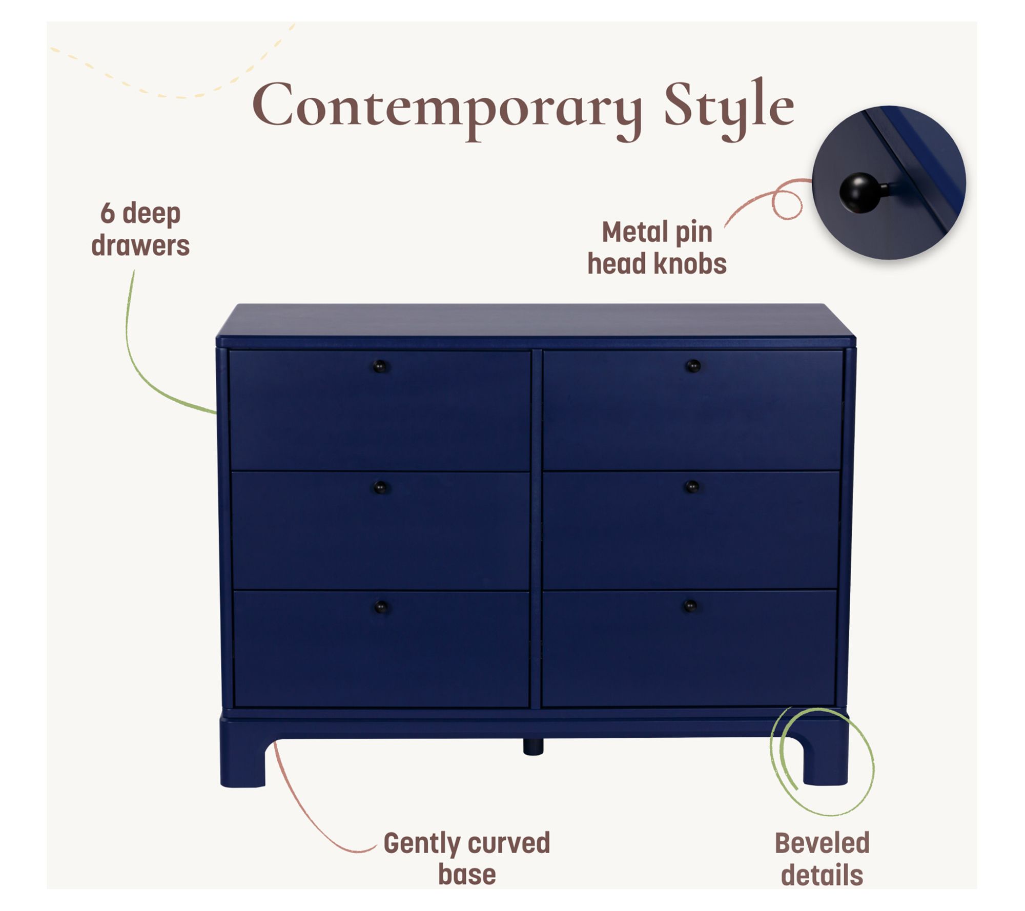 Refresh your child's room -- or any space that needs a touch of organization and style -- with the Little Seeds Posey Double Dresser. Part of the beloved Posey Collection, this modern dresser blends function and charm in a design that features gently curved legs, a chicly contoured base, and metal pin head knobs for just the right hint of sophistication. From Little Seeds.