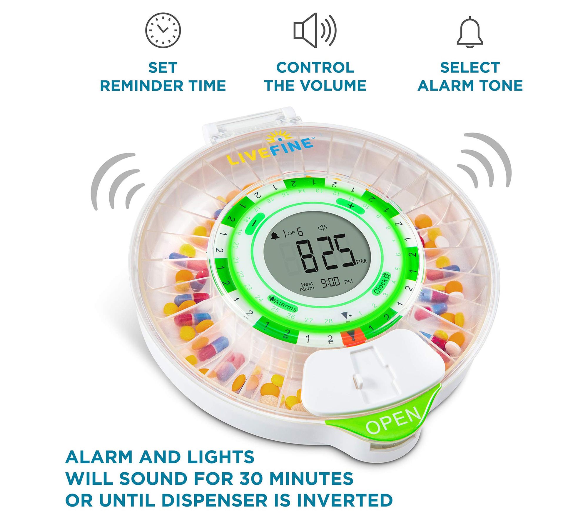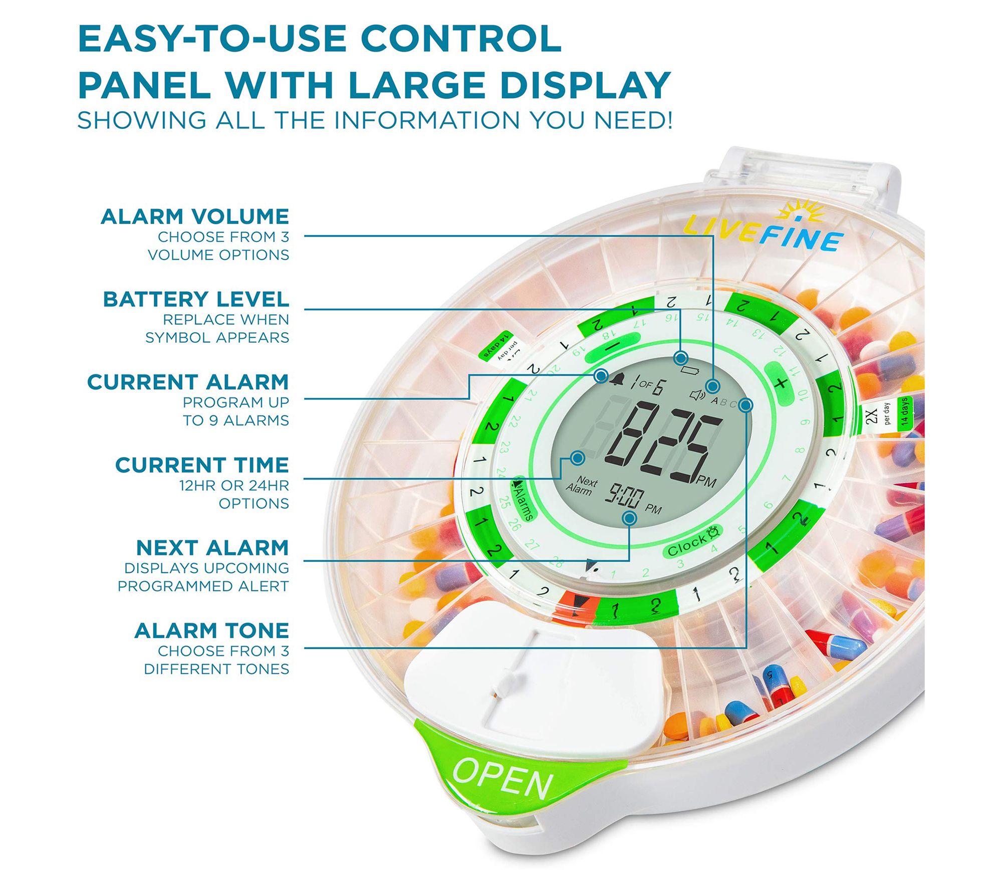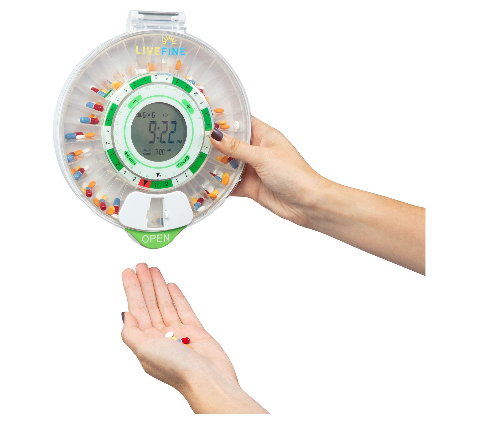 Living a healthy life doesn't need to be difficult! This handy automatic pill dispenser with LCD display helps you stay in control of your medication and vitamin routine. Load up to 28 days of pills and easily set up to nine different dosage times for specific reminders. From LiveFine.