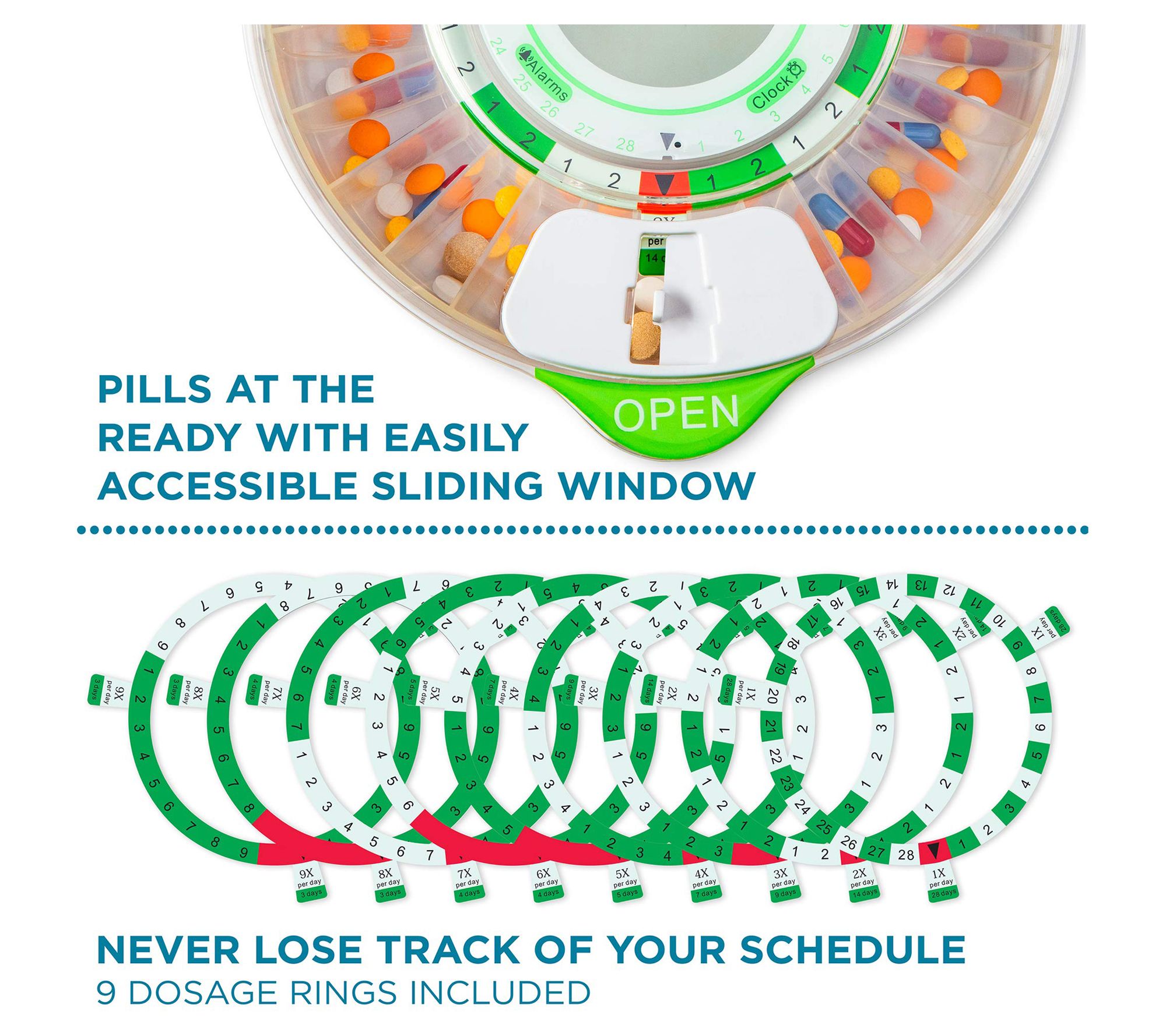 • Includes automatic pill dispenser with clear lid, nine dosage rings, locking key, four AA batteries, and user guide