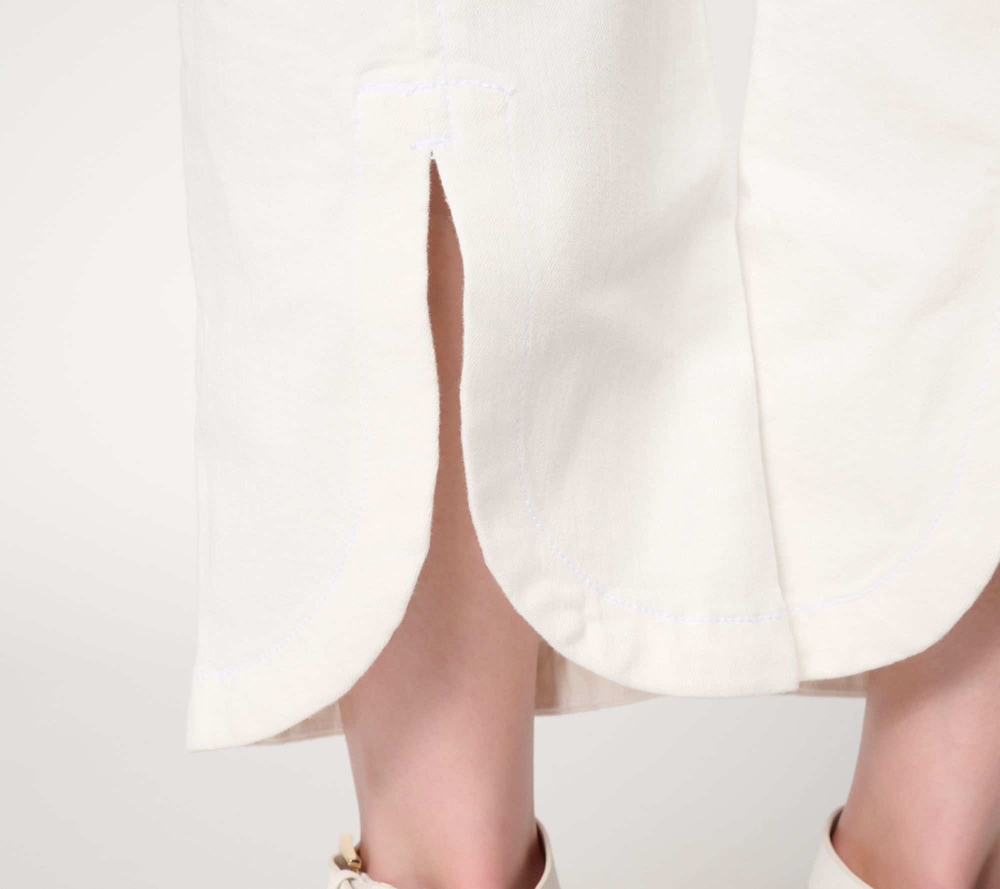 Features: five-pocket styling details, elastic set-in waistband with loops, cropped, kick flare, tulip back slit